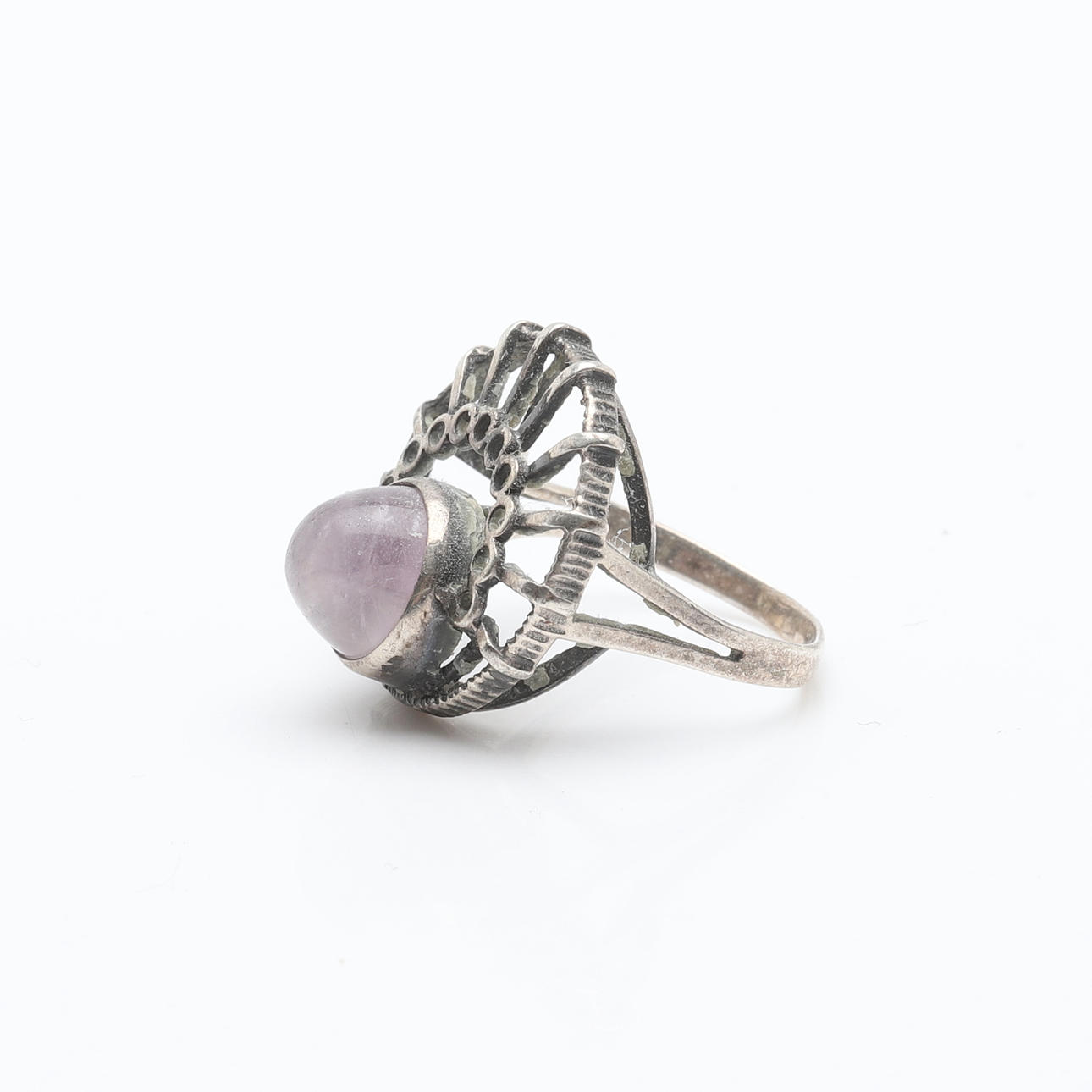 Brocher, højde ca. 5-6 cm. Ring, diameter ca. 2 cm. Armbånd, Bismarck armbånd, længde ca. 21 cm.