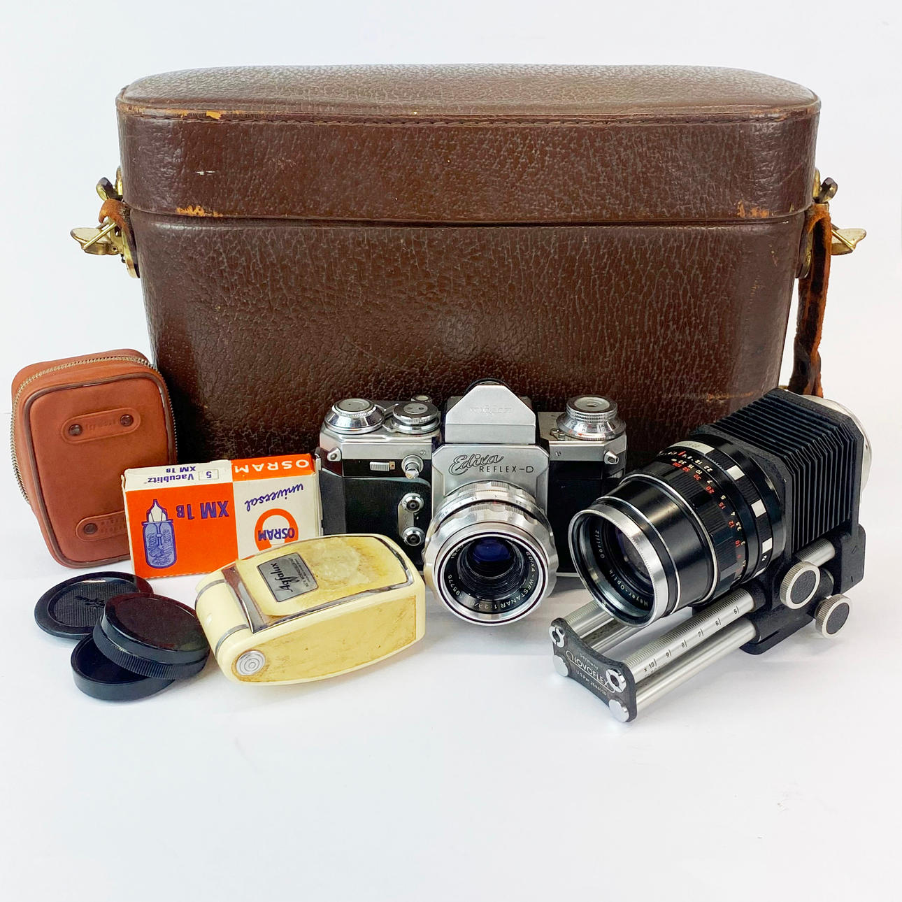 Et kabinettet Wirgin Edixa reflekskamera med enkelt objektiv med Novoflex justerbar linse med bælge.