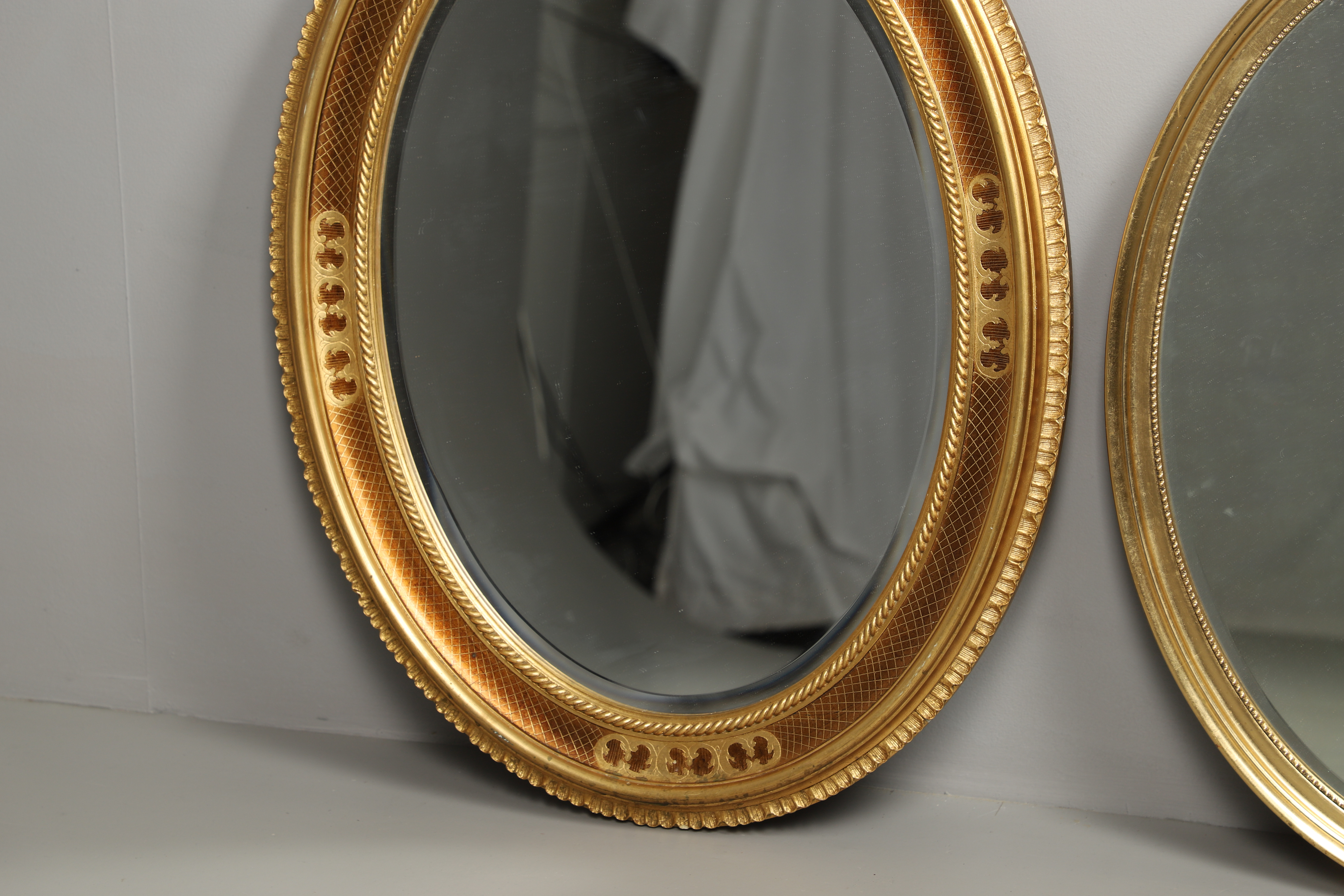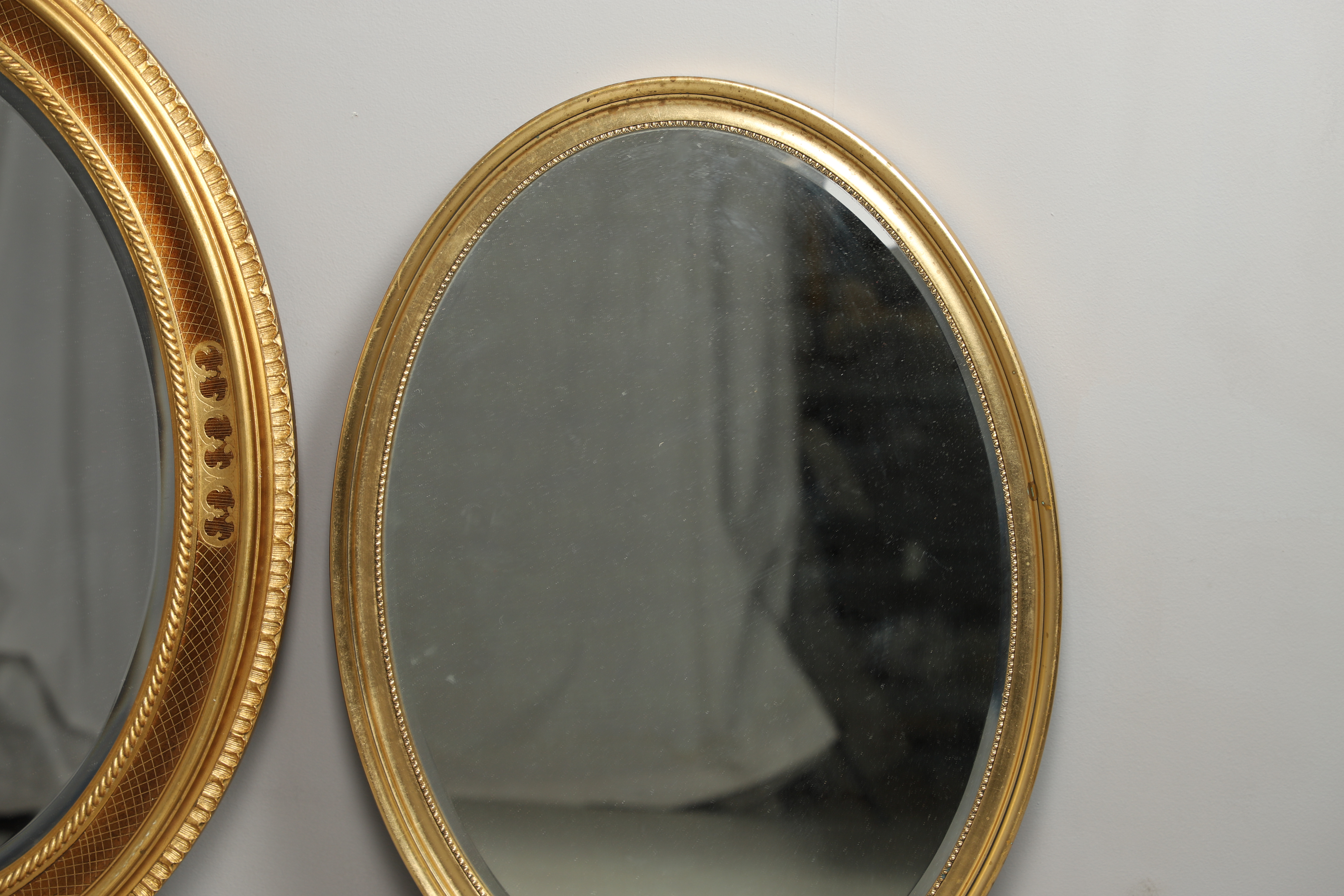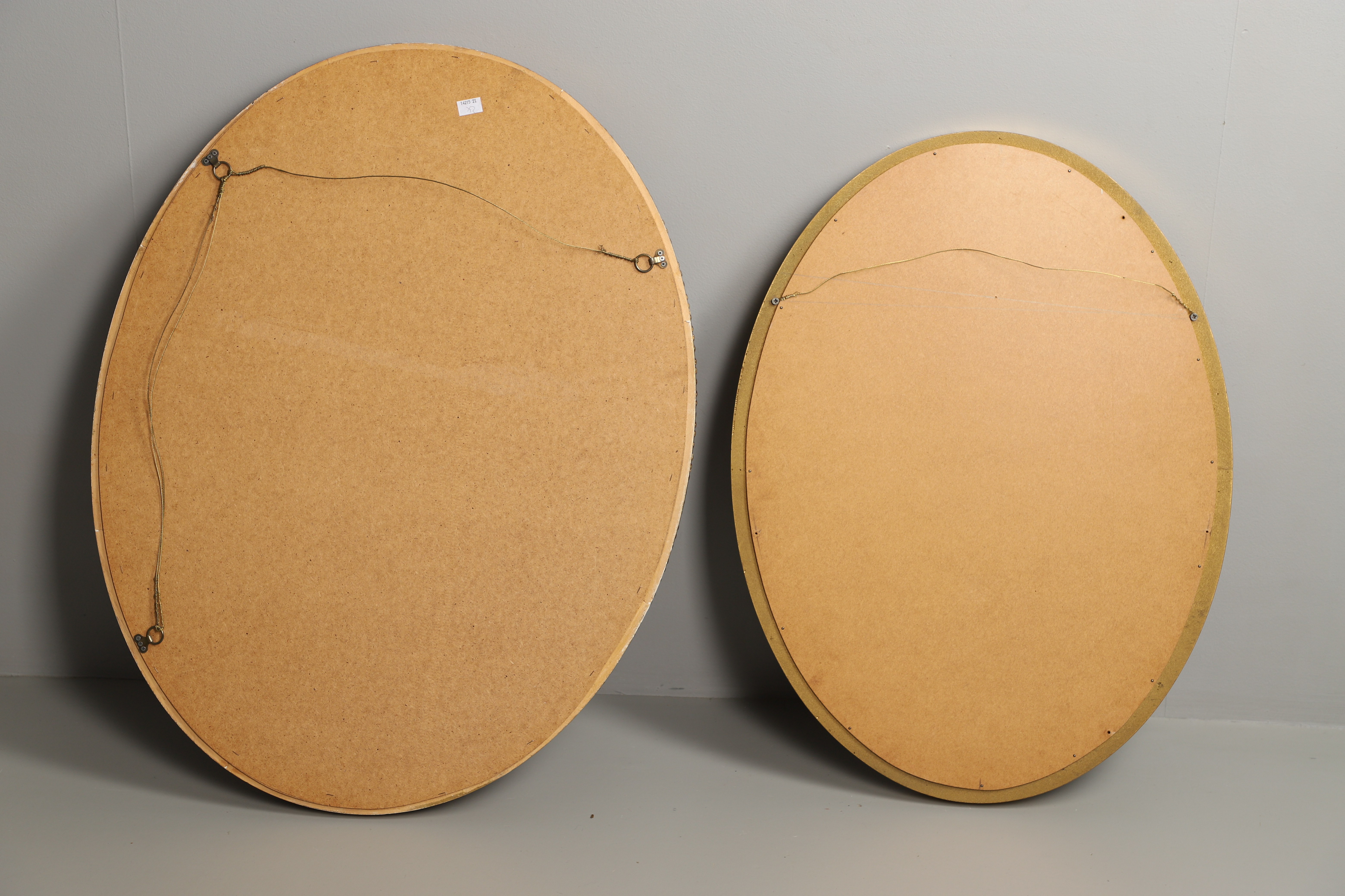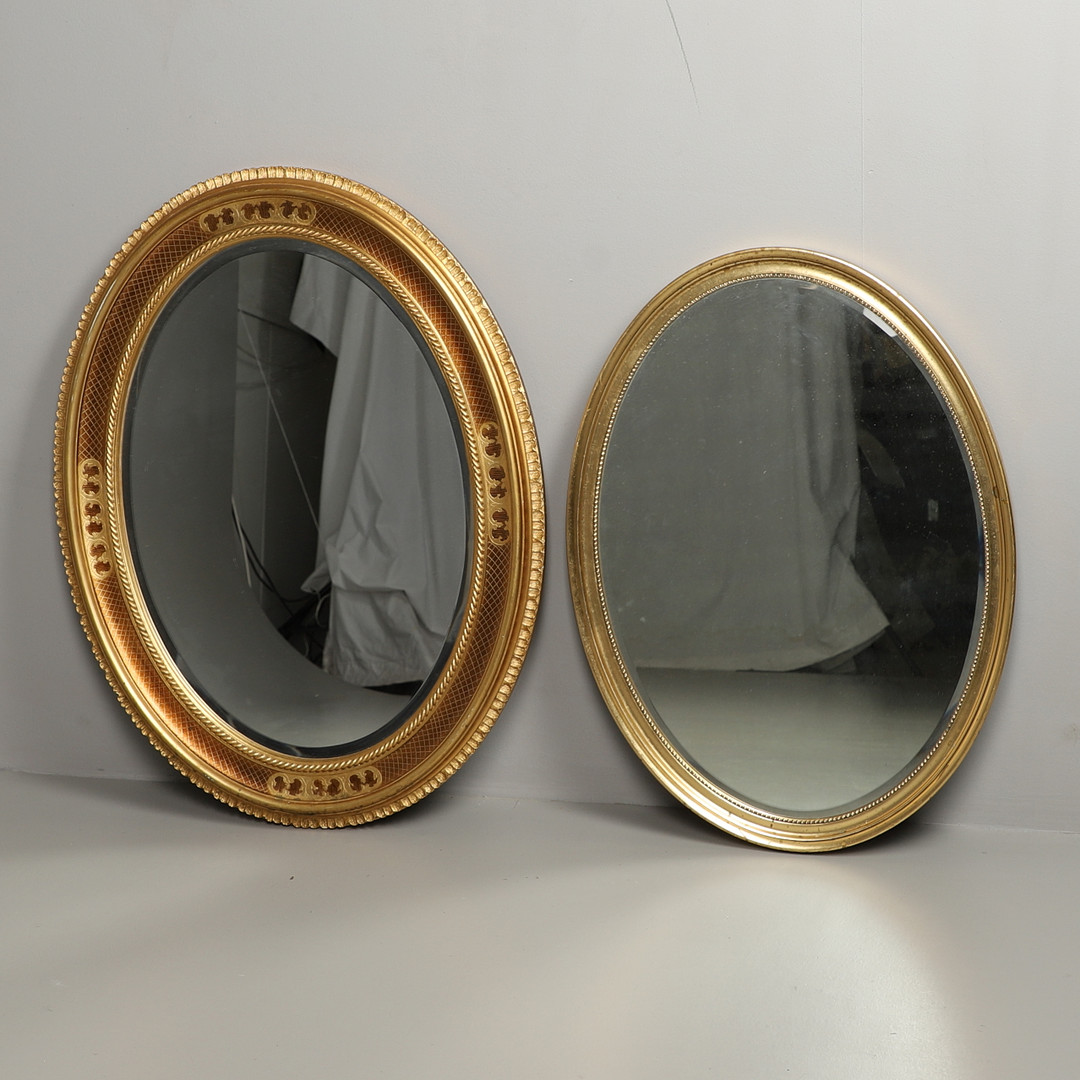 3123815. TO MODERNE OVALE FORGYLDTE VÆGSPEJLE.