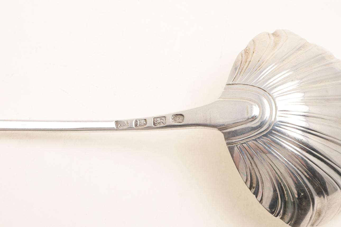 med en riflet skål, paraferet af John Lampfert, London 1766; 13" (33 cm) lang; 3,8 ozt.