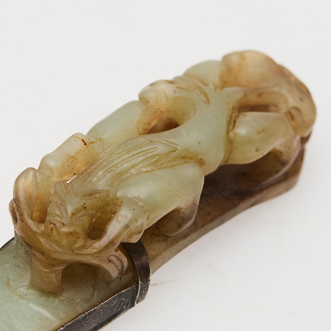 Aldersanpassede tegn på brug og gnidning, delvise tegn på oxidation i sølv og snavs i jade.