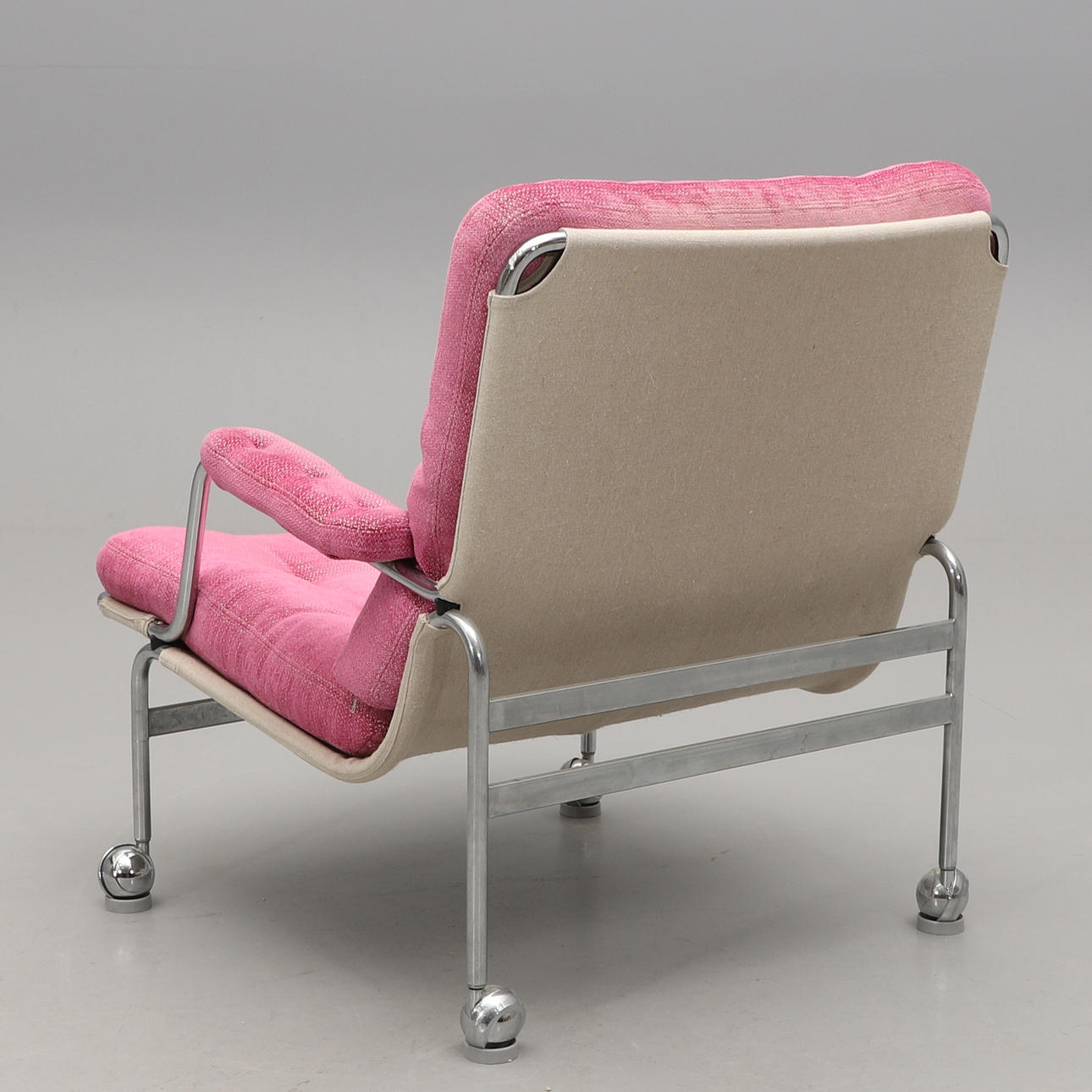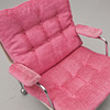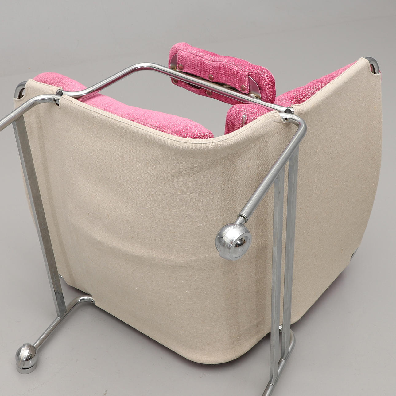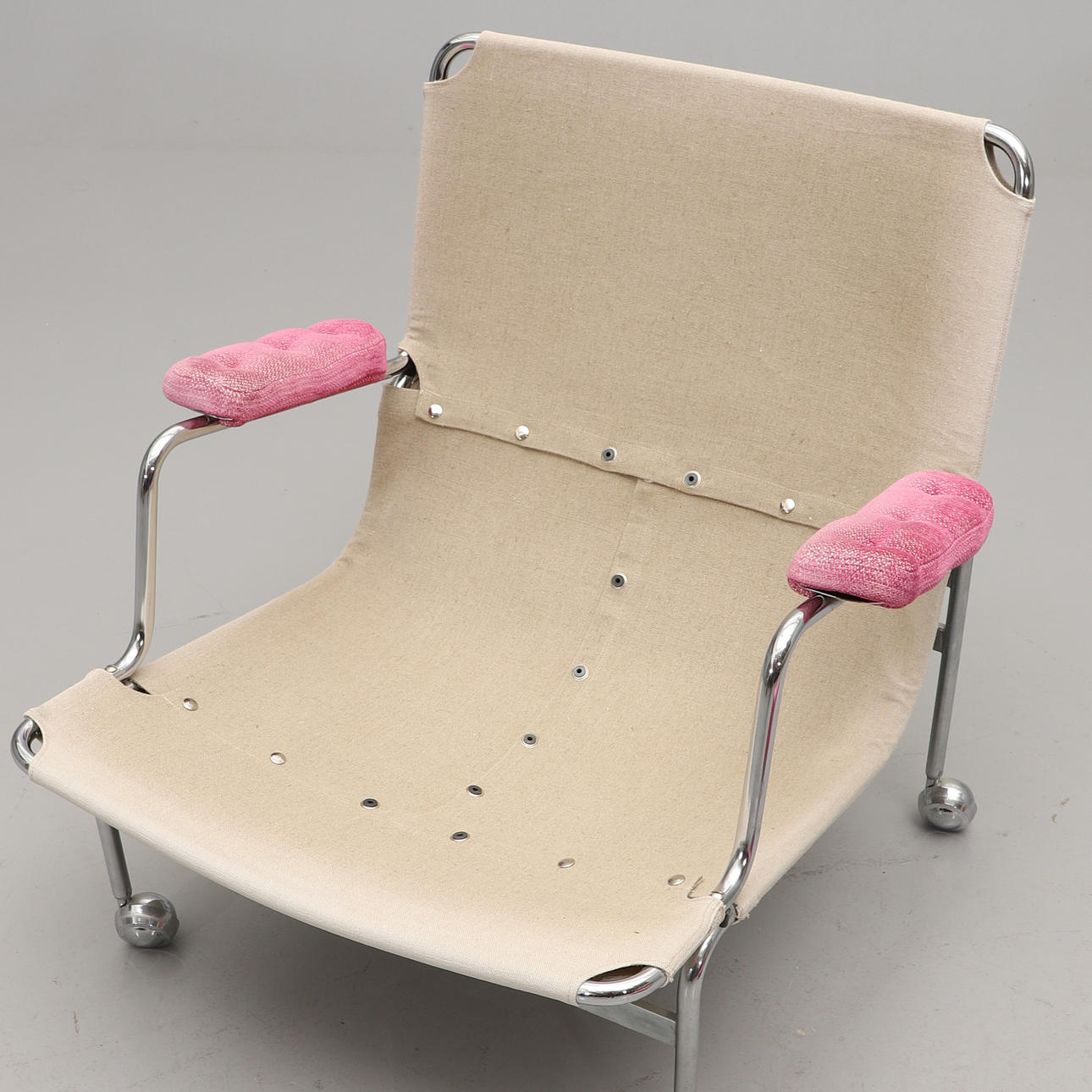 Forkromet ramme med loddeplumer dækket med lyserødt stof. Sædehøjde ca. 35, højde 80, bredde 76 cm. Der medfølger 4 gulvbelægninger til trillebøre.