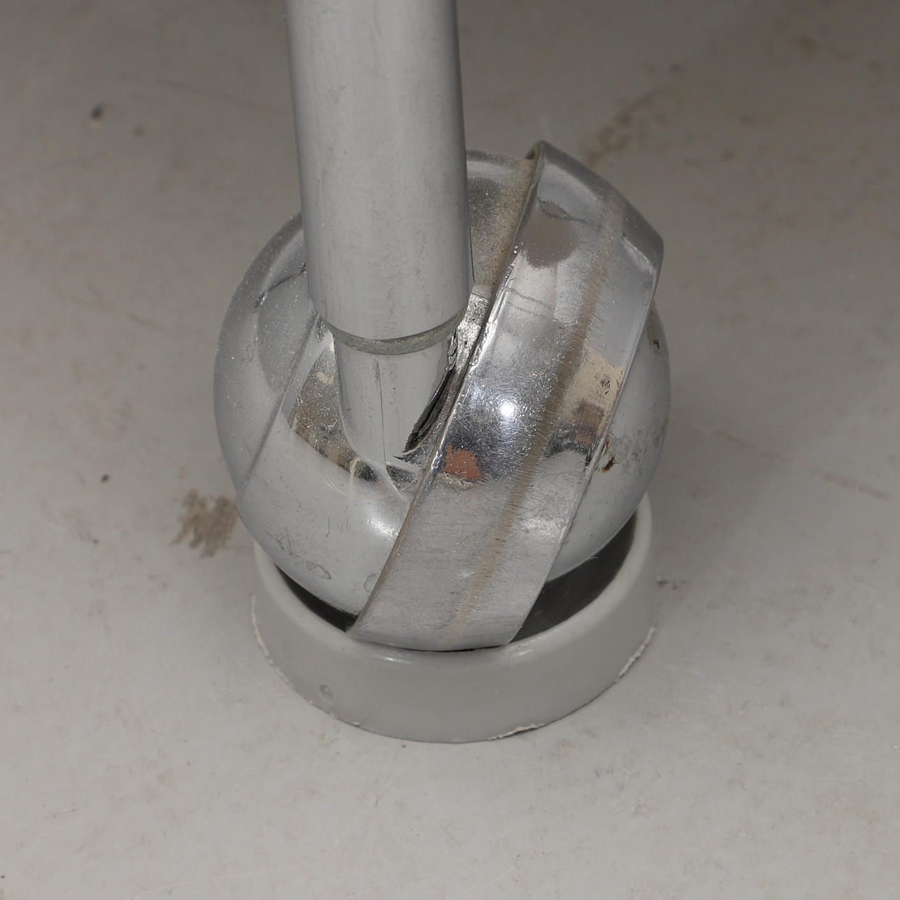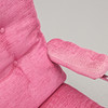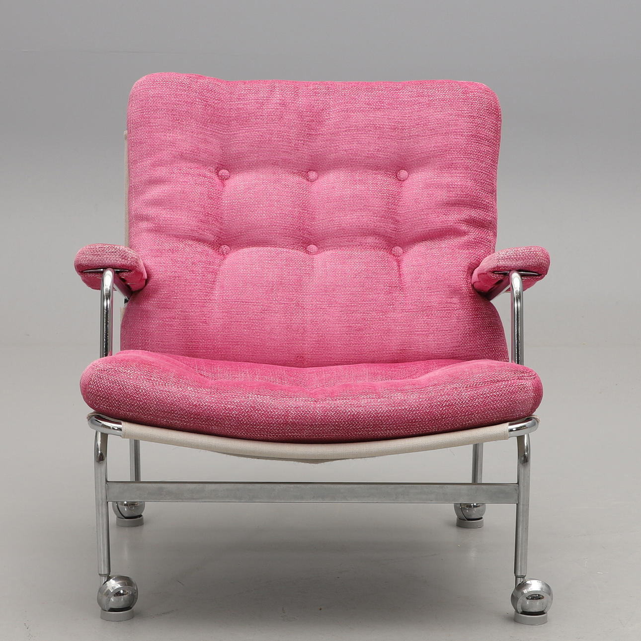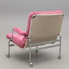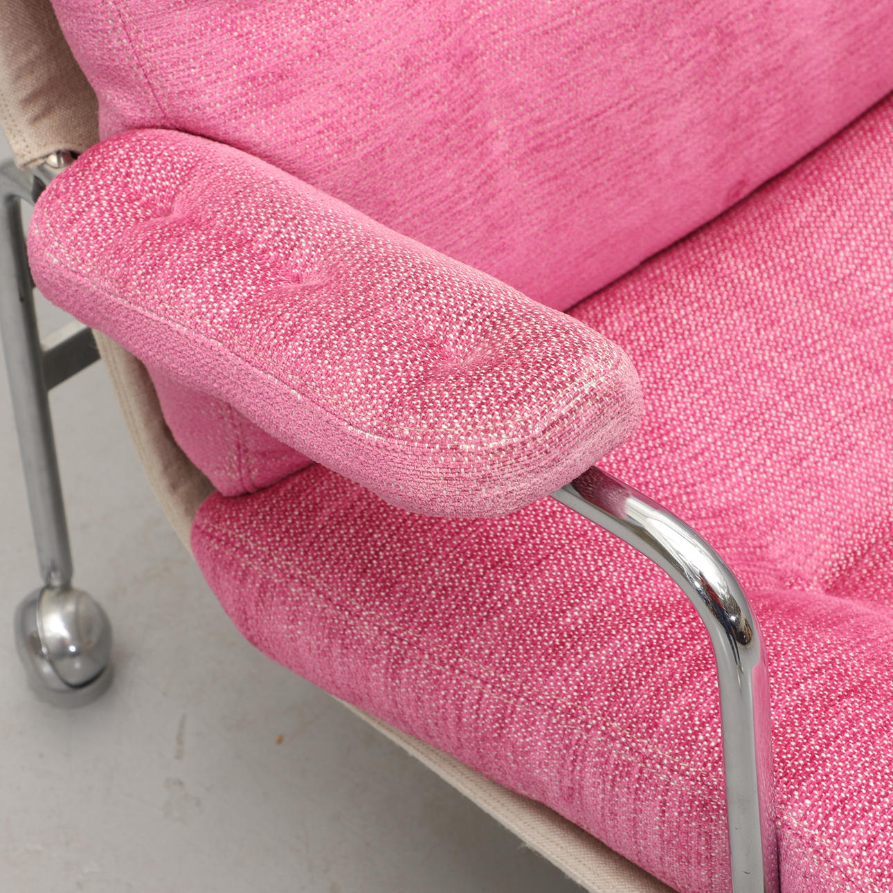 Forkromet ramme med loddeplumer dækket med lyserødt stof. Sædehøjde ca. 35, højde 80, bredde 76 cm. Der medfølger 4 gulvbelægninger til trillebøre.