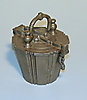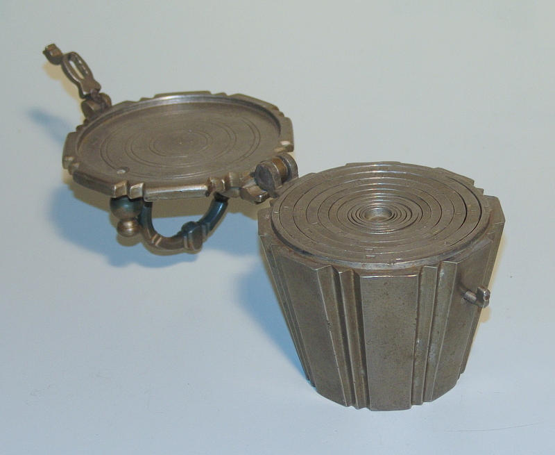 13-delt tin krus vægt med div Kalibreringsmærker fra 1819 ff. Afdækning med hank og spænde, konisk væg med indhakket dekoration, ca. 9 kg tung, den mindste vægt i midten mangler, hver med saksiske tinmærker og uafklarede. Makermærke, 15 x 15 cm.