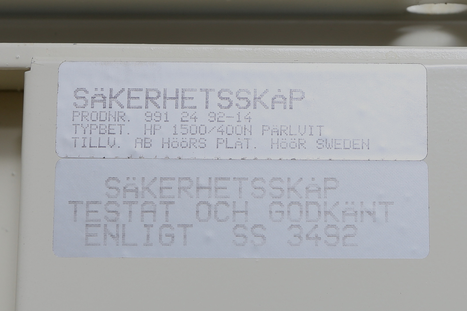 3145371. SIKKERHEDSSKAB, SS 3492, AB Höörs Platt.