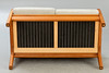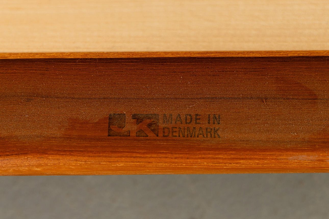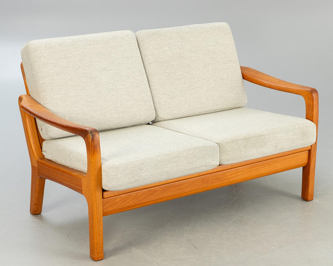 Massiv teaktræ. Løse polstrede hynder med lysegrå, meleret uldstof. Mærket med stempel.