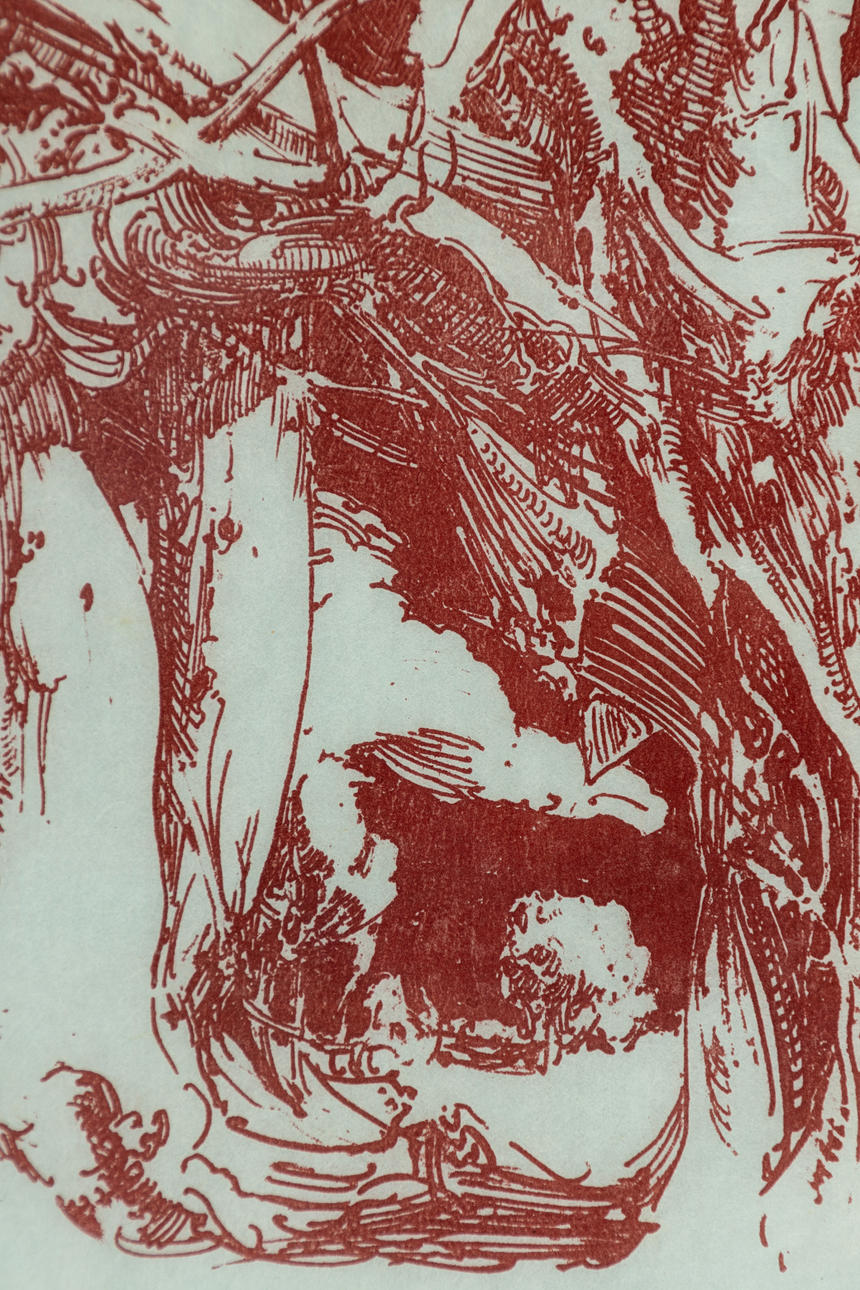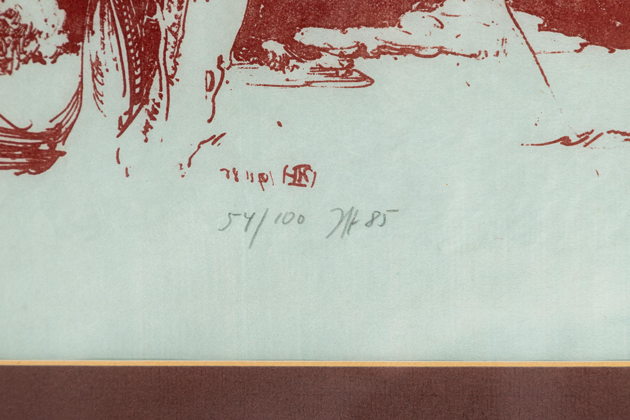 Horst Janssen (1929-1995), Slægtninge Griffin, litografi i rødt, 1985, signeret, dateret og nummereret, signeret igen i sten, dateret og med titlen spejlvendt, ca. 24 x 52 cm, indrammet bag passepartout og glas, med ramme ca. 57 x 73 cm.