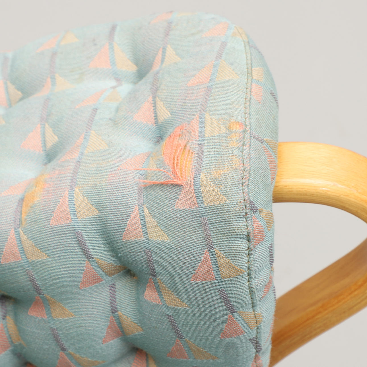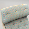 Buetræ i bøg, undersæde i beige lærred. Polstret sæde, nakkepude og sider betrukket med mønstret stof. Bredde 88, sædehøjde ca. 38 cm.