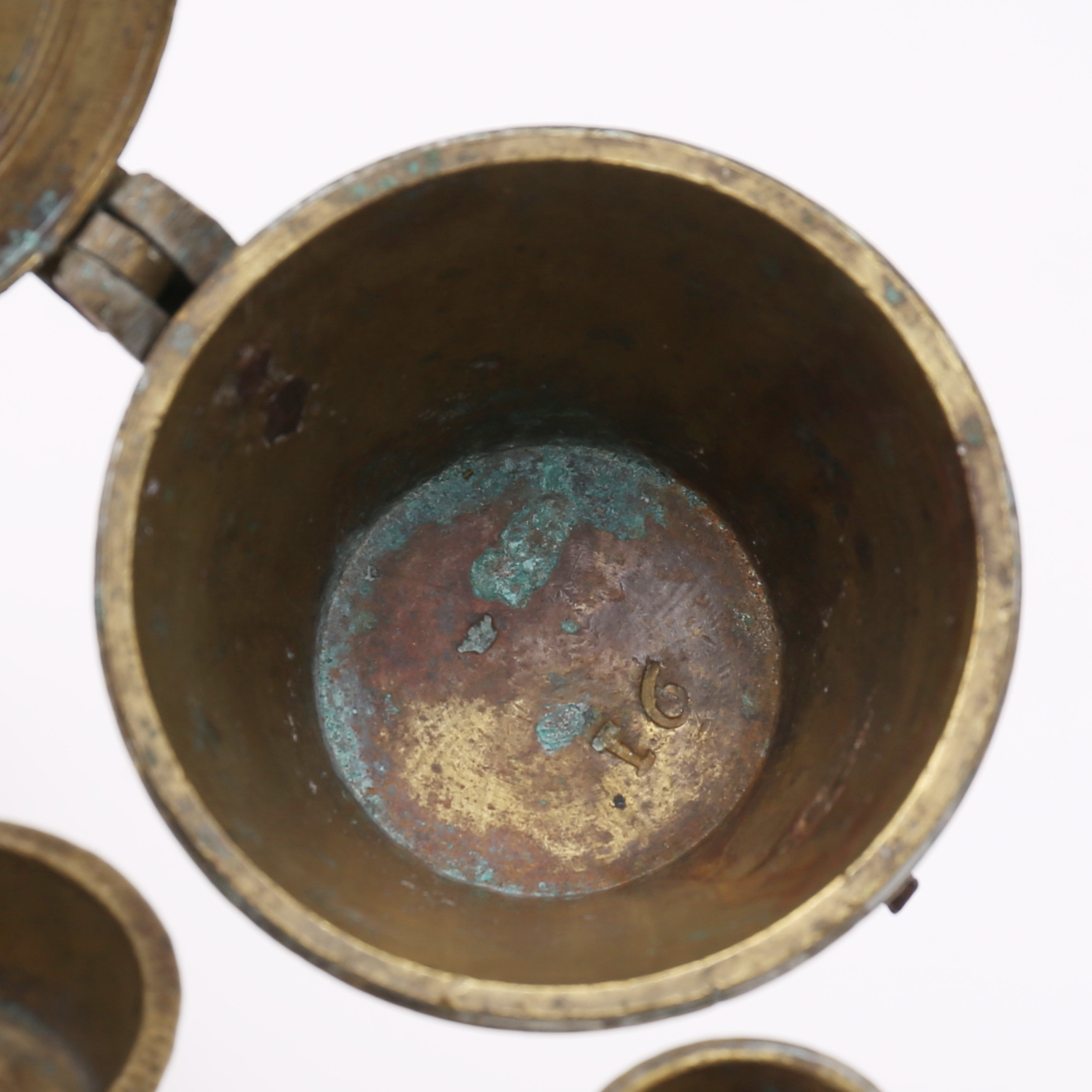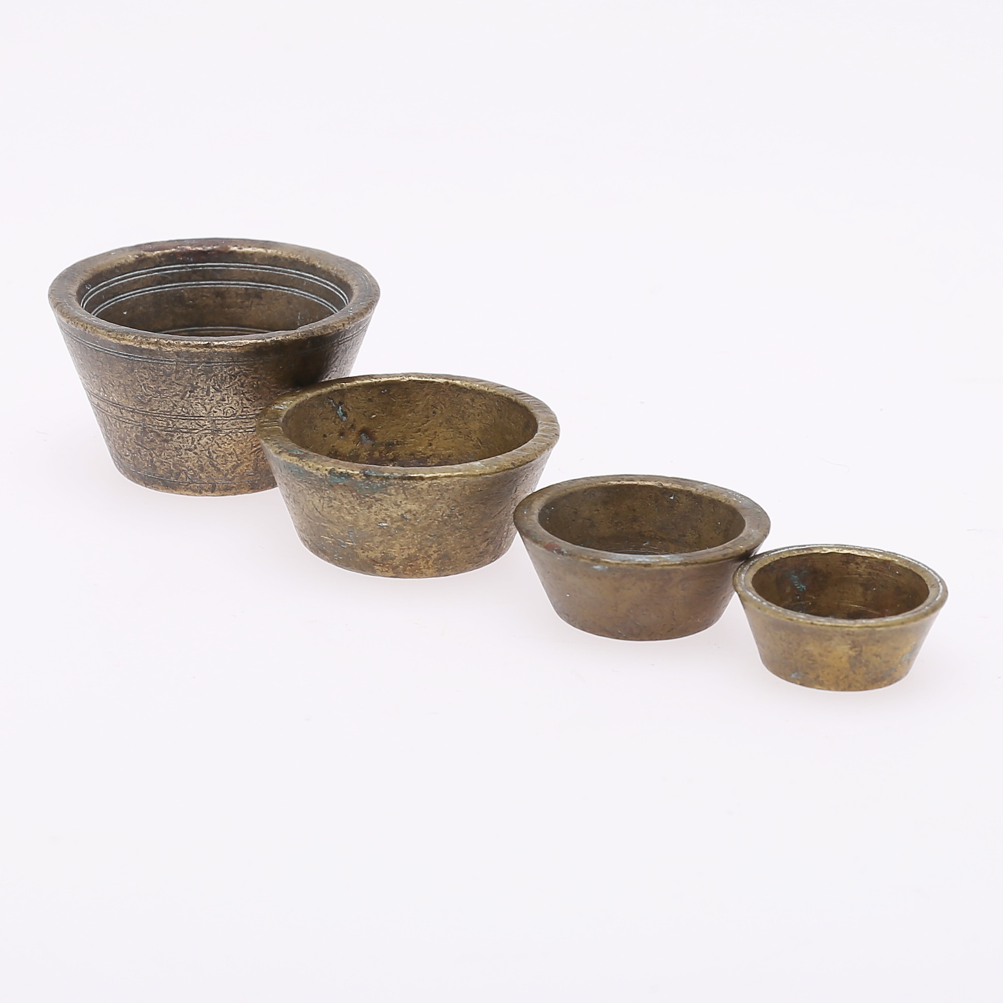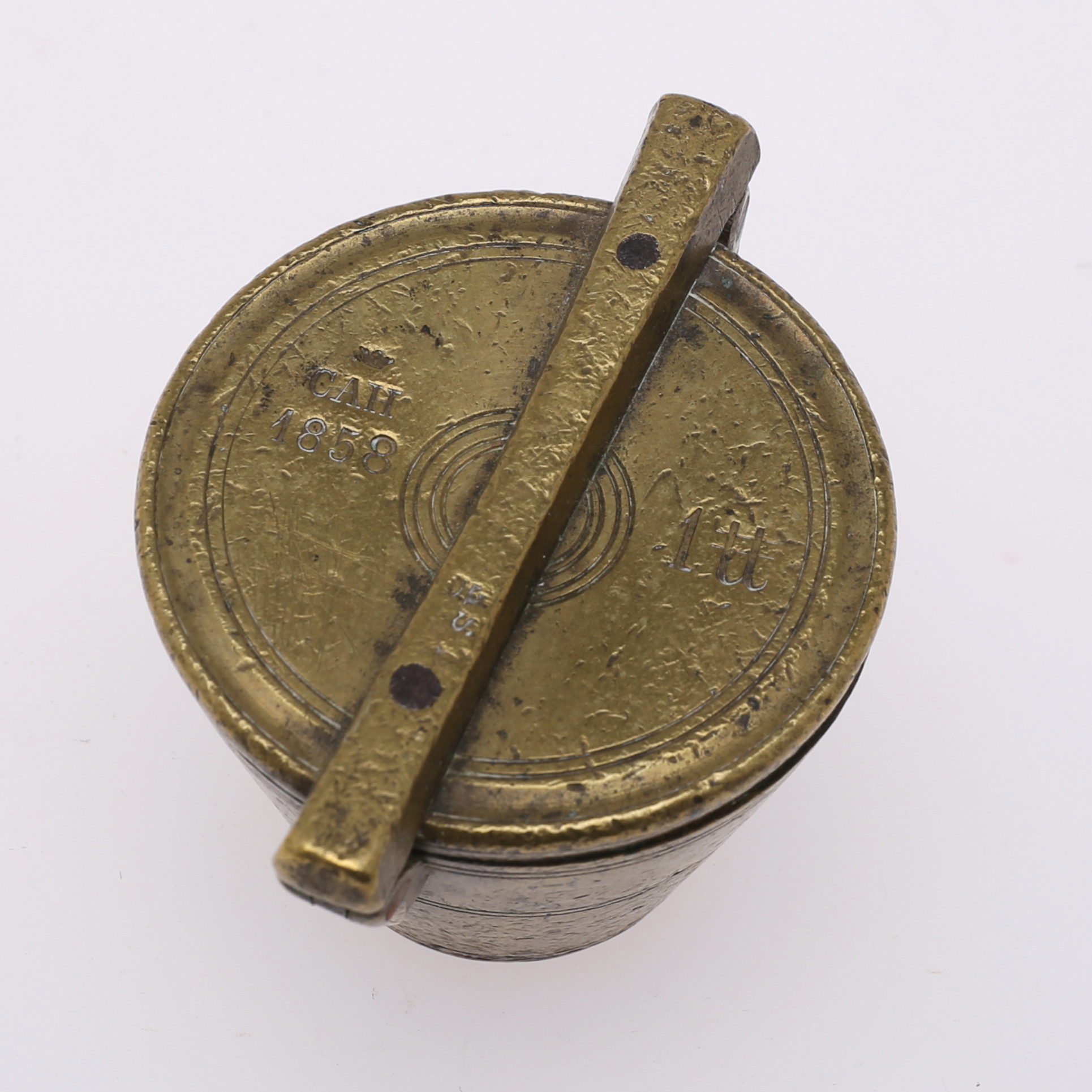 3156578. VÆGTMÅL, 5 stk., messing, kronet 1858.