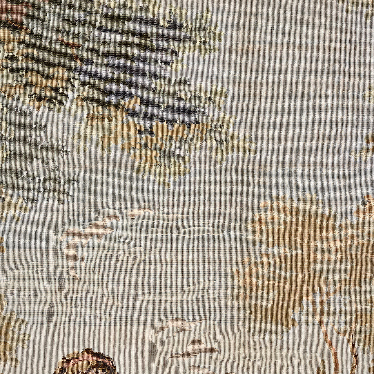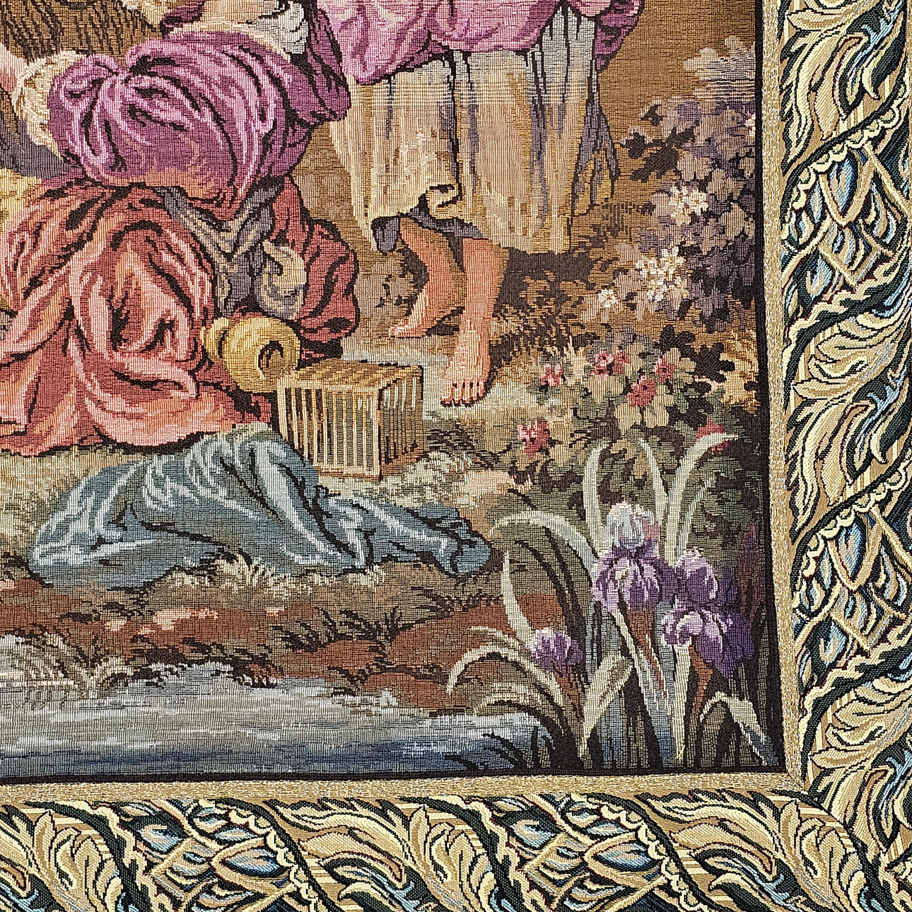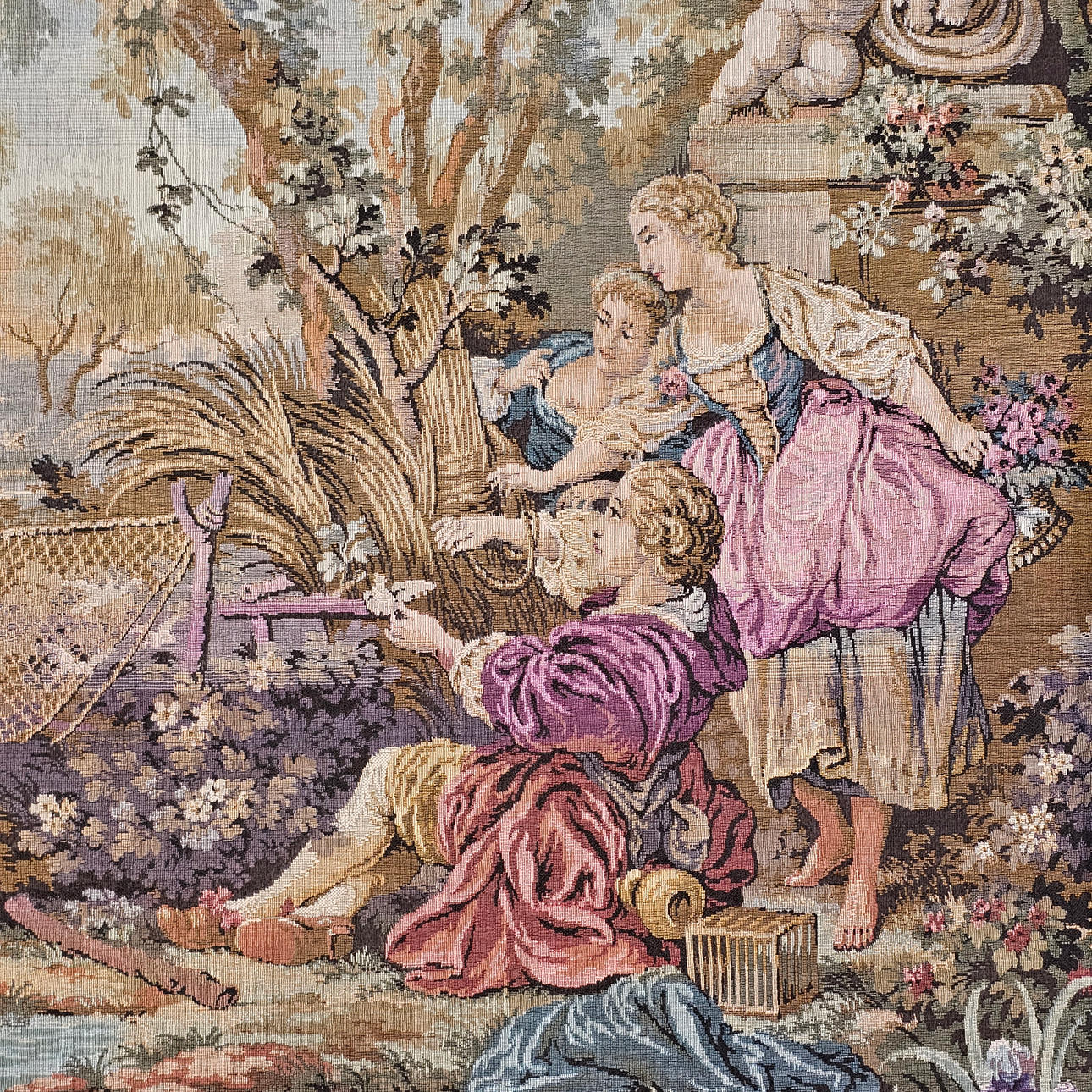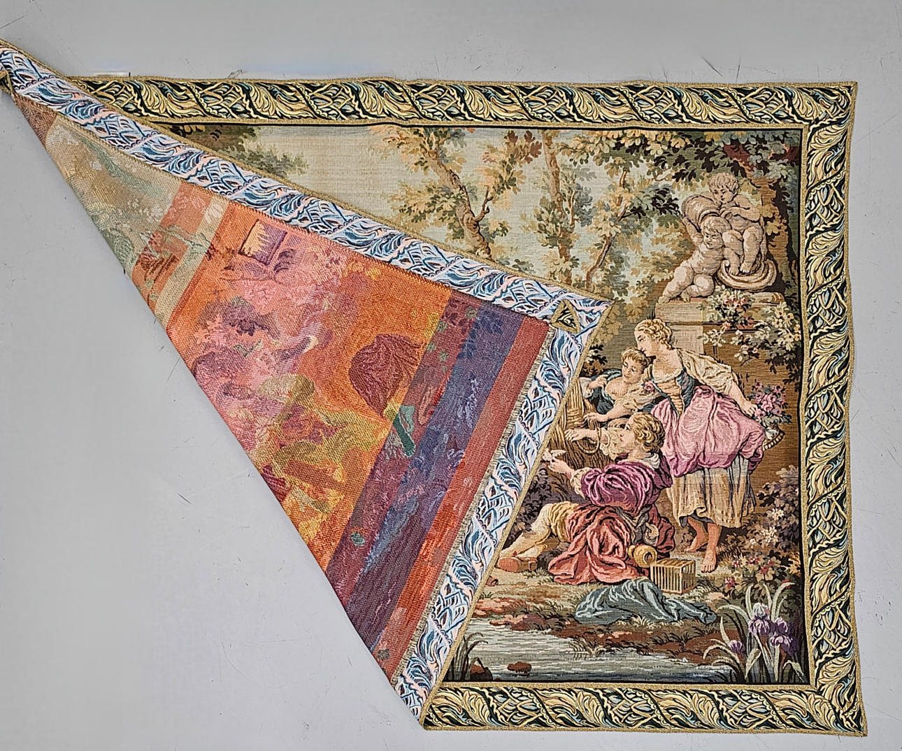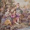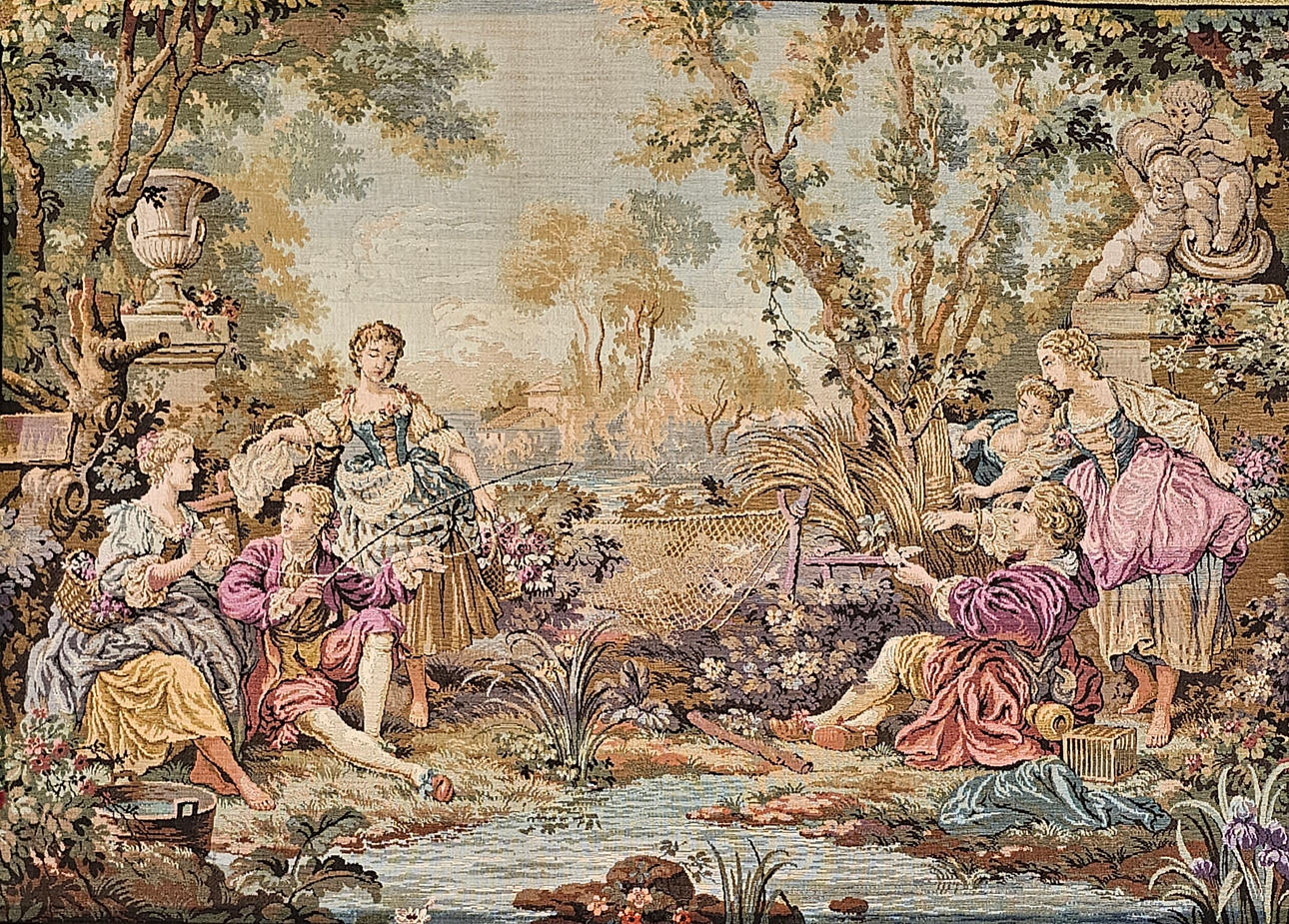 Maskinfremstillet gobelin med en romantisk scene i fransk stil.