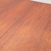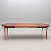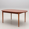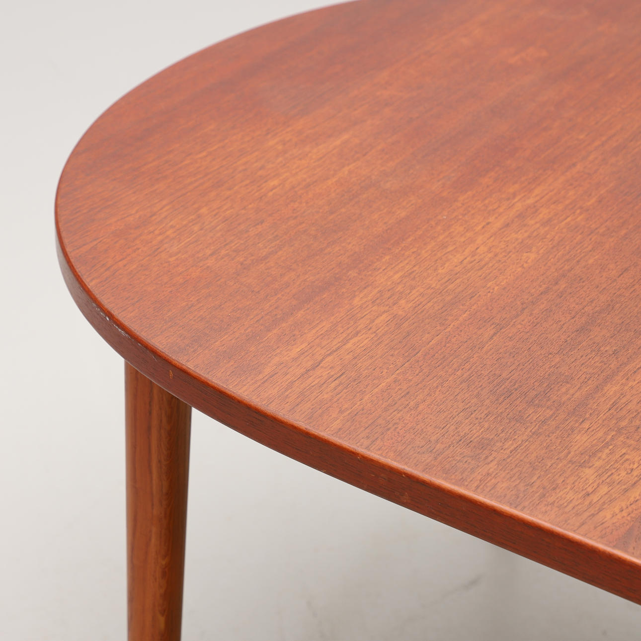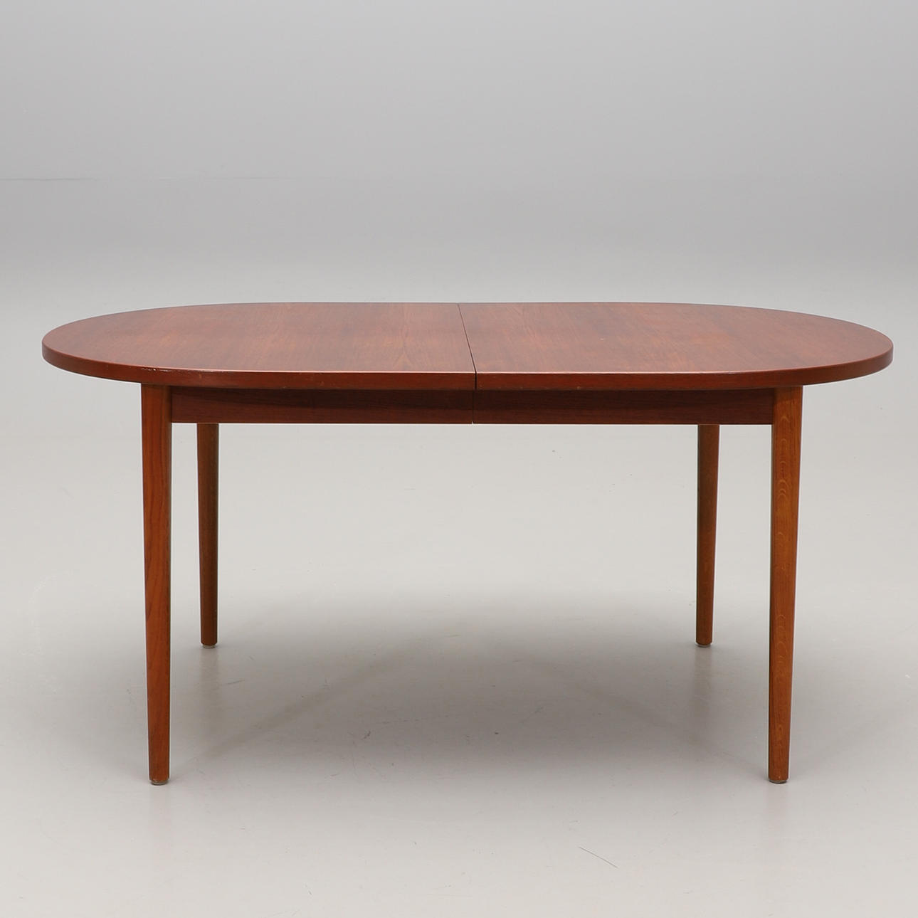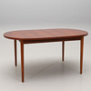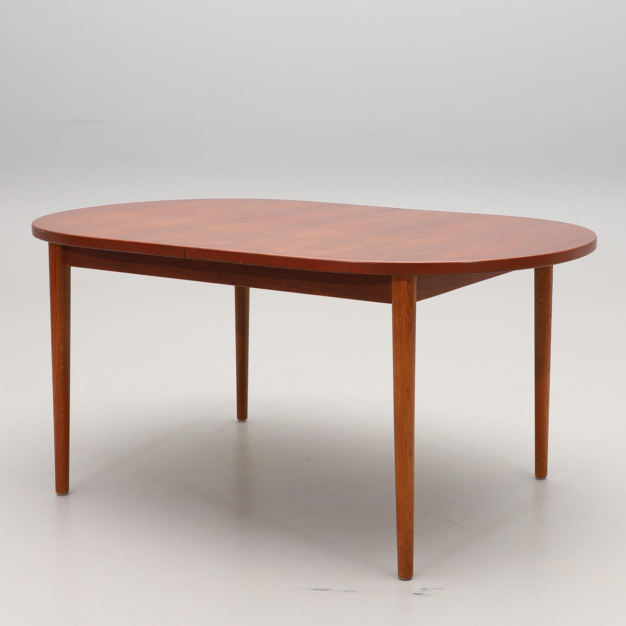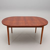 Teak og eg. Elliptisk plade i teak, to indsatser under 55 cm skiven. Drejede ben i eg. Længde 155, bredde 100, højde 73 cm.