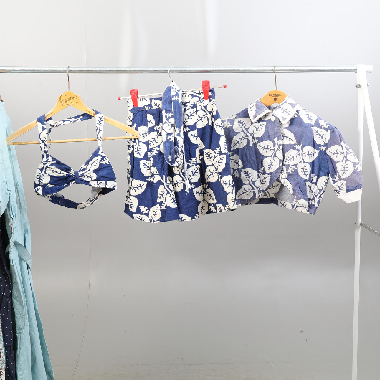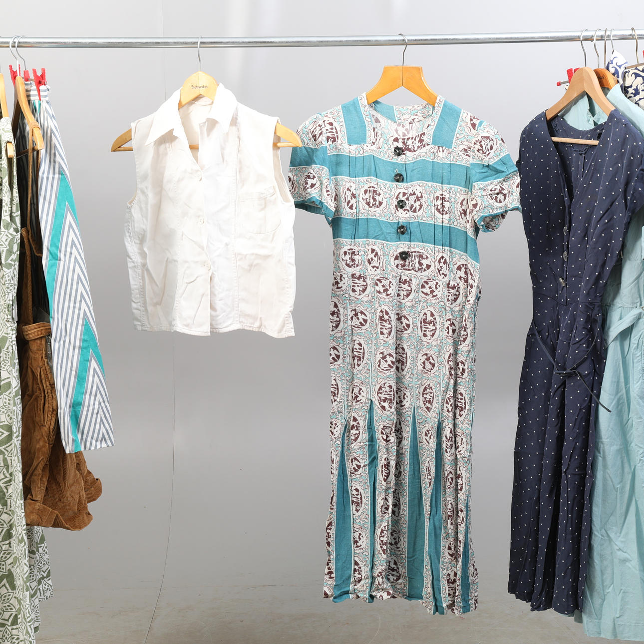 Et parti blandede tøj fra omkring 1940-60. Kjoler, nederdele, bluse, bolero, top, shorts osv. Størrelse ca 36-38.
