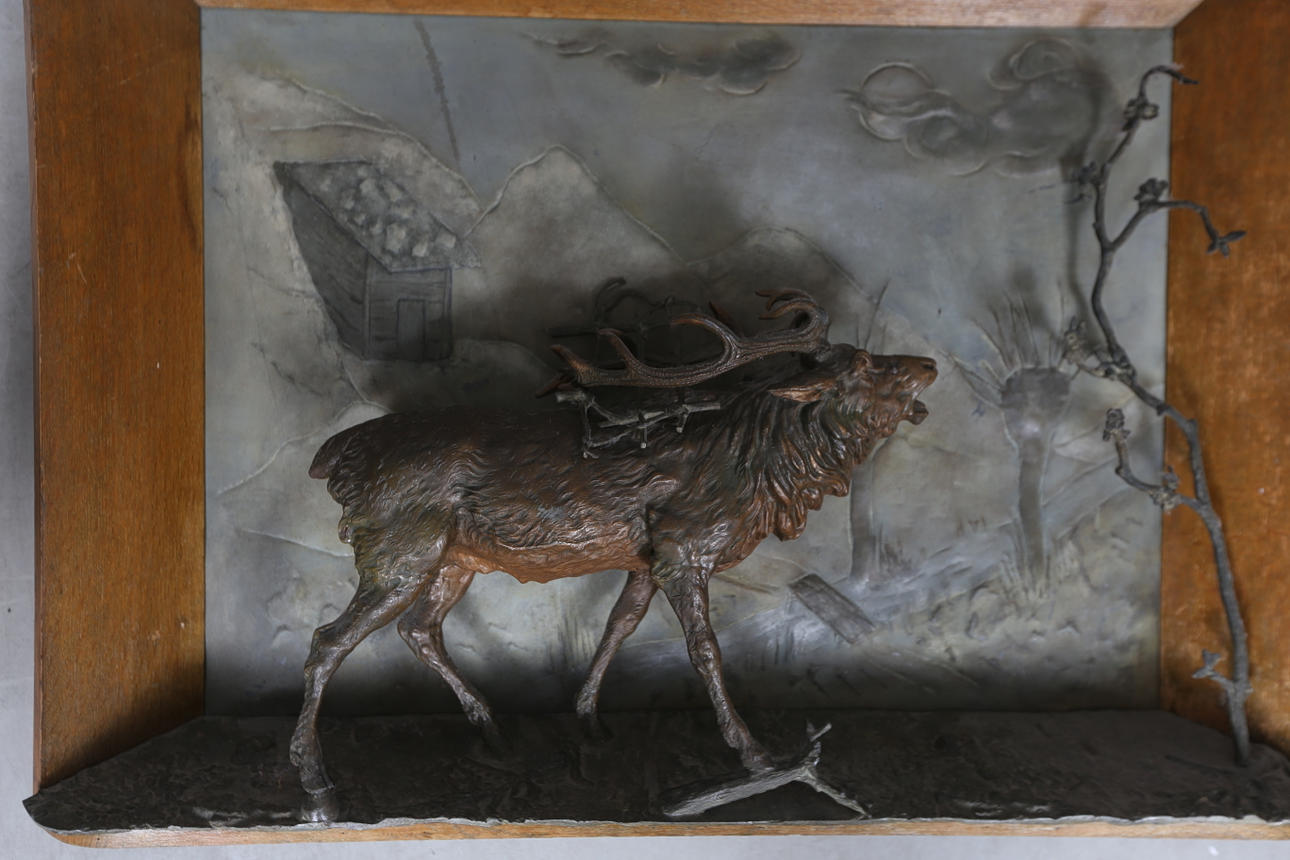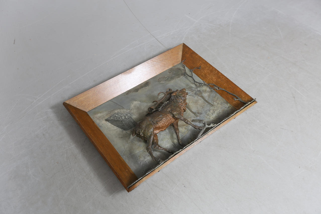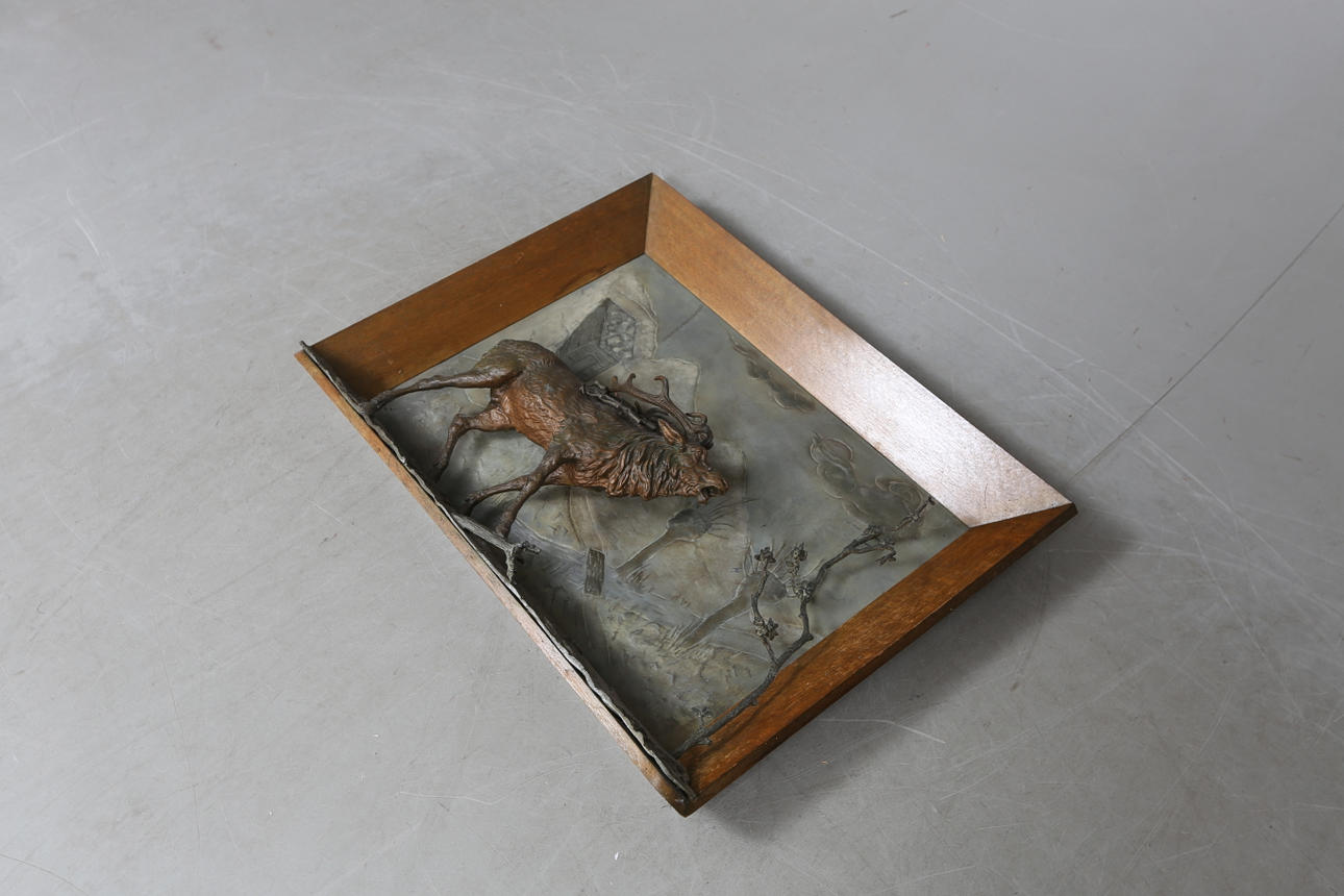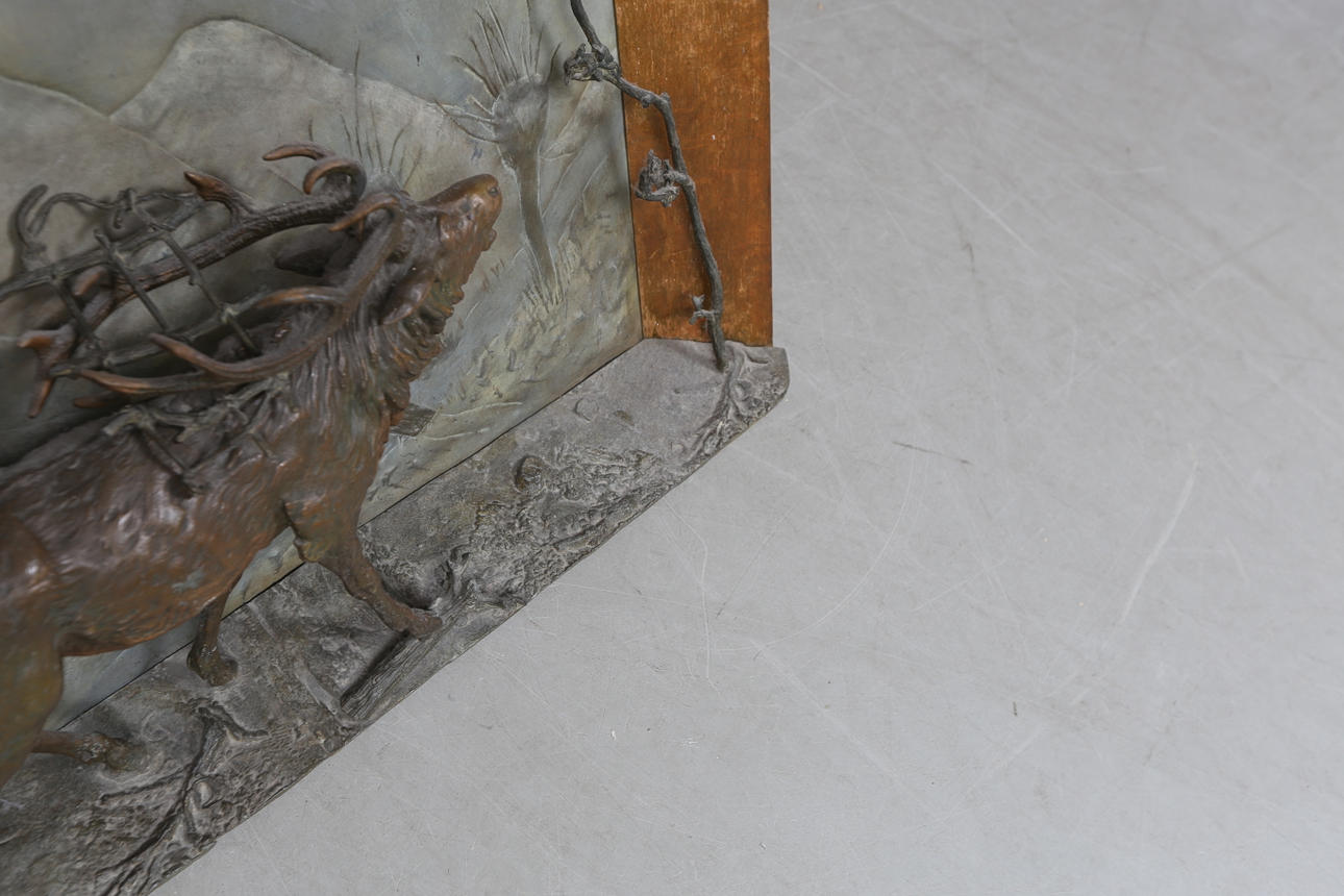 3189261. MALERI, kronhjort, metalplade og eg, omkring 1900.