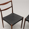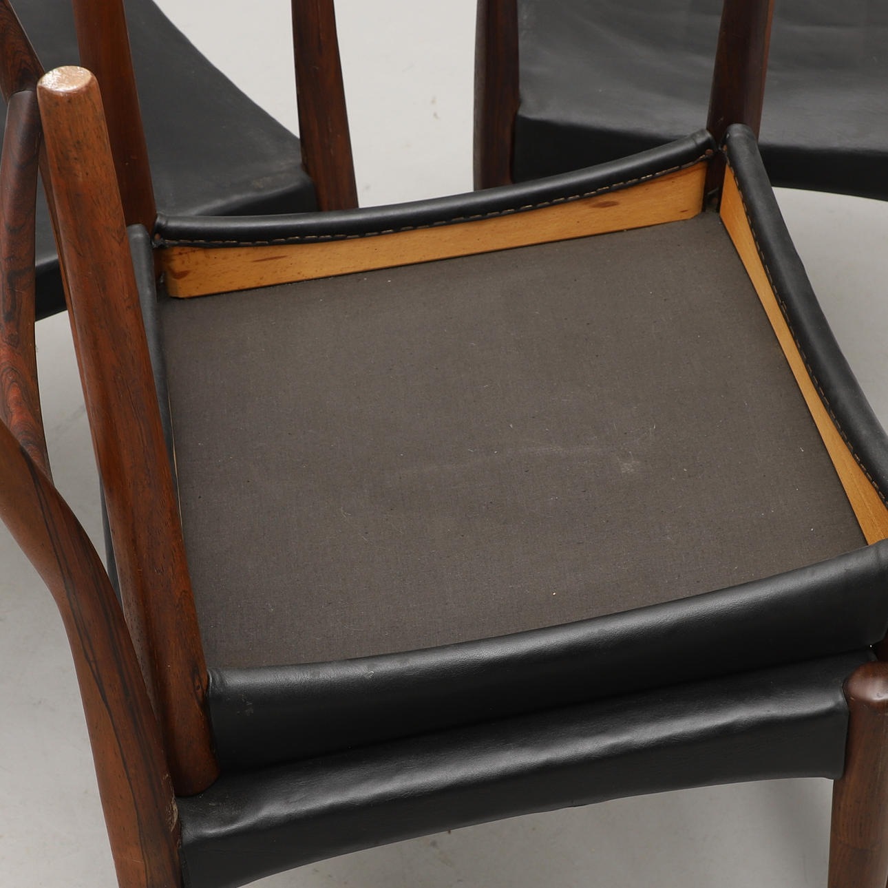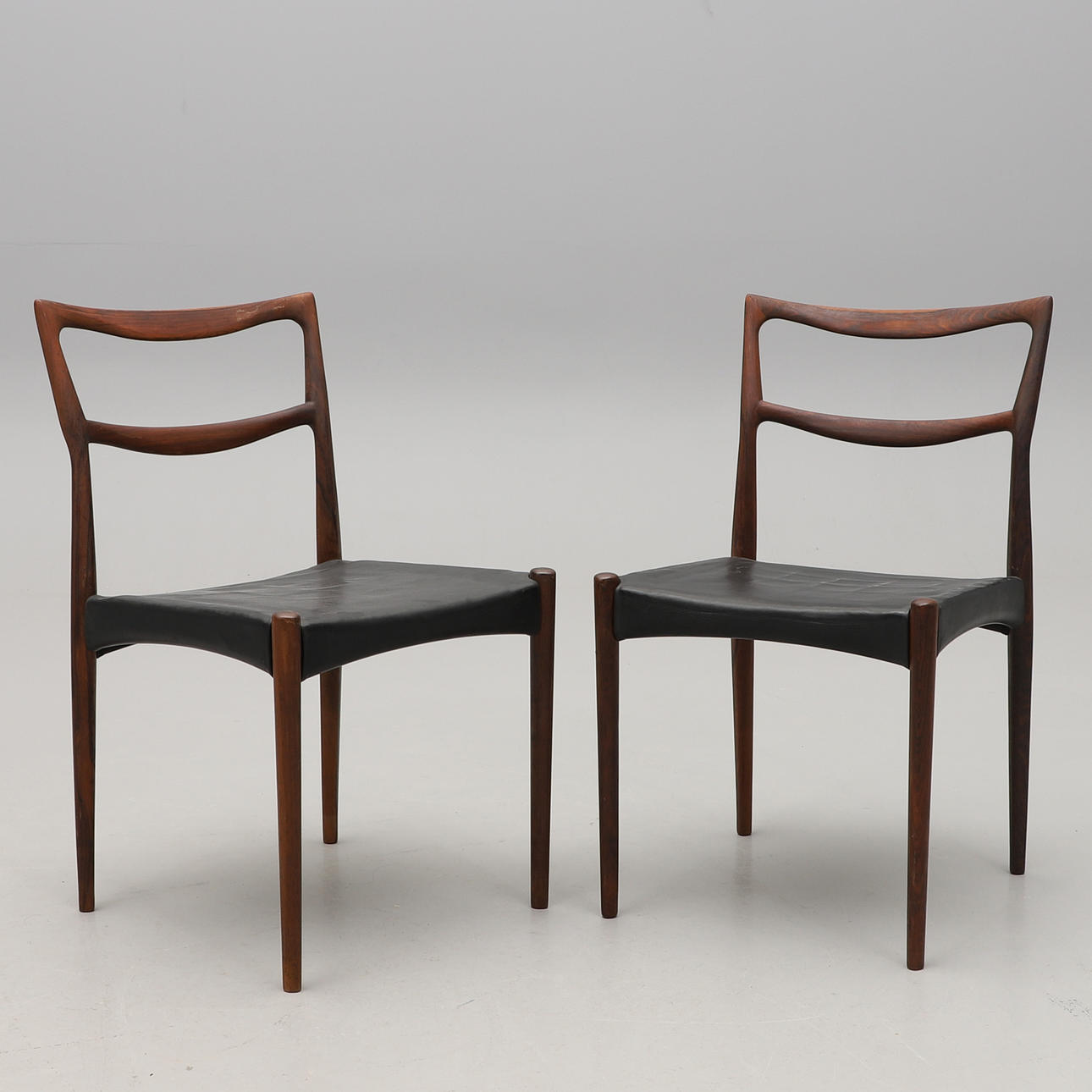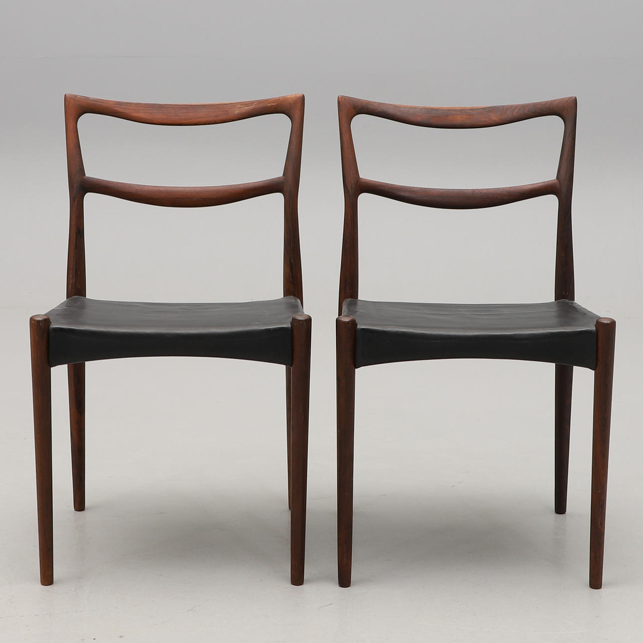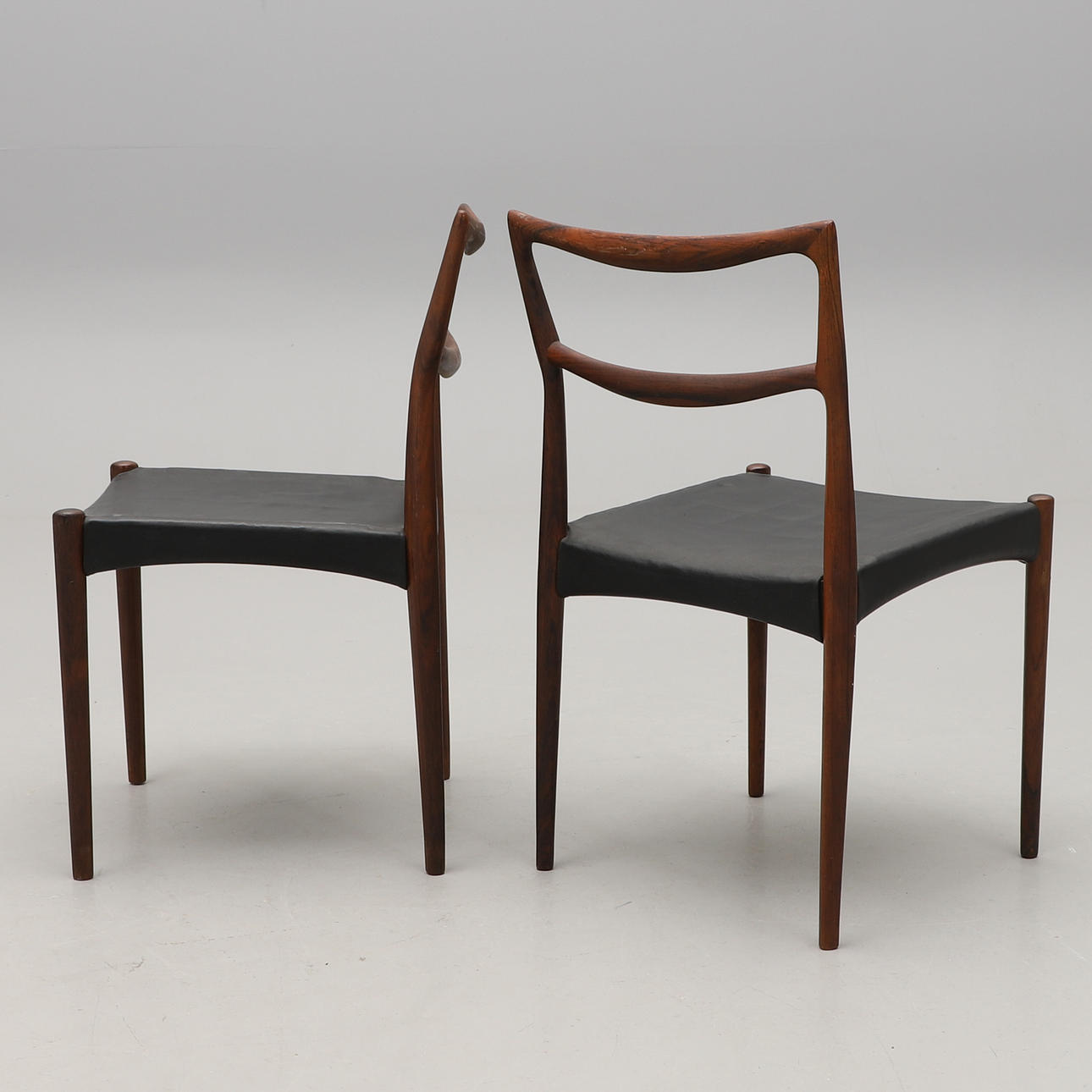 Palisander. Sæder betrukket med sort læder. Bredde 45, sædehøjde ca. 42 cm.