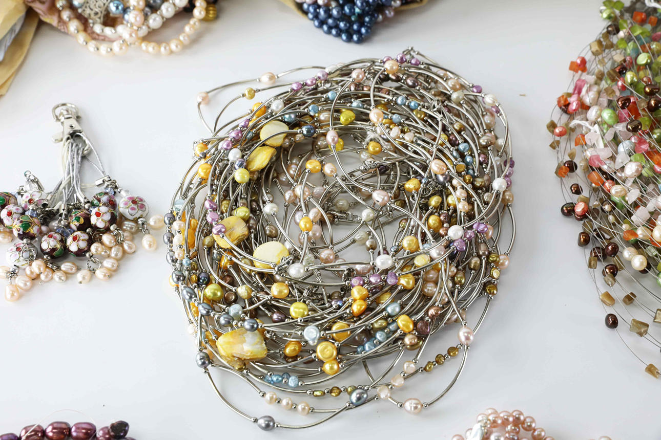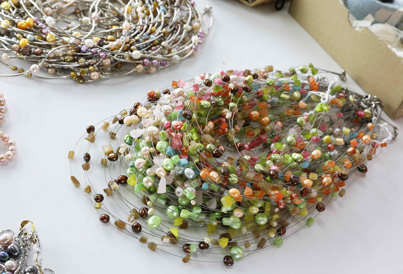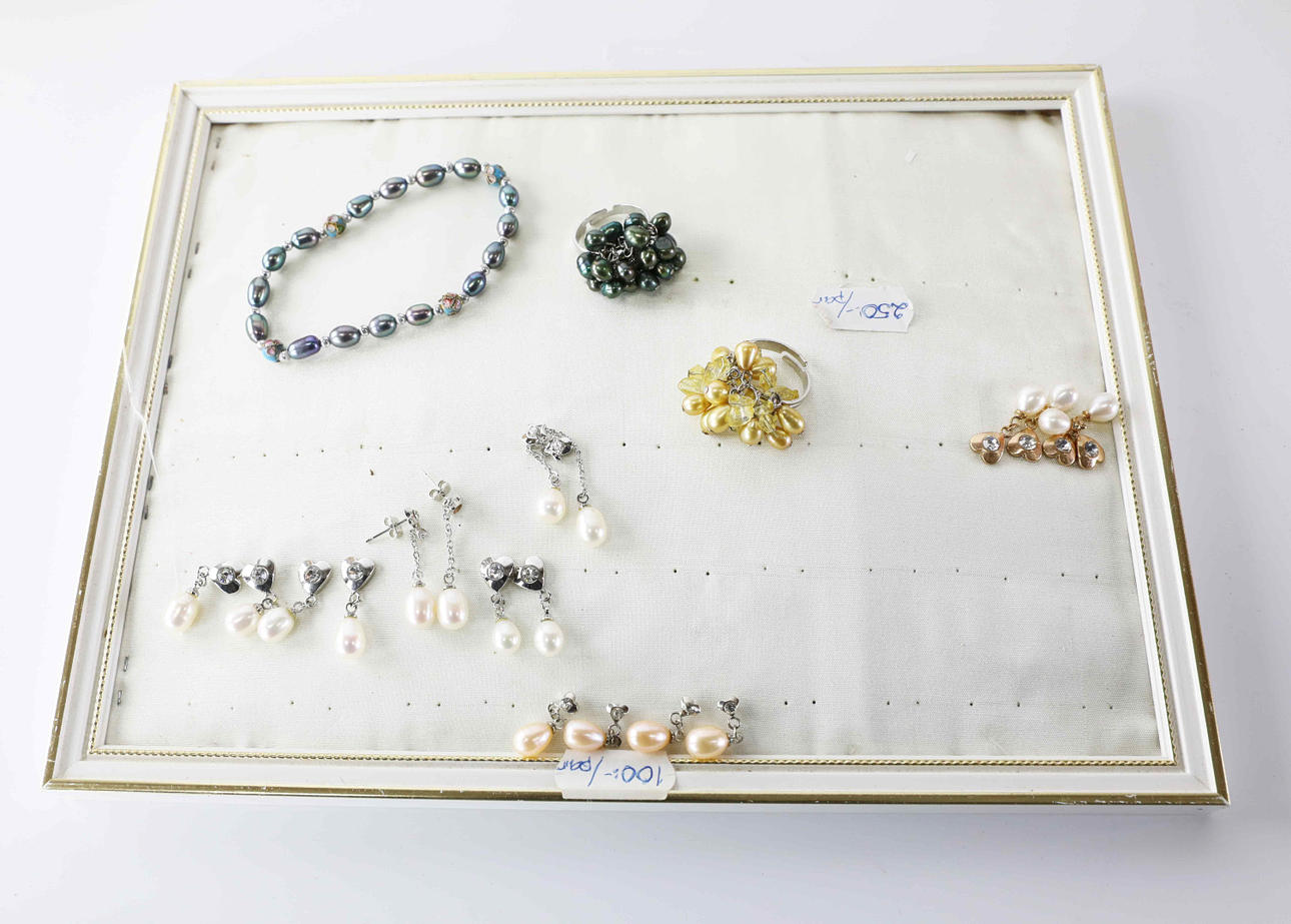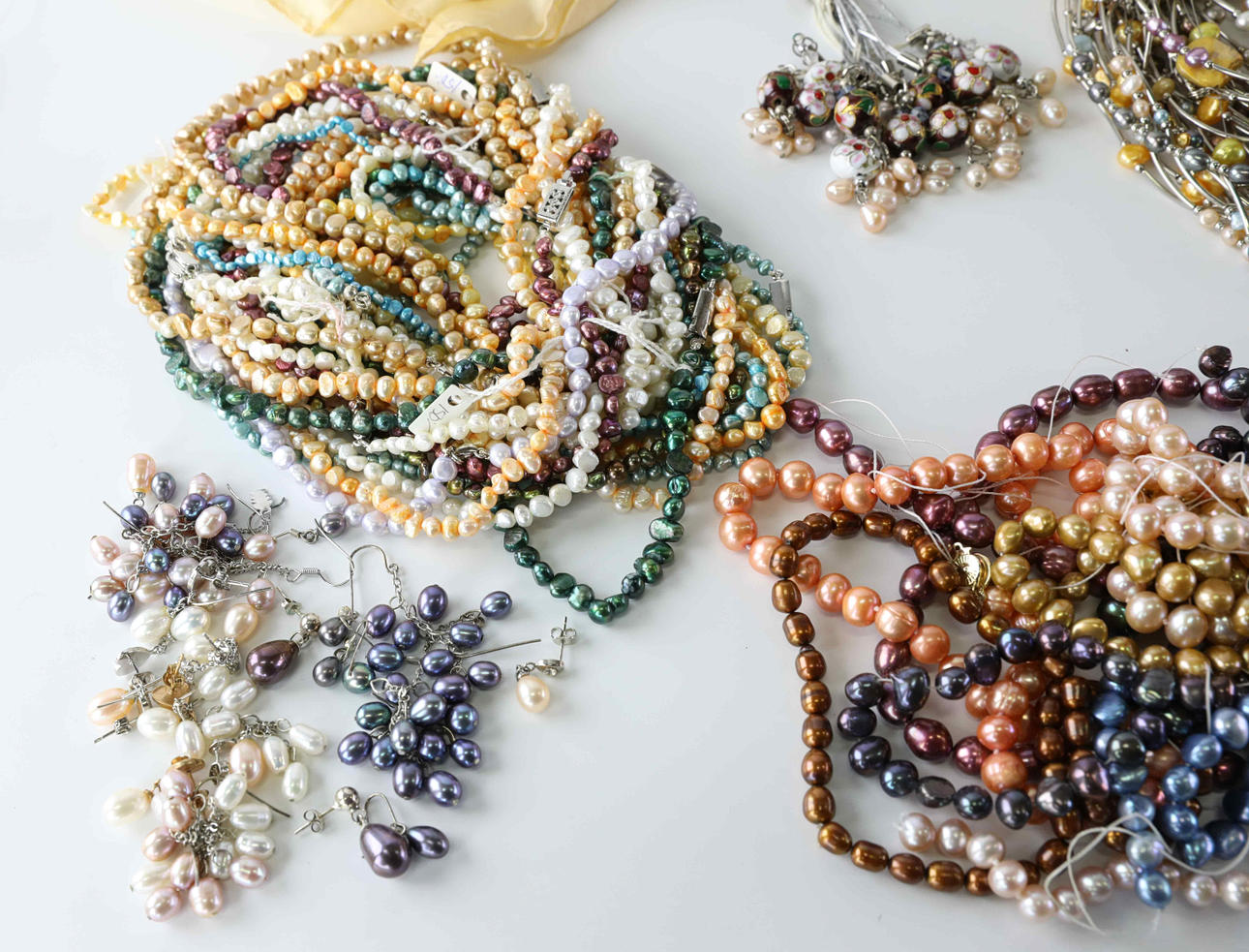 Færdige og halvfærdige halskæder, armbånd, øreringe, vedhæng, perler, prislapper på snor og selvklæbende, færdige smykker delvist pakket i poser som partier.
