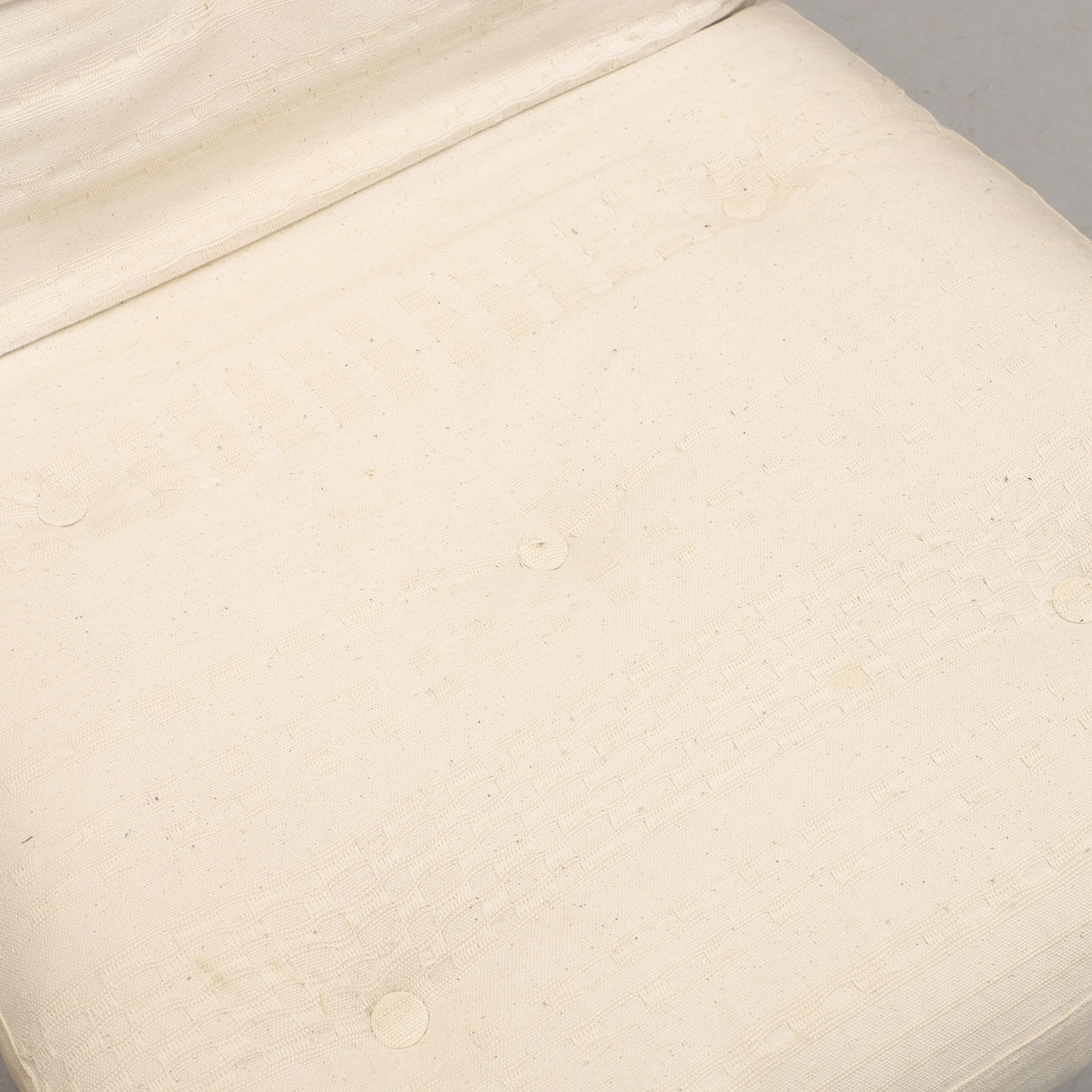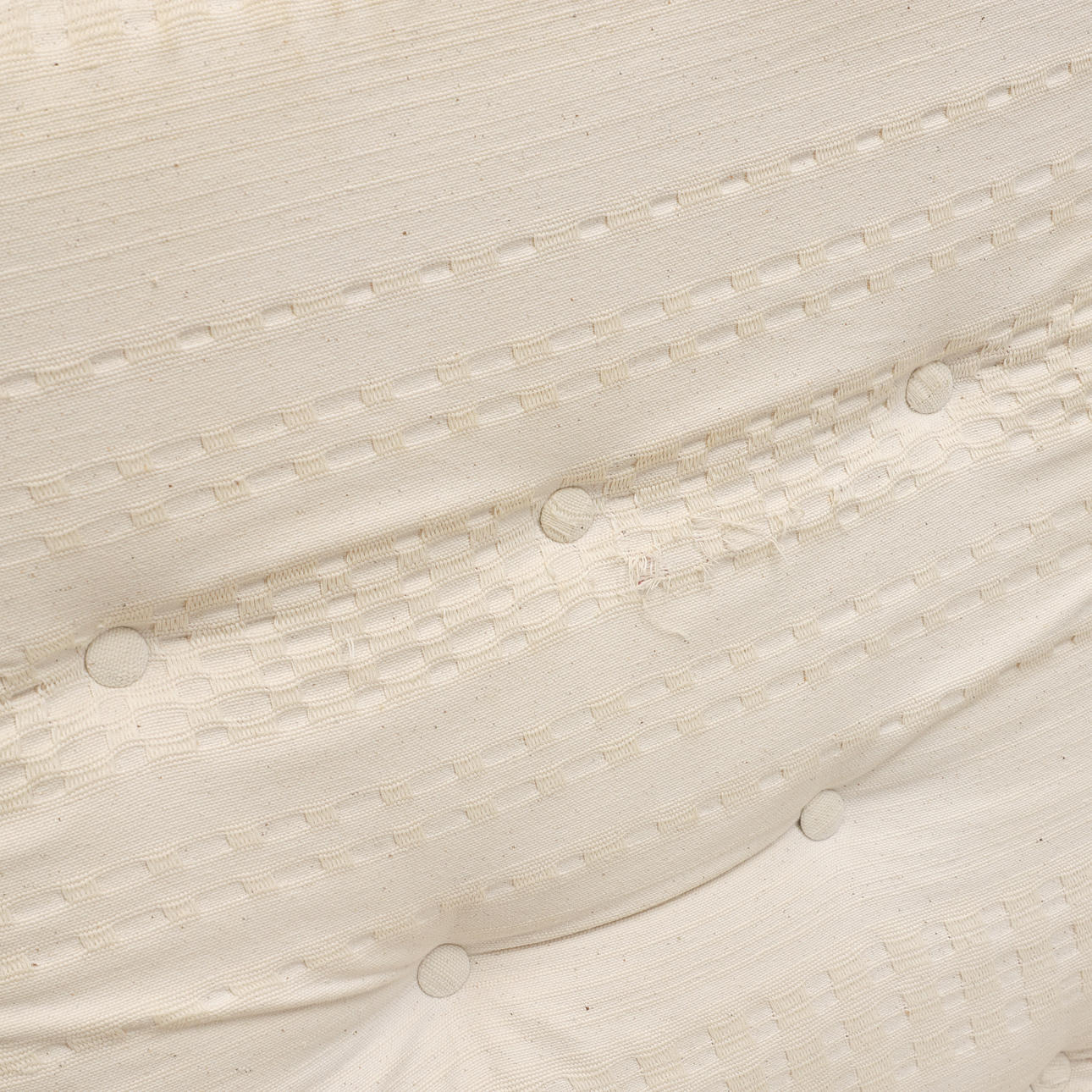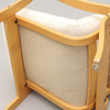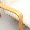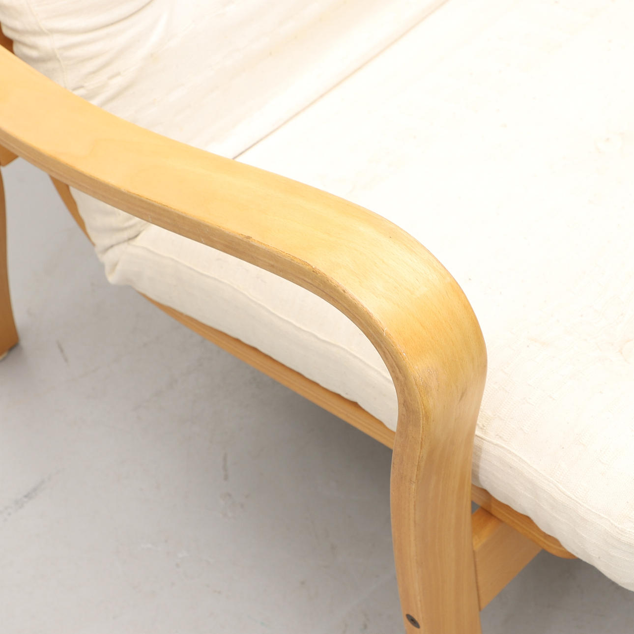 Bøjende træramme i bøg. Løs polstret pude betrukket i beige stof, undersæde i lærred. Bredde 70, højde 98, sædehøjde ca. 40 cm.