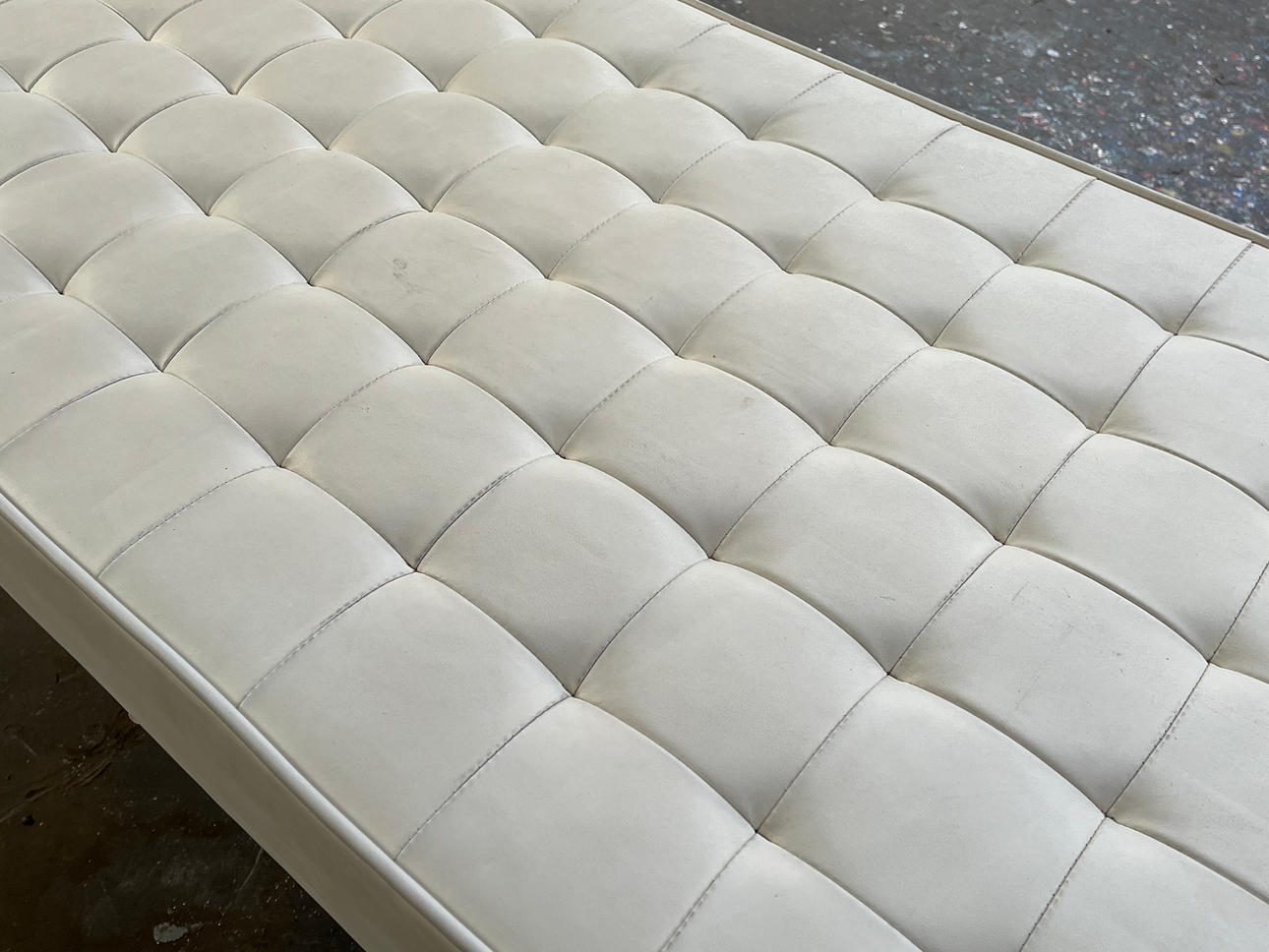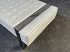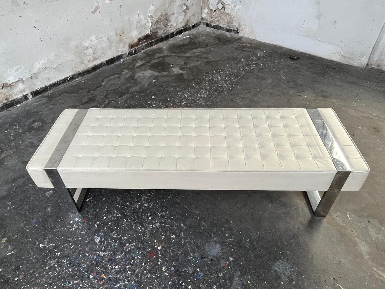 Klassisk lounge bænk. Konstruktion med forkromet metalbase, toppet hvidt syntetisk læderbetræk. H. 46, F. 200, T. 60 cm.