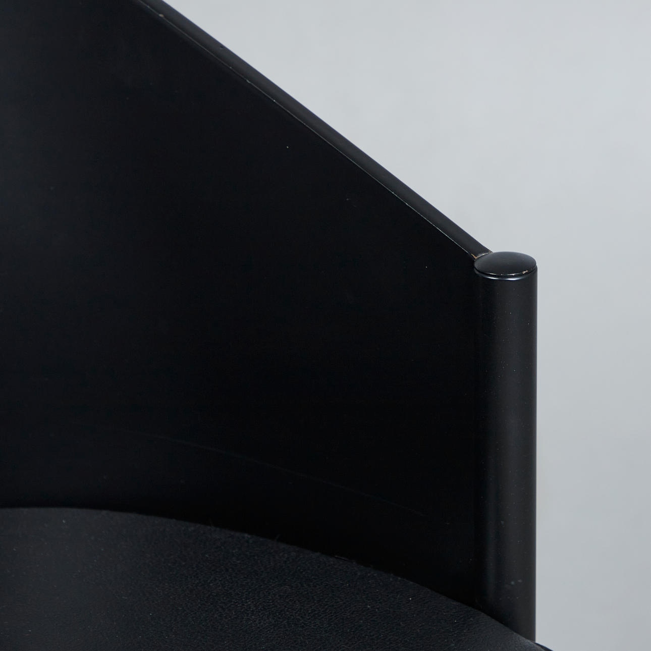 Philippe Starck (f. 1949) til Driade, stol/spisestol, model 'Aleph', stålrør, egetræsfiner, 1980'erne, Italien. Stolkonstruktion med tre ben lavet af sortmalet stålrør og afrundet ryglæn lavet af sort egetræsfiner, polstret sæde og beklædt med sort læder, med producentens etiket på undersiden, H.80cm, sædehøjde: 47cm, B.48cm, D.43cm.