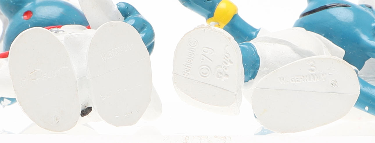4 Smølfer mærket Peyo; tennis, læge, med hammer og fiskestang