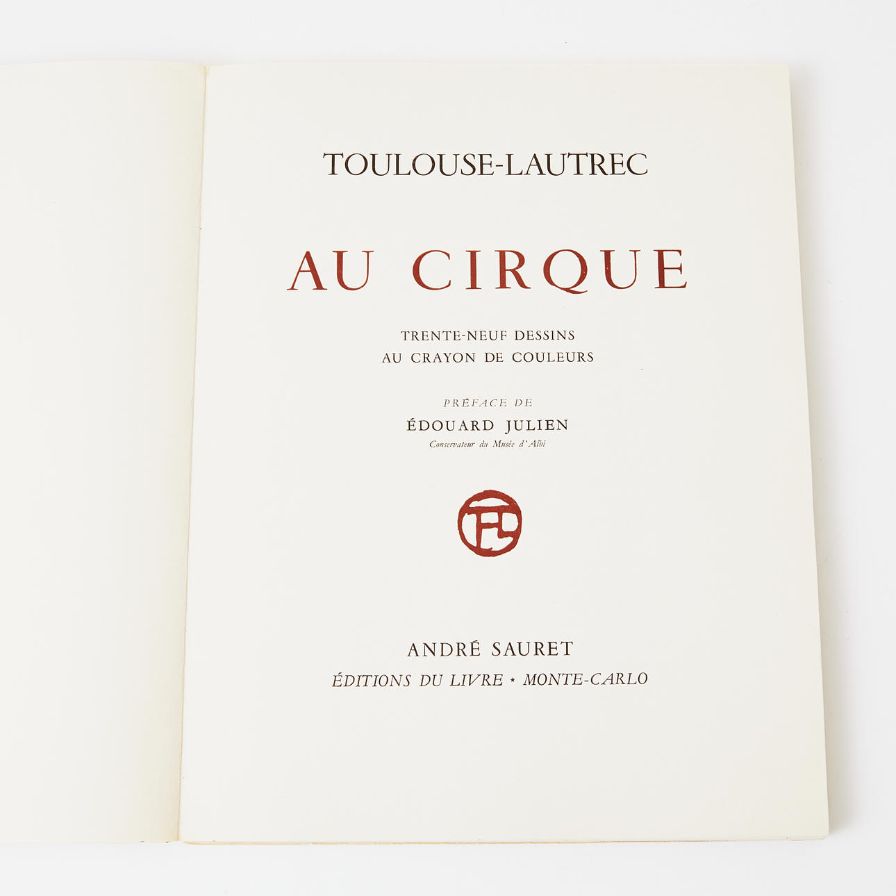 TOULOUSE LAUTREC; (EDWARD JULIEN. At Cirque Trente-Neuf Tegninger med Farveblyant. Forord af Édouard Julien. Monte Carlo, André Sauret, Udgivelser af bogen, 1952.