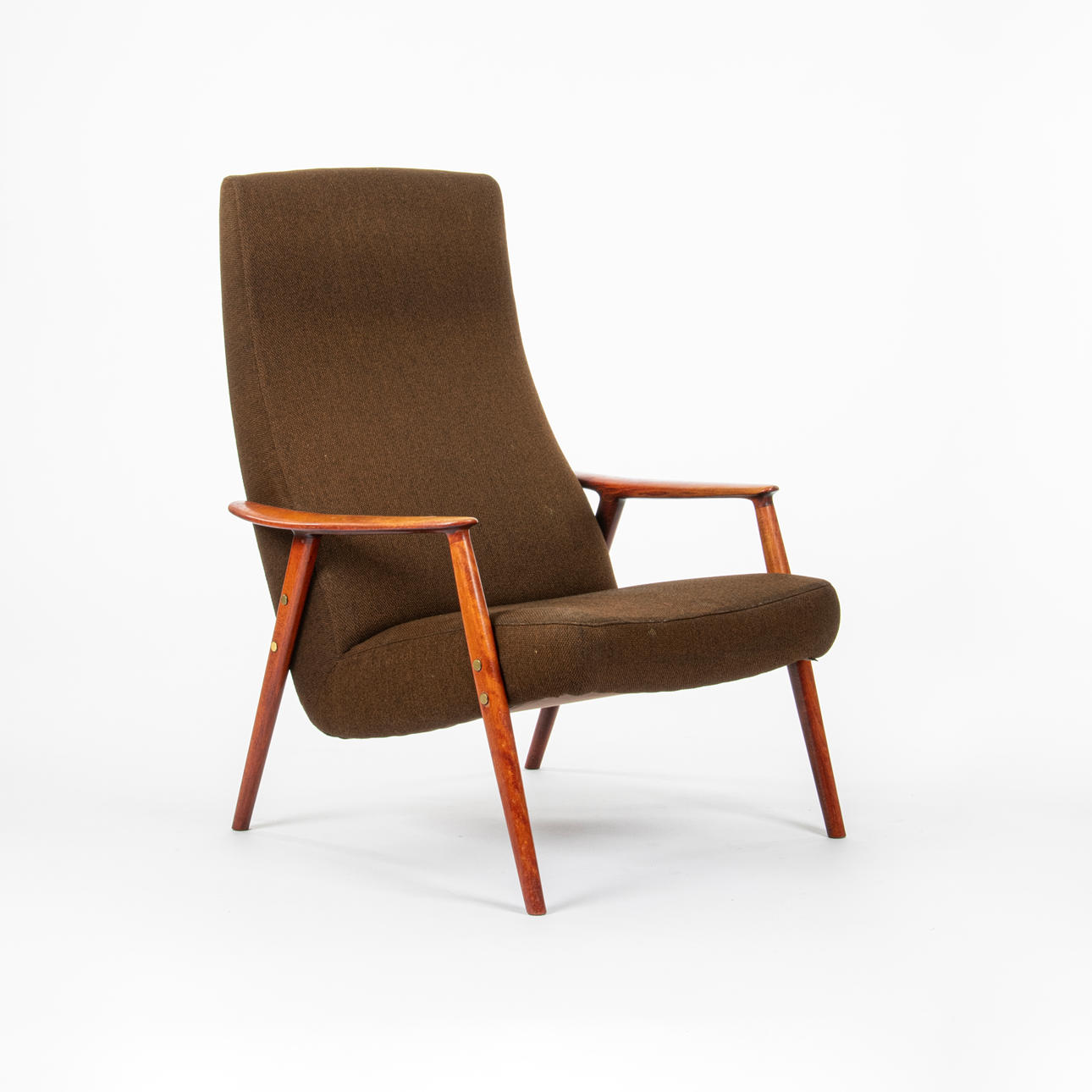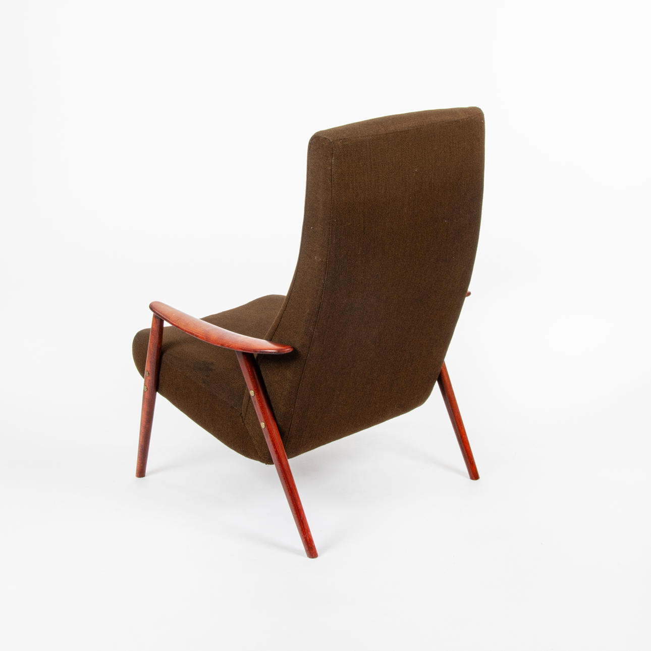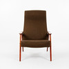 Lænestol, fuldt polstret, ben og armlæn i rødbejdset træ. Design af Folke Ohlsson for Dux.