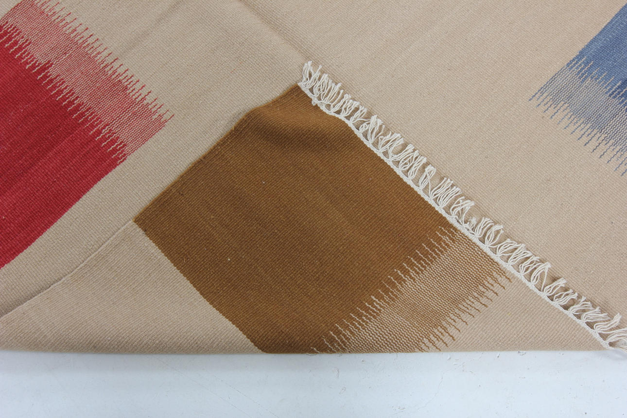 Fladvævet indisk tæppe i uld på bomuldsvarp. Moderne polykrom mønster.