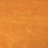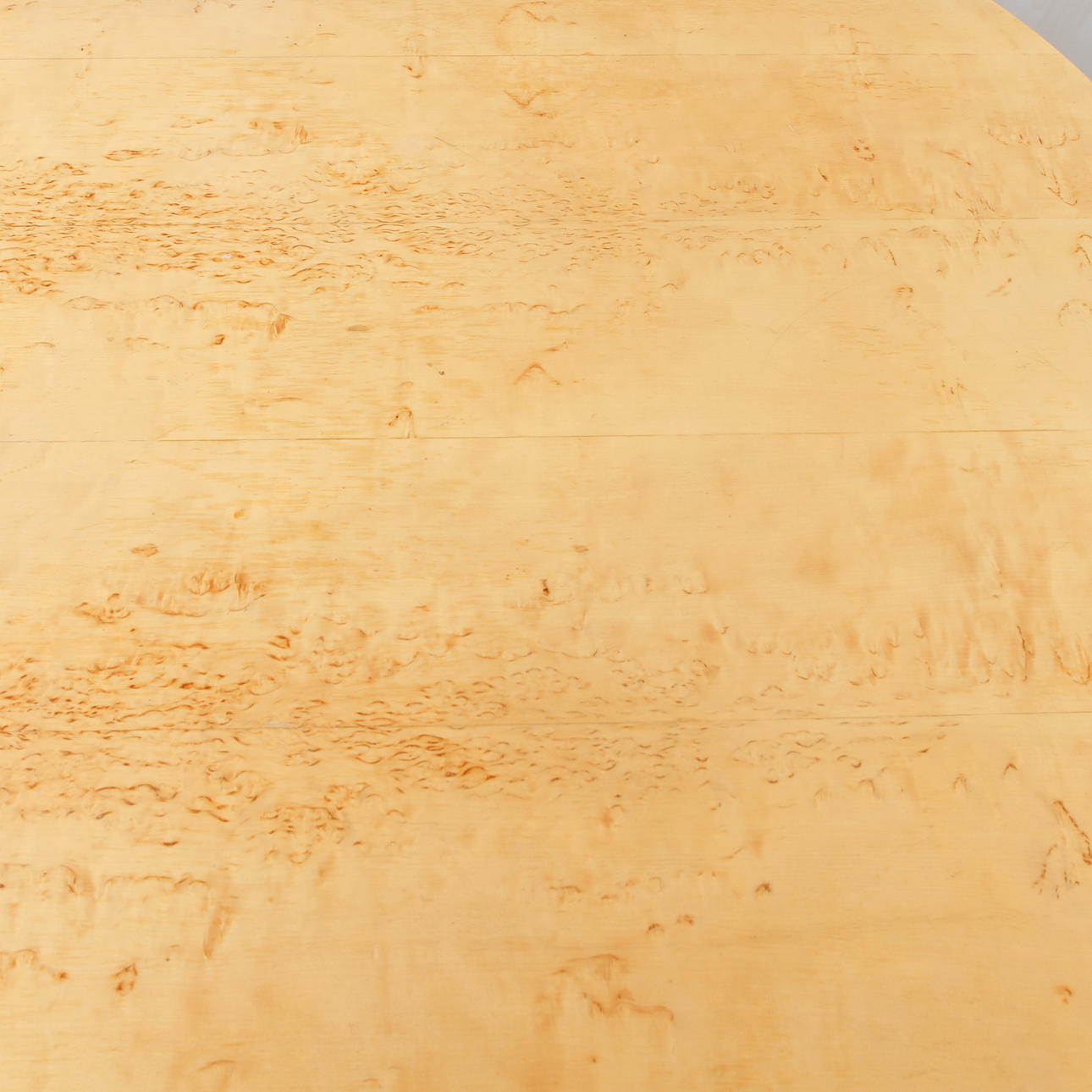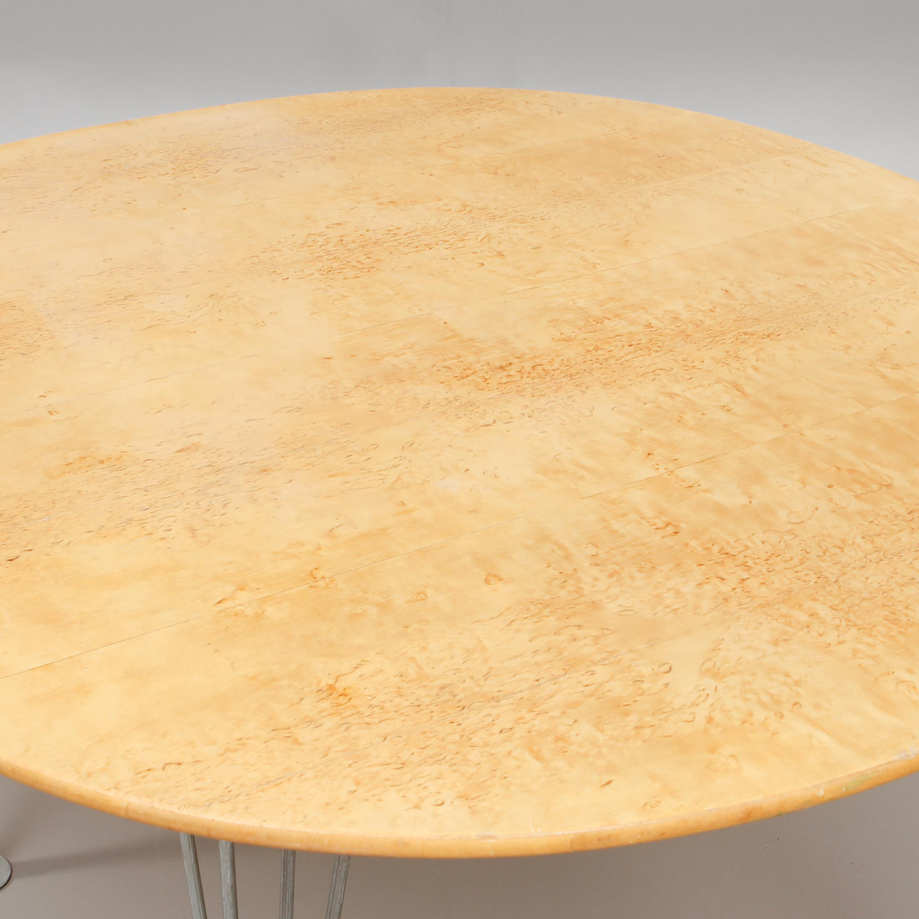 Skivefineret med masurbirk. På klemben lavet af forkromet stål. Mærket „E3323 125.1319. /Mi 313/SE Birk“. Dimensioner ca. 130 x 130 x 70 cm.