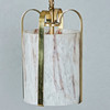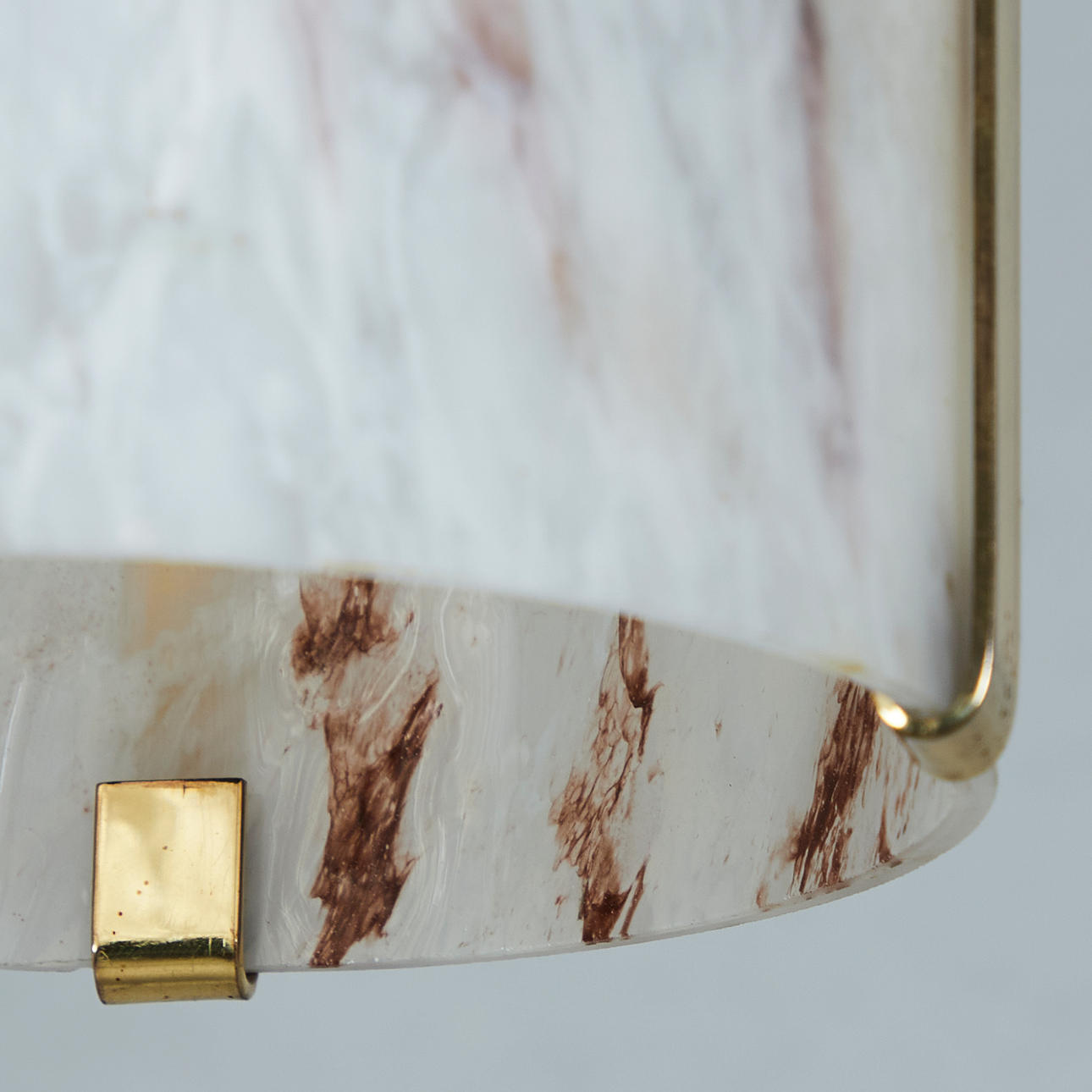 Loftslampe/ pendel, messing, opalglas. Ophængslampe med messingbeslag og cylindrisk lampeskærm lavet af rødt marmoreret opalglas, forsynet med et brændpunkt, H.57cm, D.17cm.