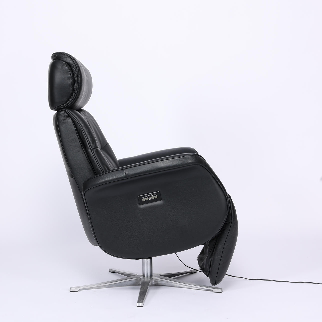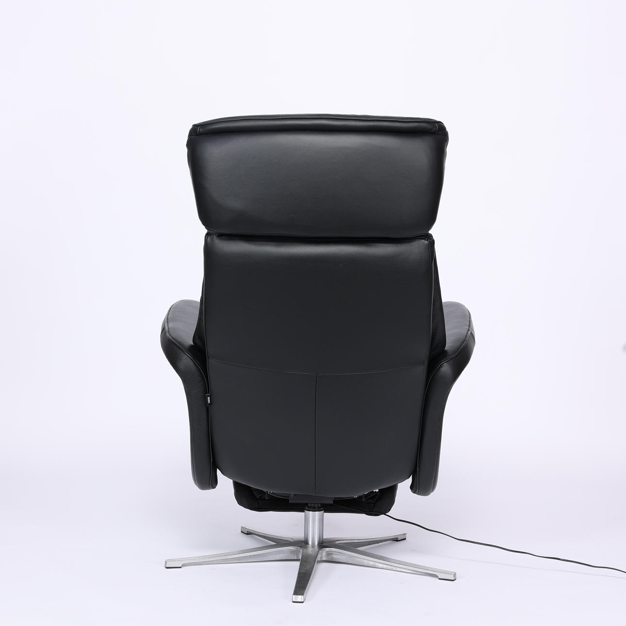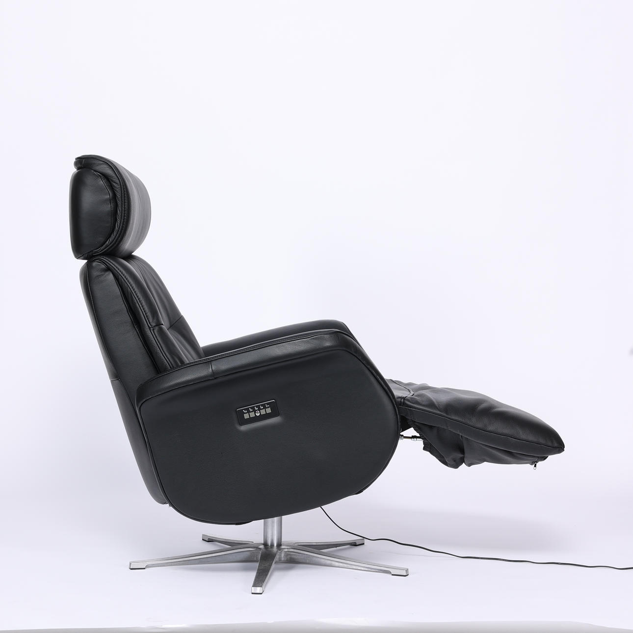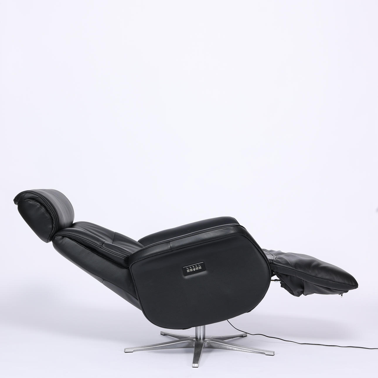 Lænestol i sort læder med indbygget elektronisk fodskammel og børstet stålfod. Købt fra ILVA. Højde 111 cm. Længde 81 cm. Vægt 44 kg, Bredde/Dybde
