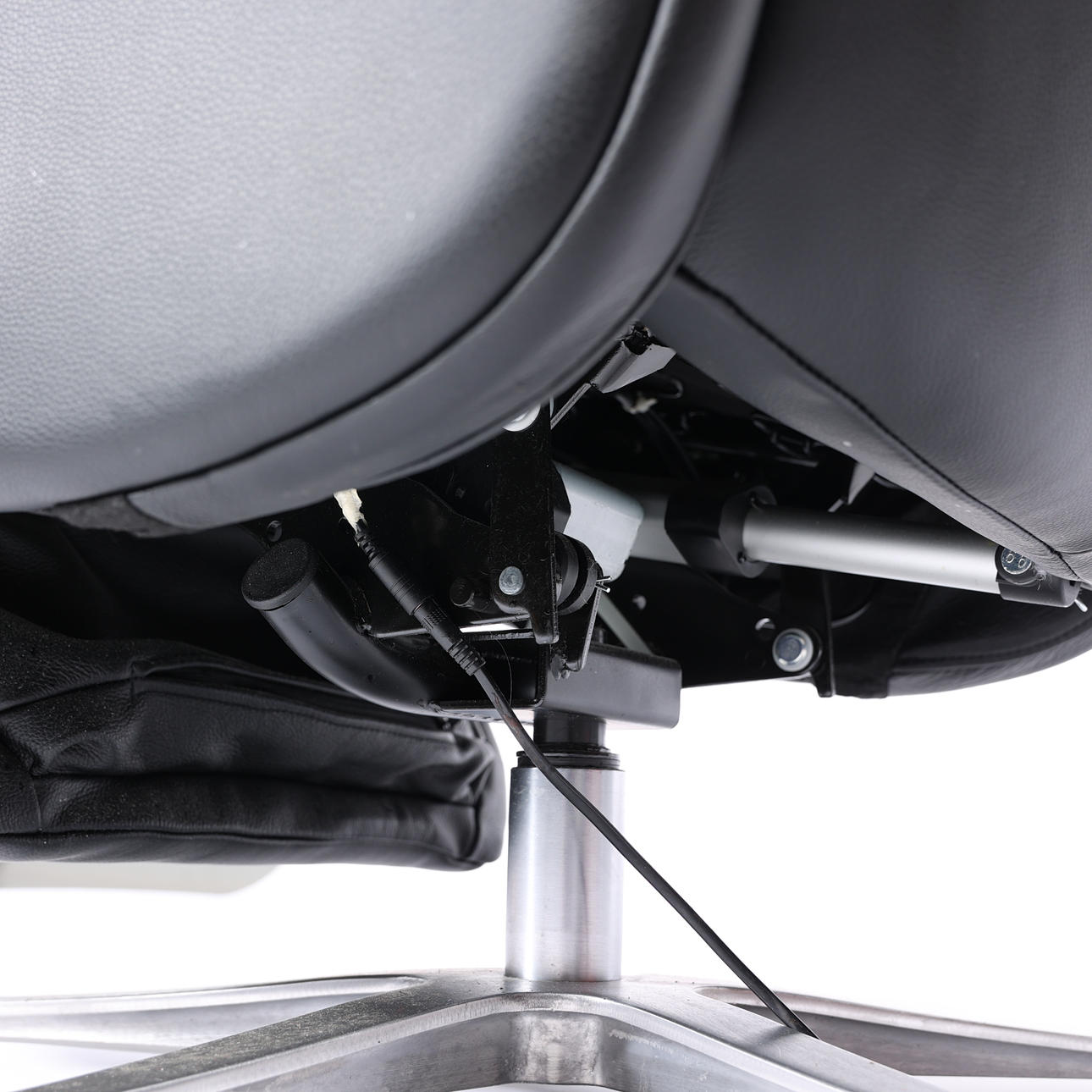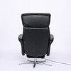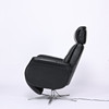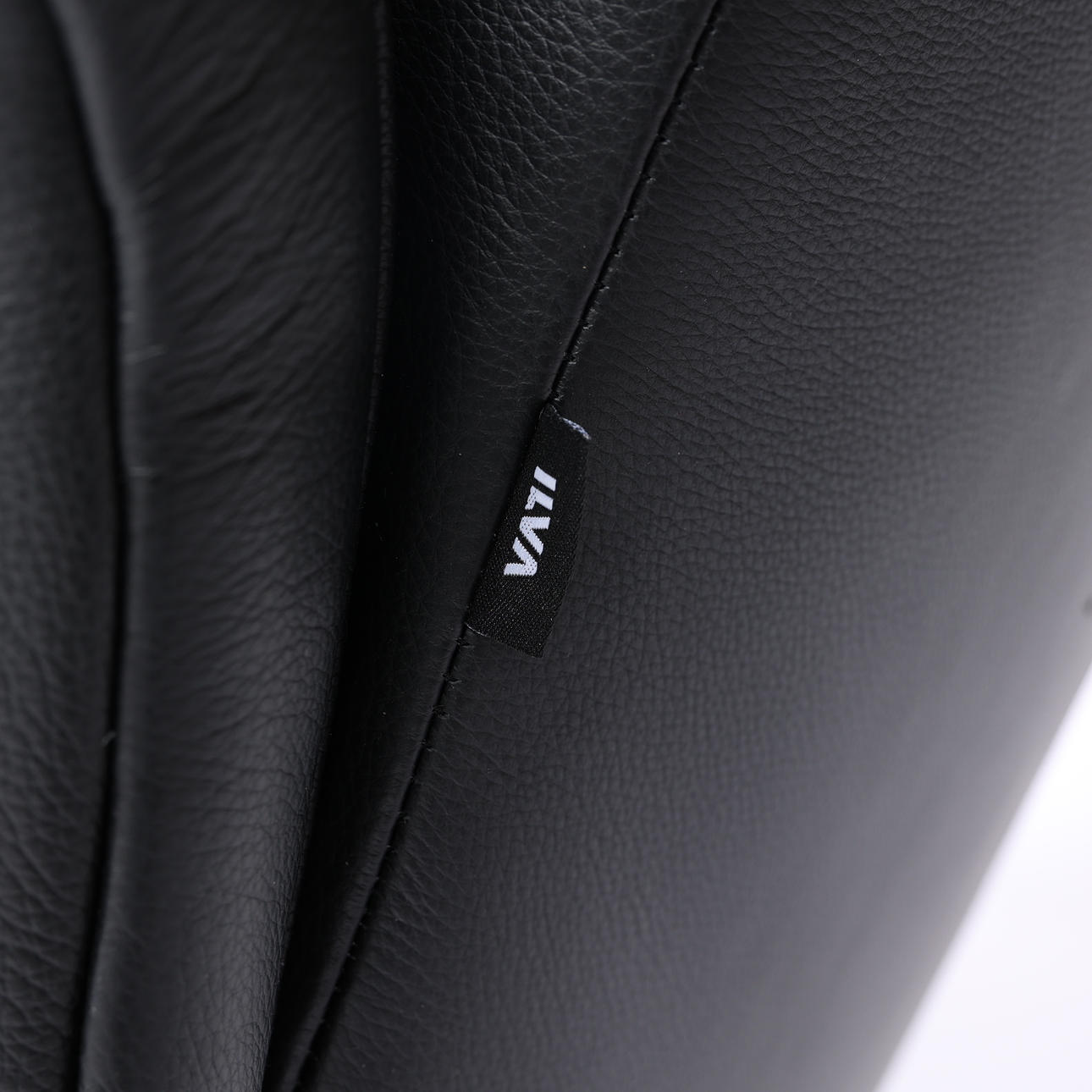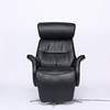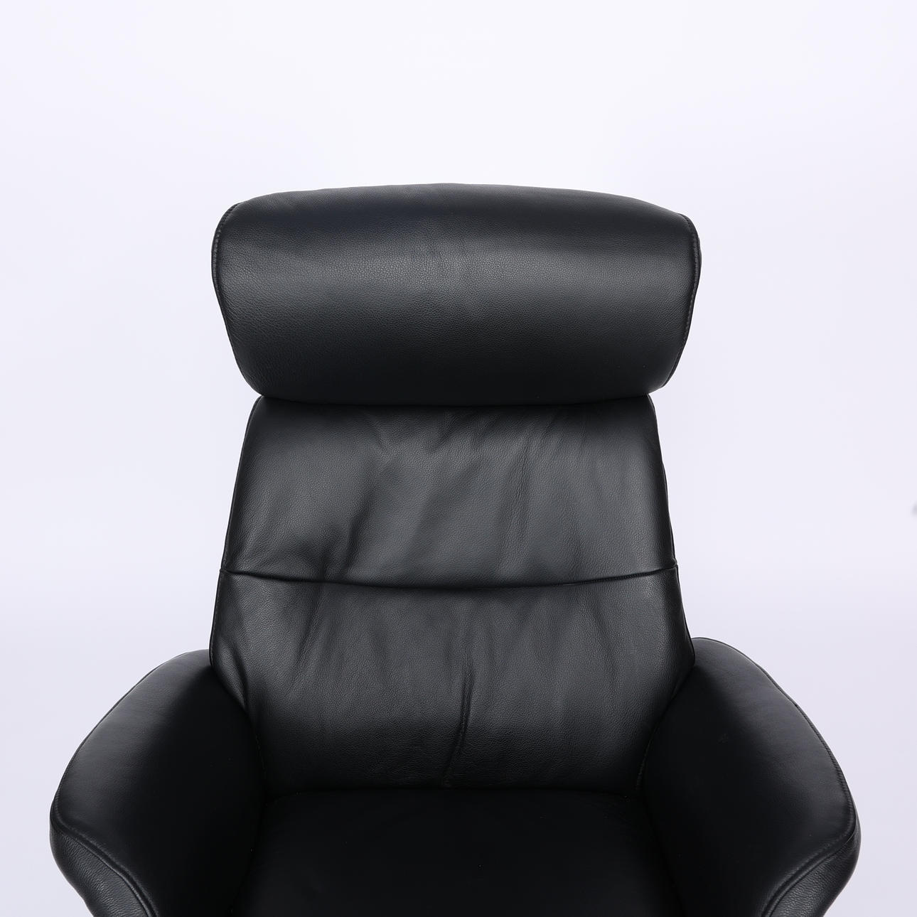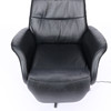 Lænestol i sort læder med indbygget elektronisk fodskammel og børstet stålfod. Købt fra ILVA. Højde 111 cm. Længde 81 cm. Vægt 44 kg, Bredde/Dybde