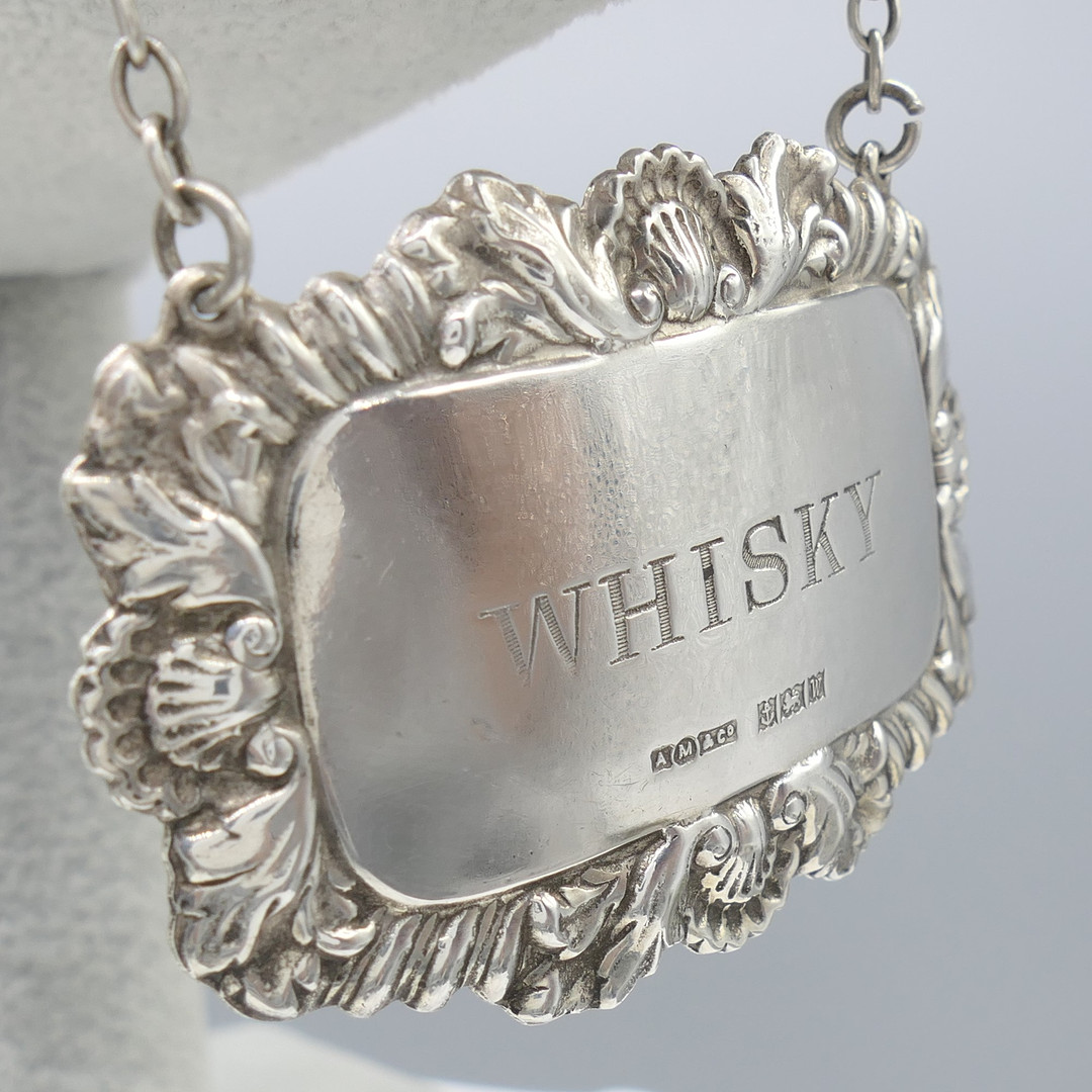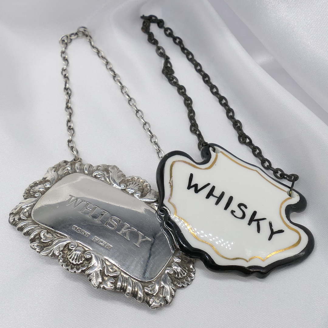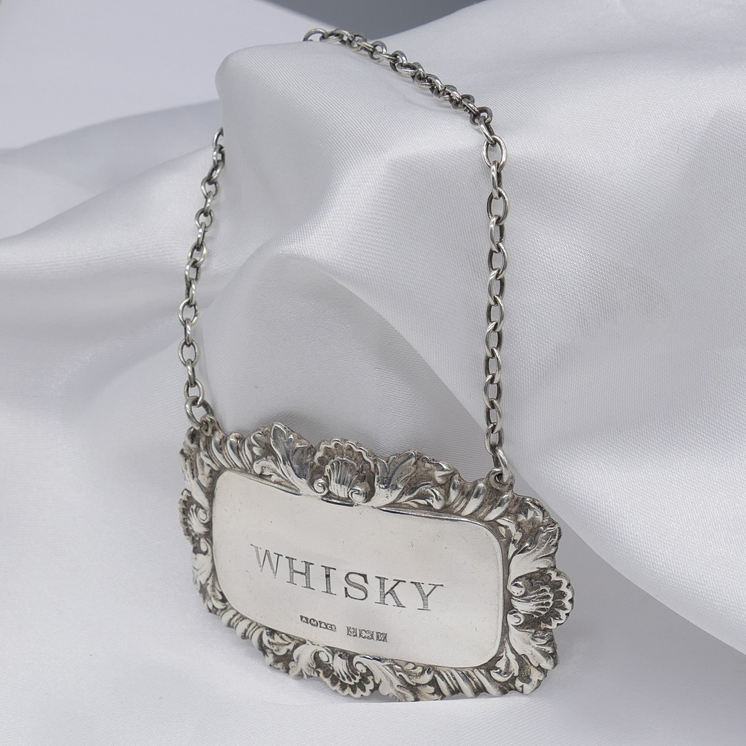 3250210. VINTAGE SILVER WHISKY karaffeletiketter.