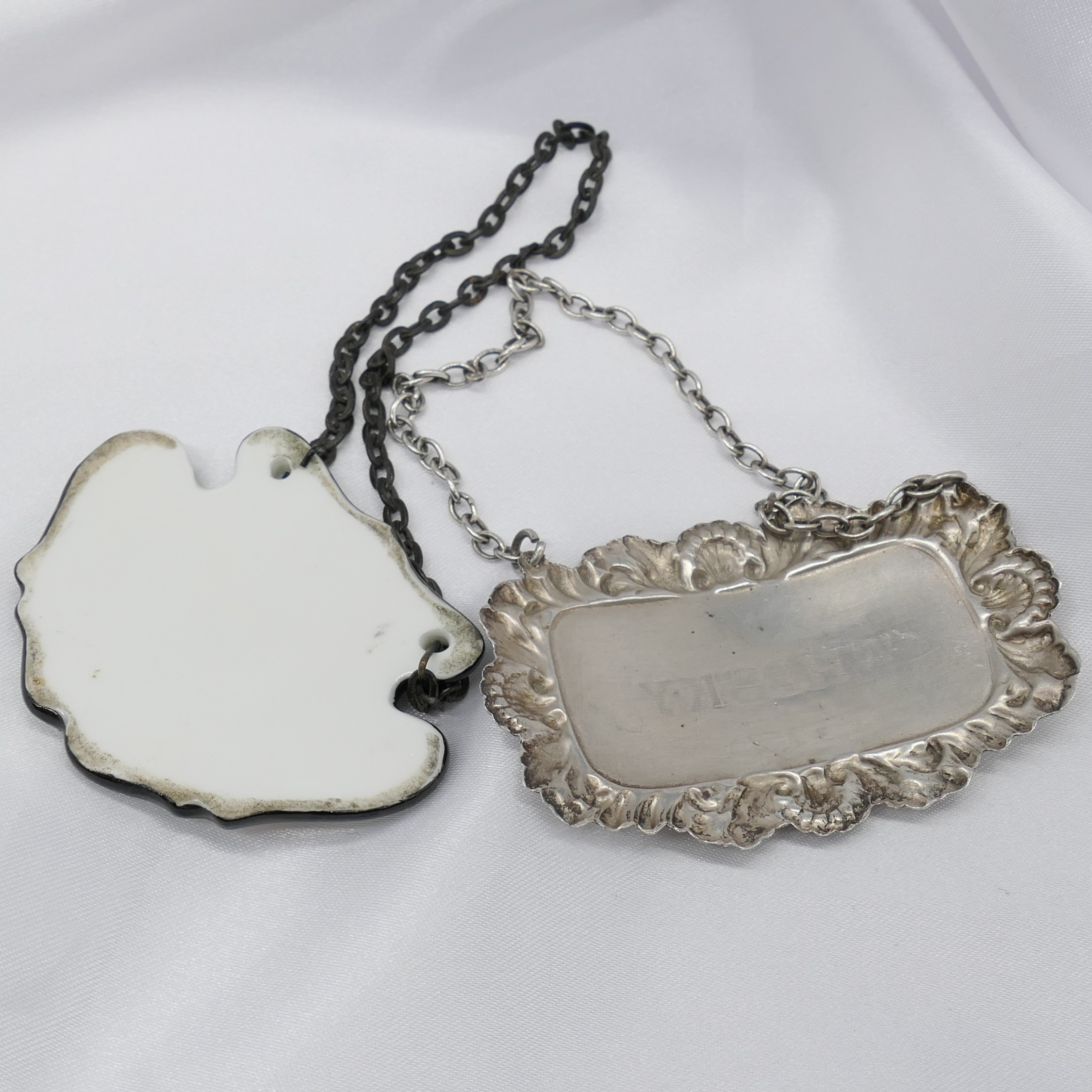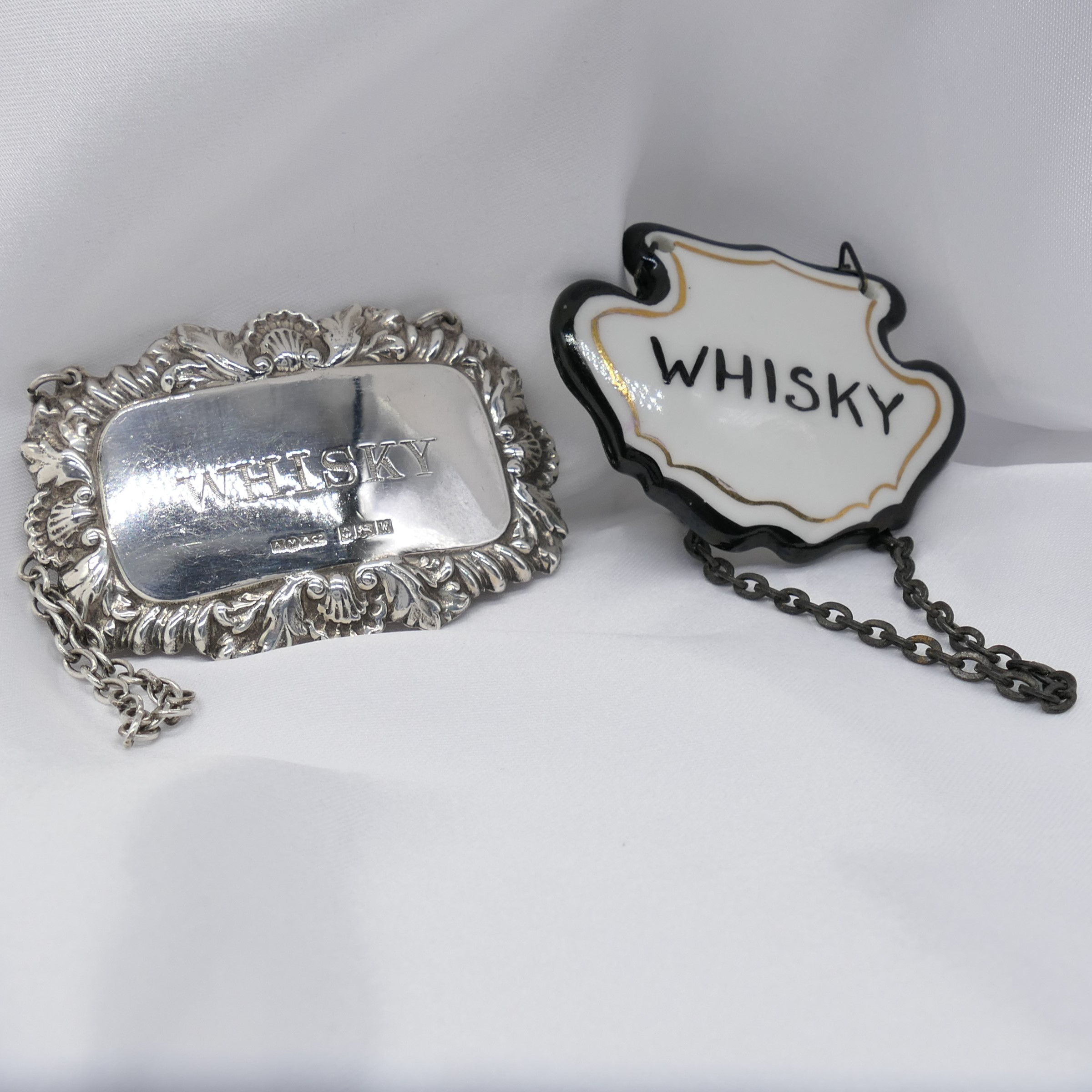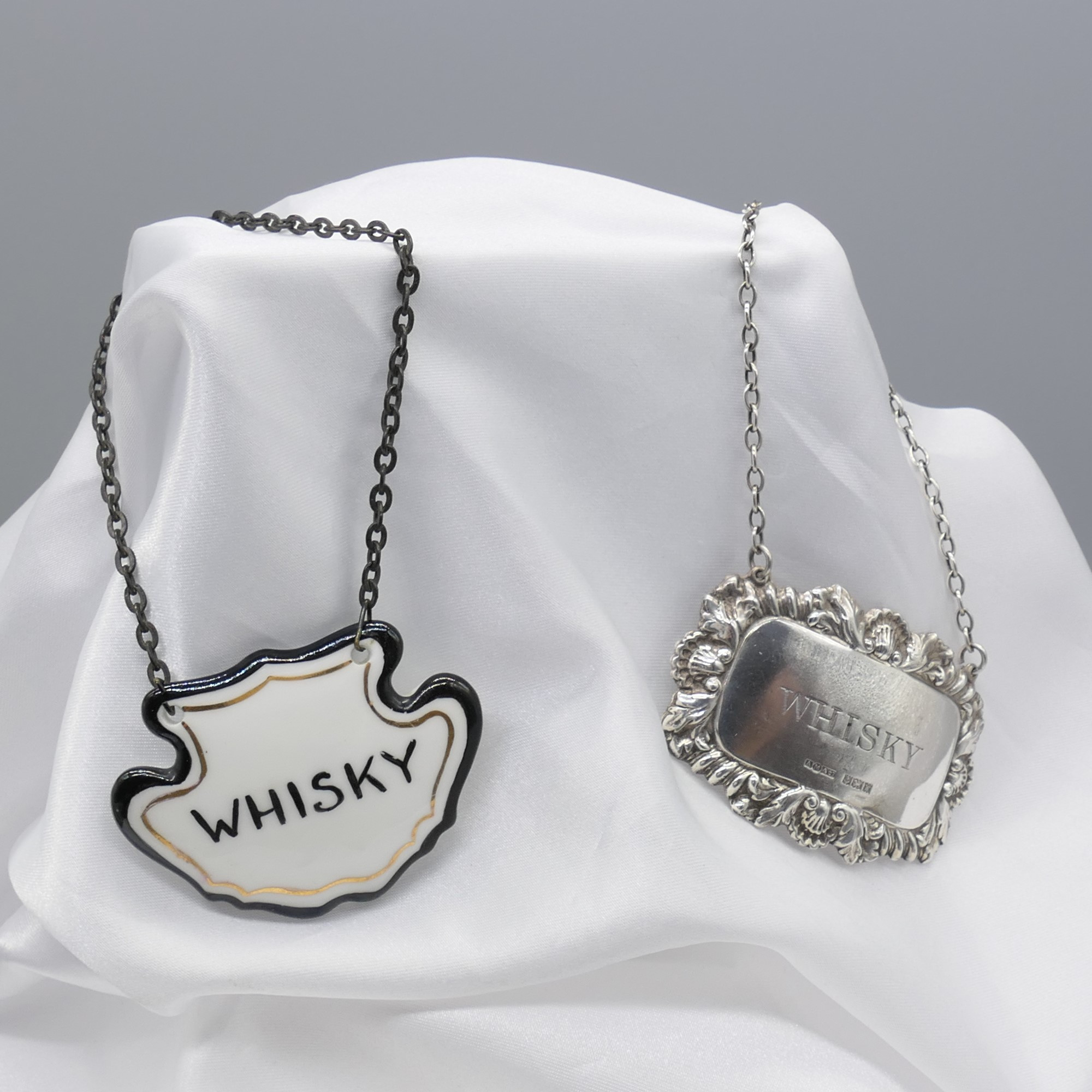 3250210. VINTAGE SILVER WHISKY karaffeletiketter.