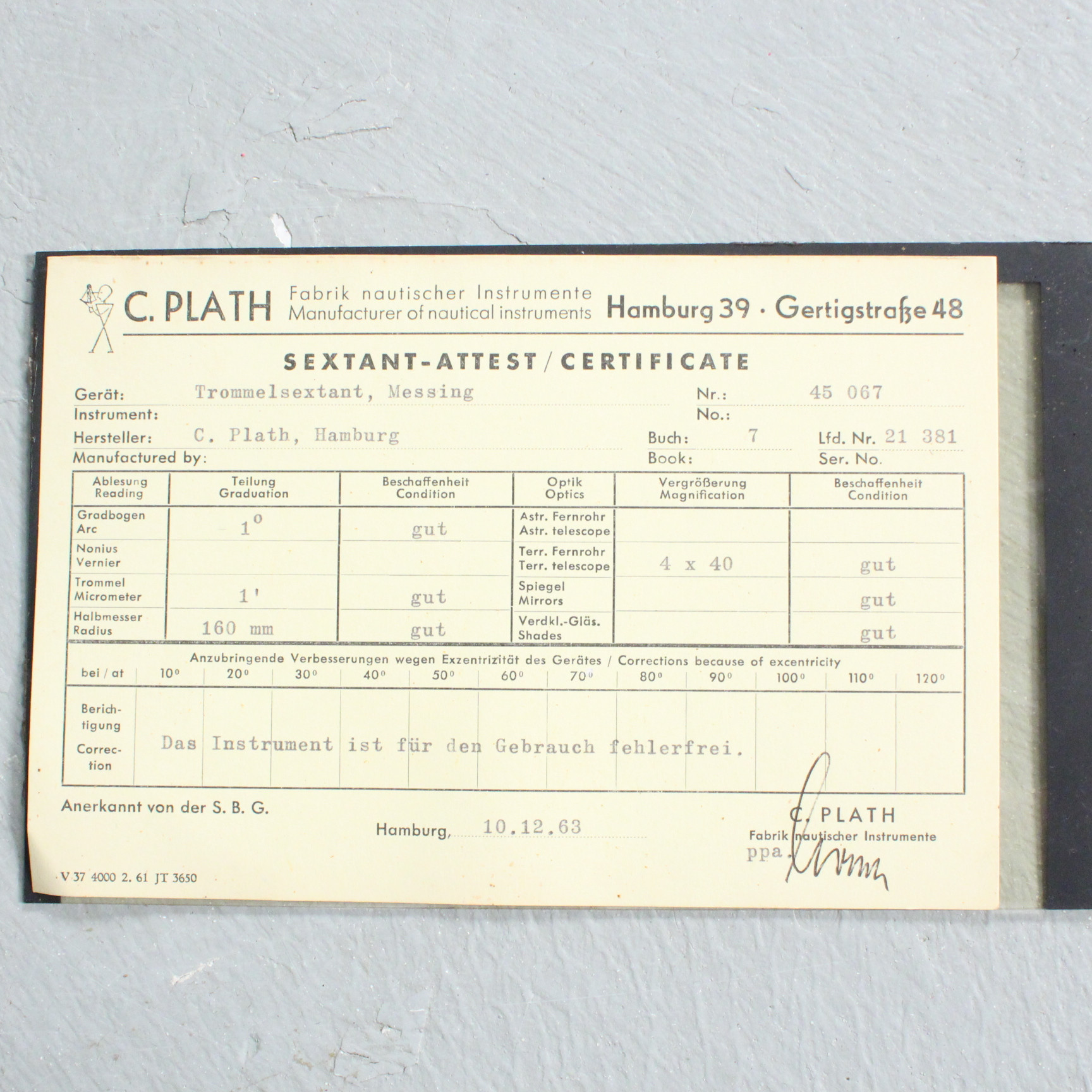 3259085. C. PLATH, Hamborg. Messingtrommesekstant.