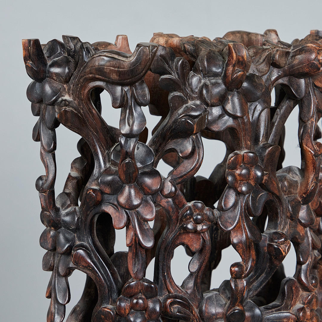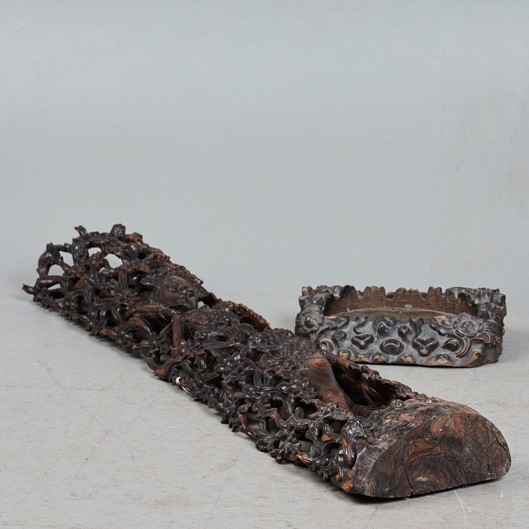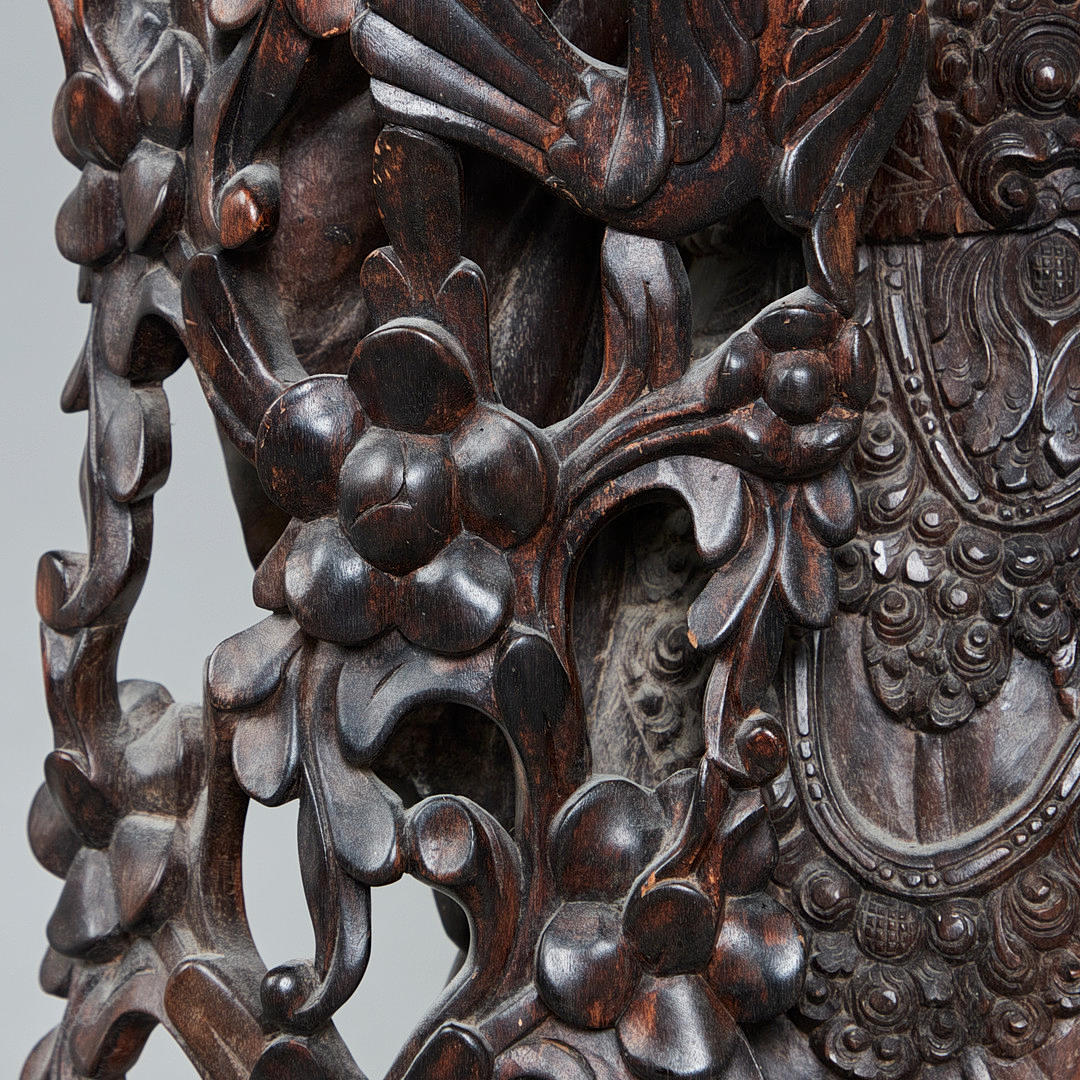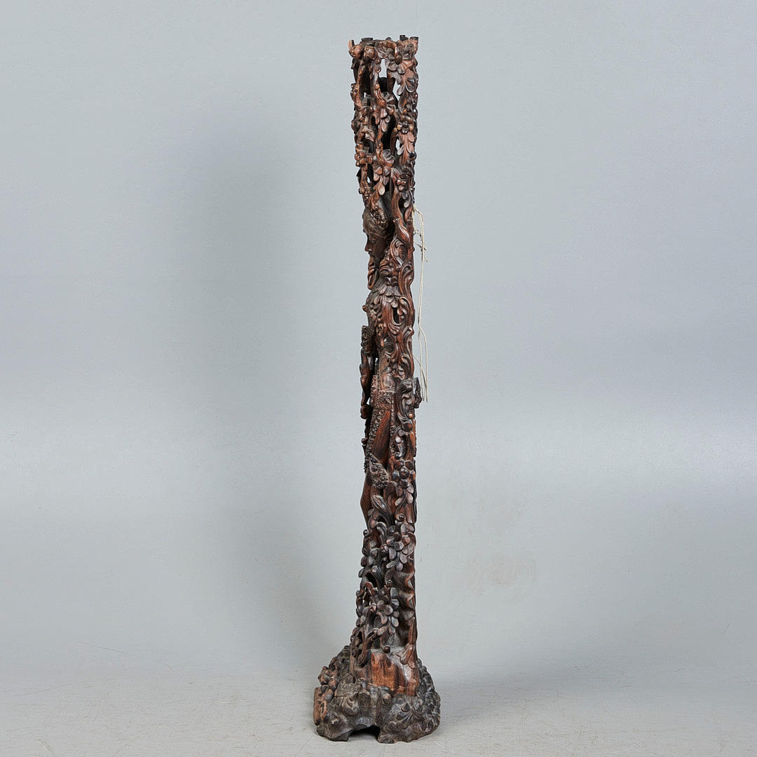 Skulptur / figur, danser, træ, Indien. Detaljeret udskåret træfigur forestillende en indisk danser med traditionelle klæder og hovedbeklædning, placeret på en træbund, glaseret mørkebrun, H.136cm, B.28cm, D.14cm.