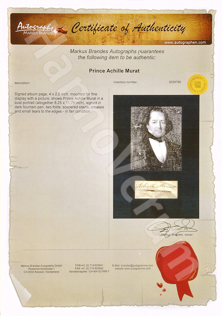 326439. NAPOLEON ACHILLE MURAT. Certificeret autograf.