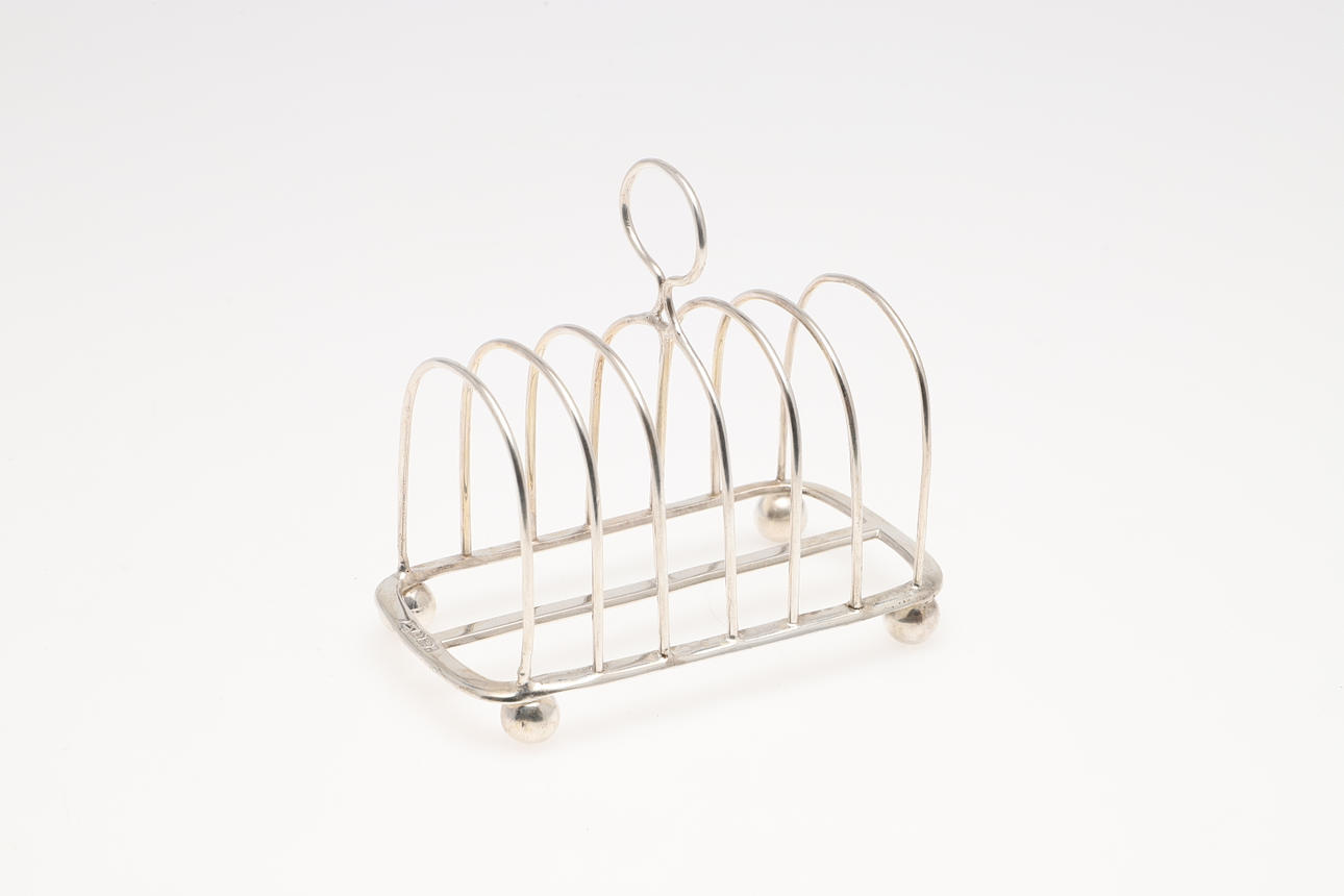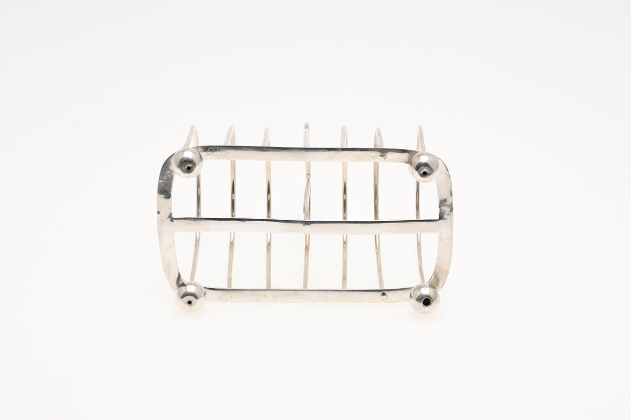med 7 buede stænger, et centralt løkkehåndtag og hævet på bunkefødder, Sheffield 1898; 4.75" (12cm) lang; 3.6ozt.
