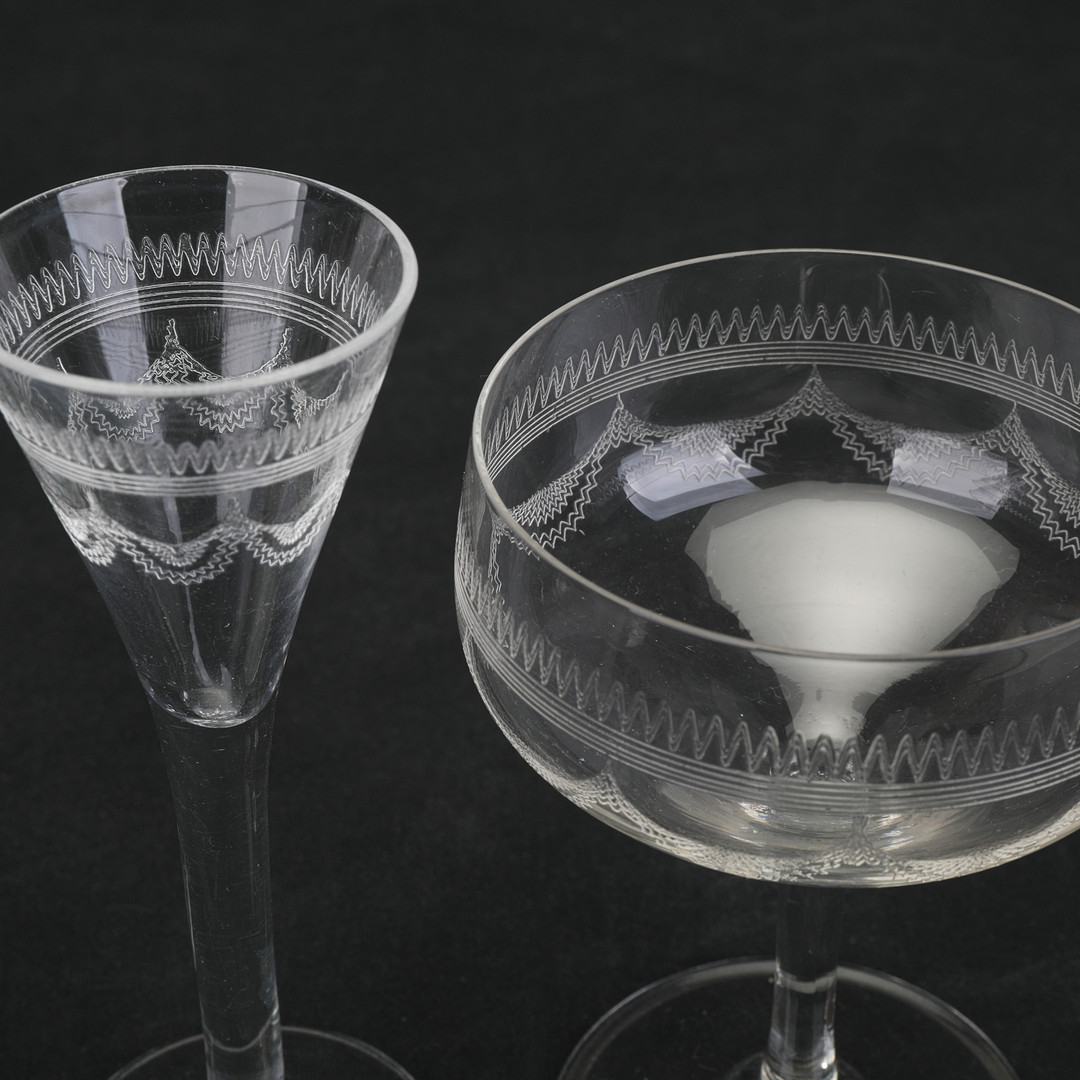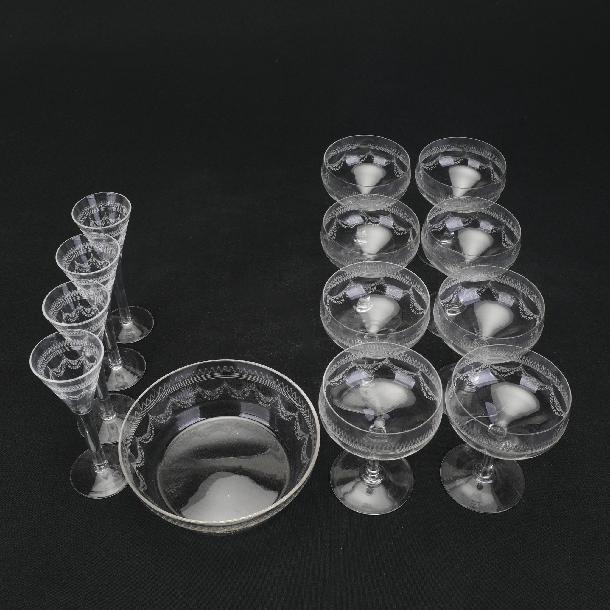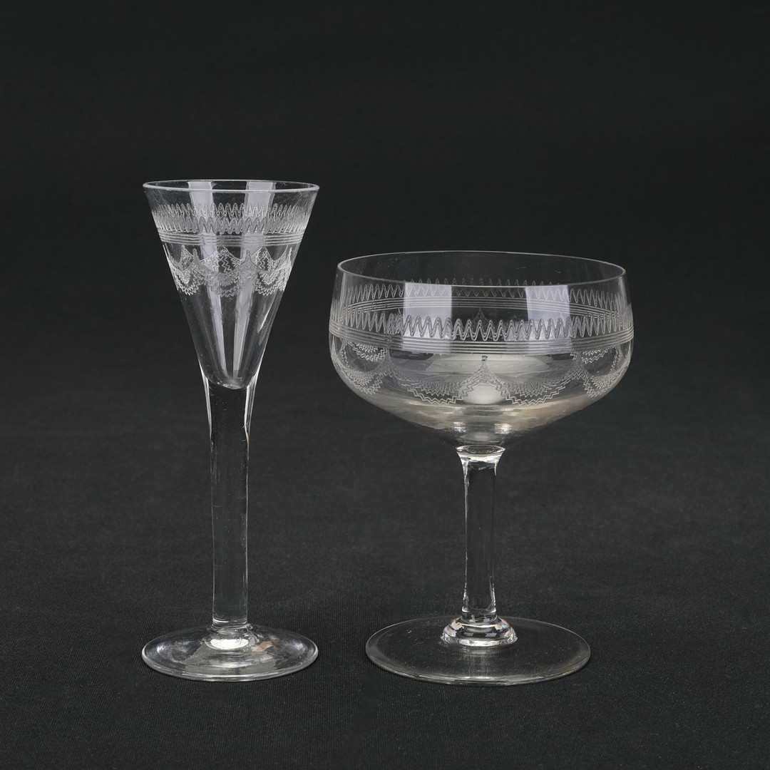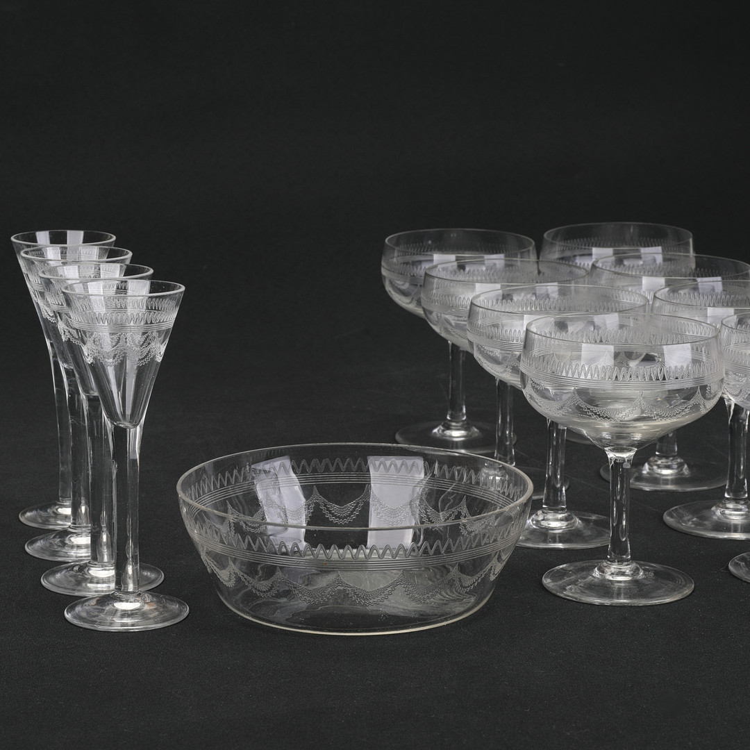 3268705. Dekorationsglas, 13 dele, ætset, første halvdel af det 20. århundrede.