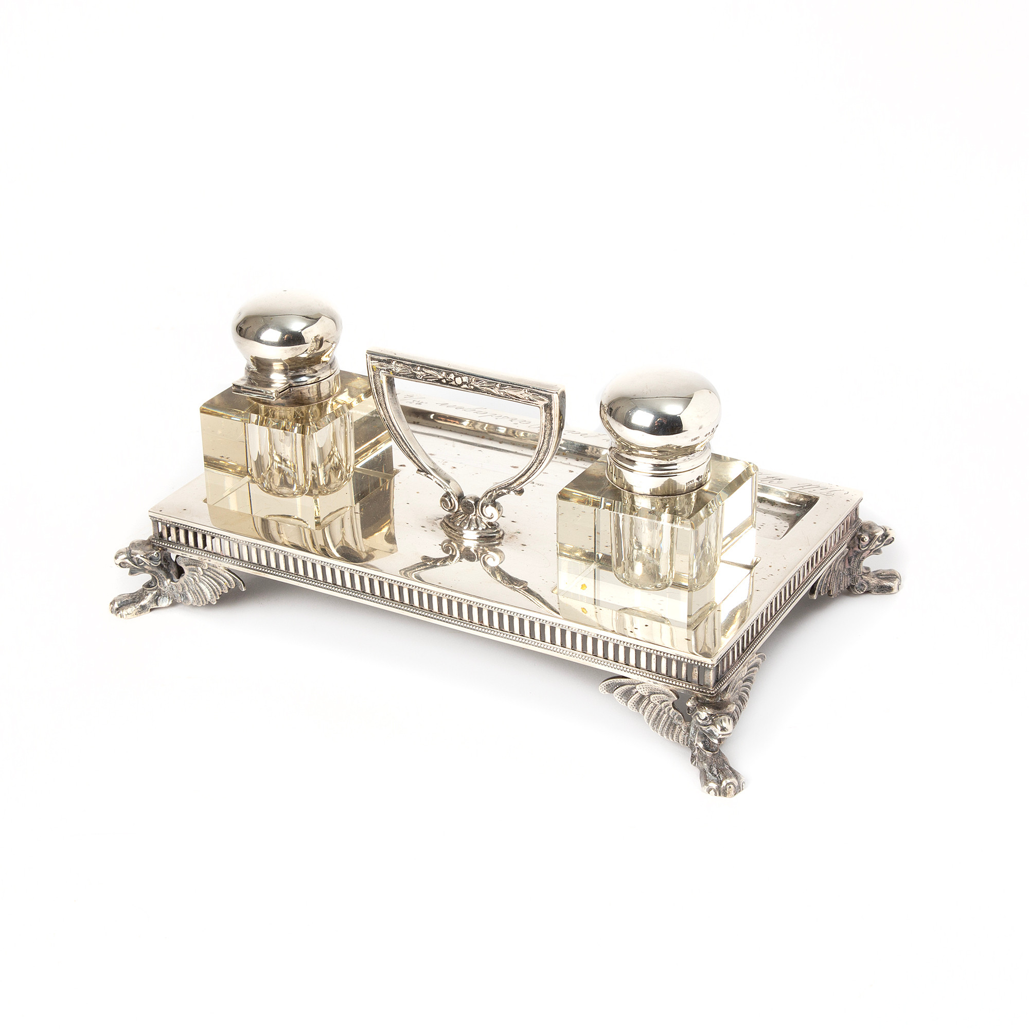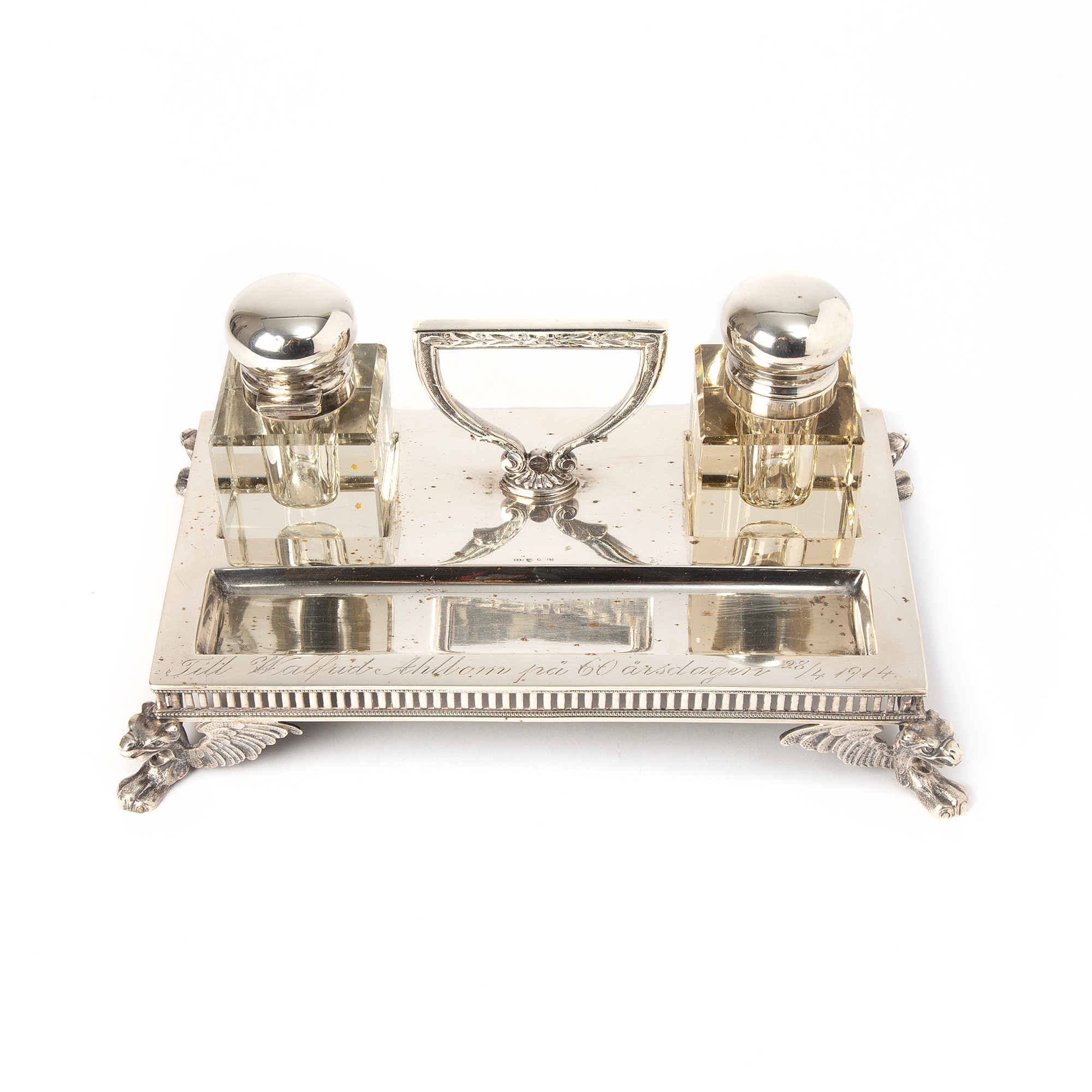 3275857. SKRIVEBORDSSÆT. Sølv og glas, GAB, 1913.