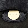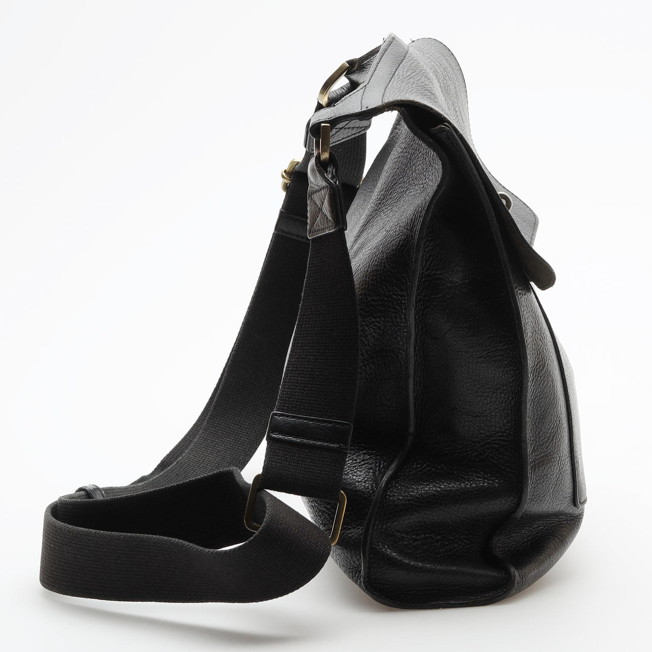 Sort læder med messingdetaljer, justerbar lærred skulderrem, yderlomme.