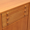 Fineret i teaktræ. Midterdel med tre skuffer og skabsdør nedenunder. Sider med dør.
