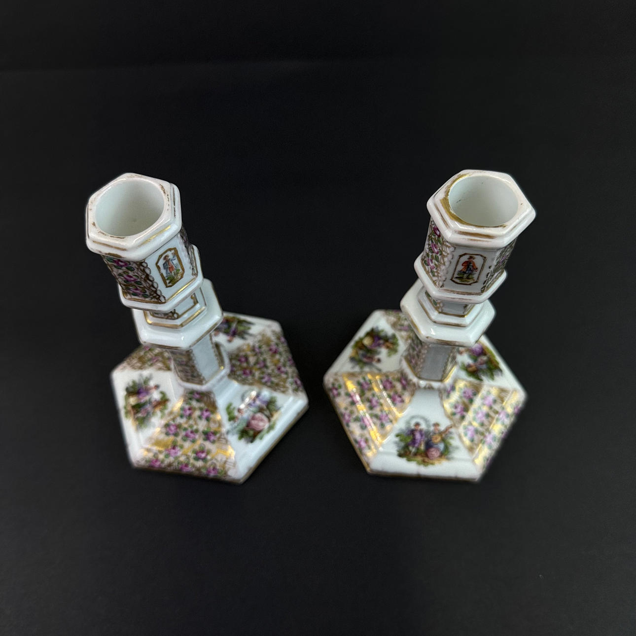 Fine lysestager, håndmalede Berlin porcelæn, 1800-tallet, H. 13,5 cm.