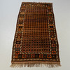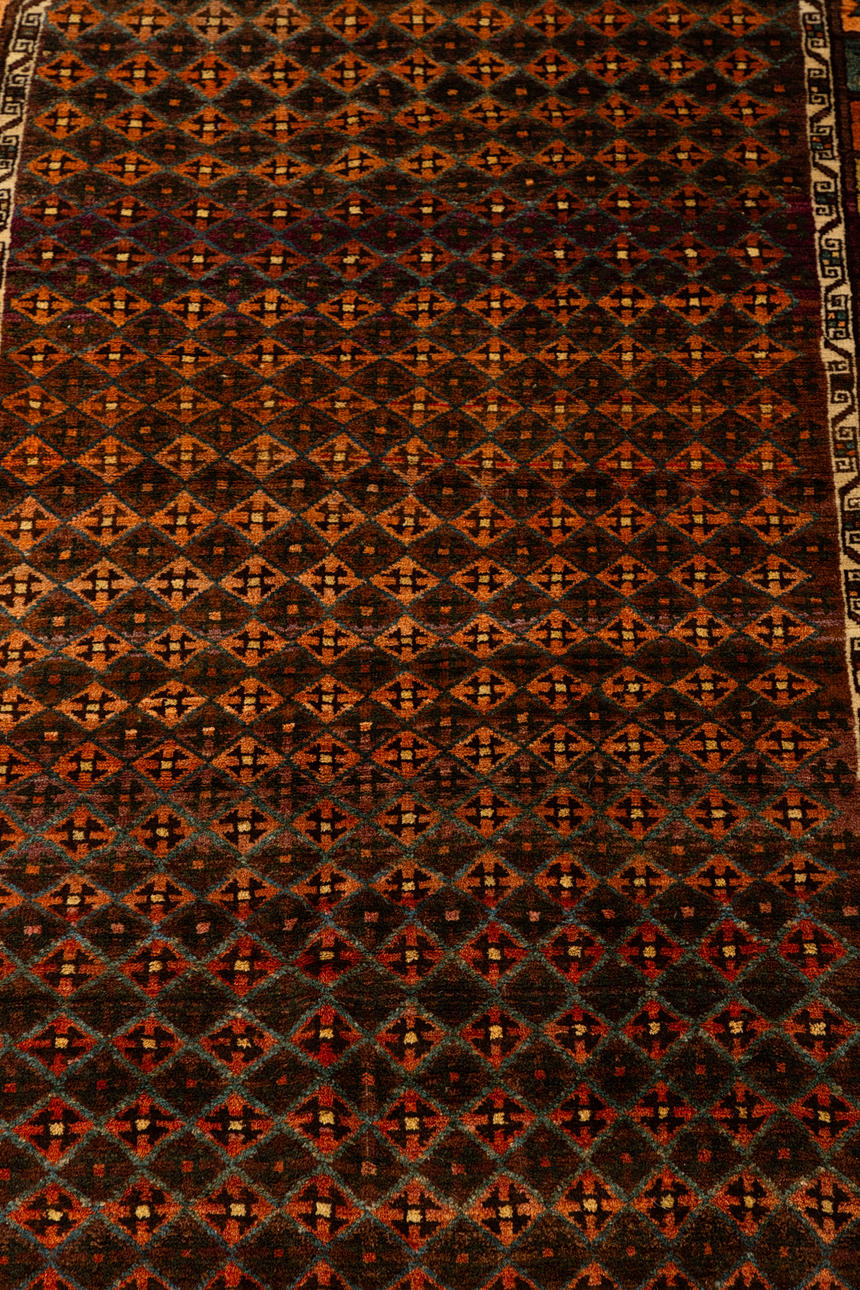 uld på uld. På en auberginefarvet baggrund, farvede göler struktureret i et diamantgitter i en mønstret peloton. Abrash L x B: 262 x 137 cm.