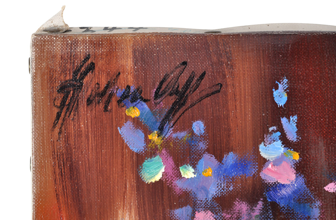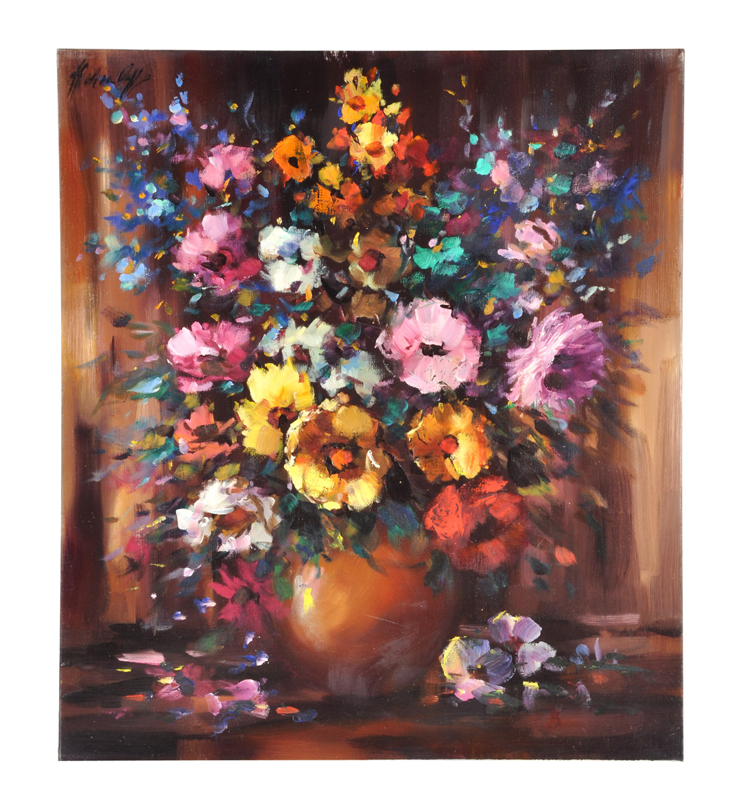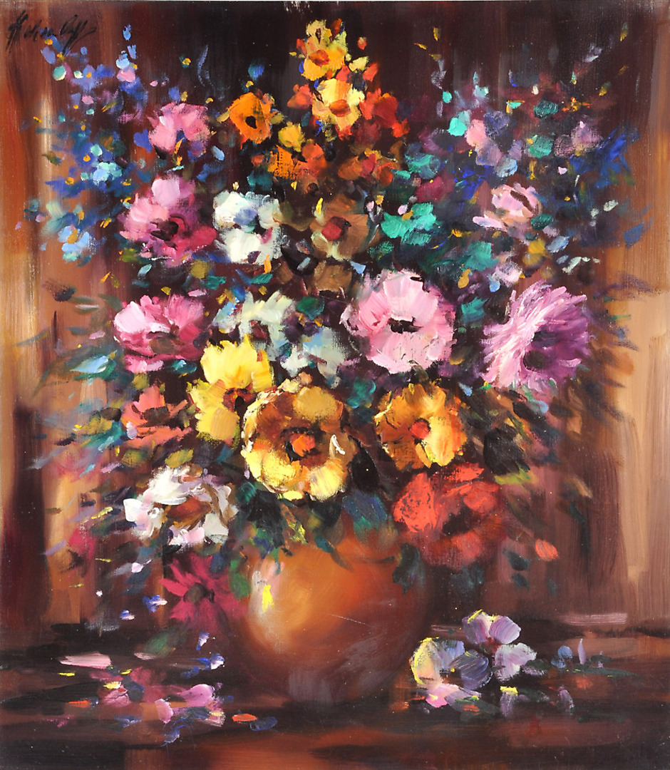 329585. SIGNIERT. Ekspressivt stilleben af sommerblomster.