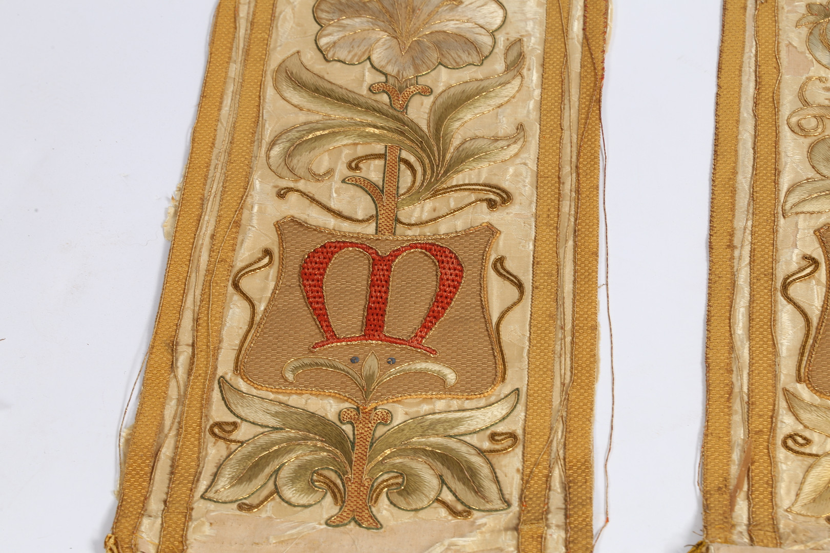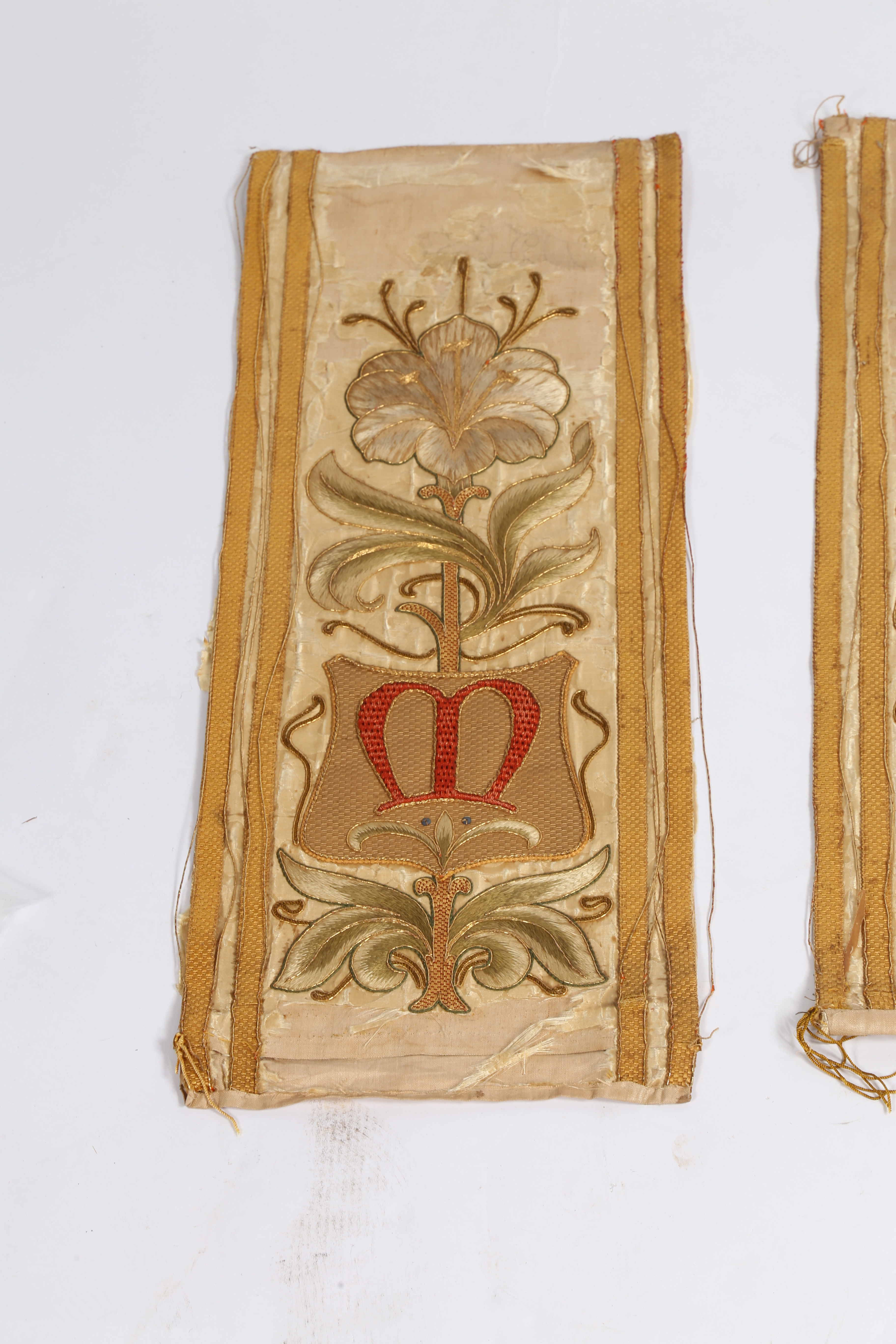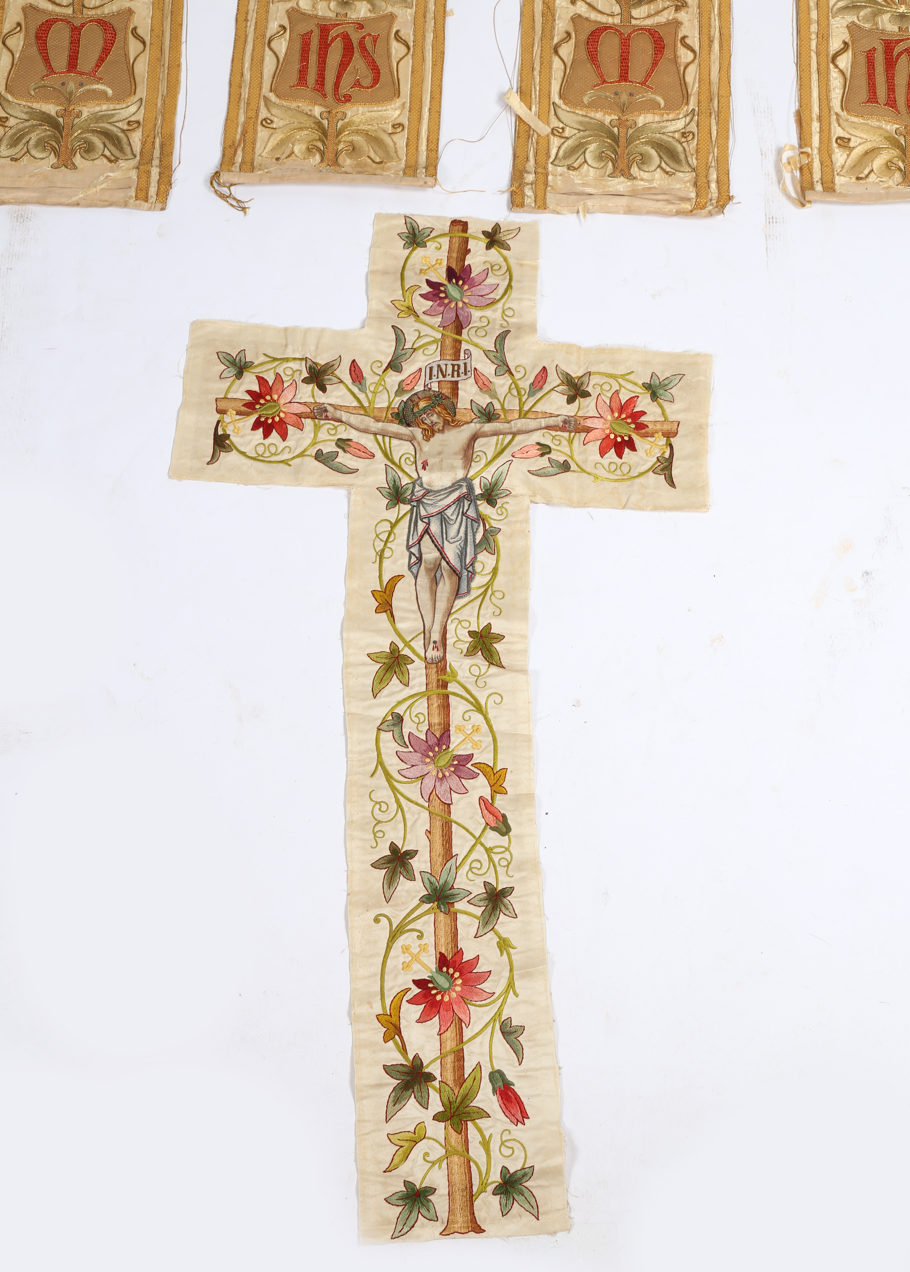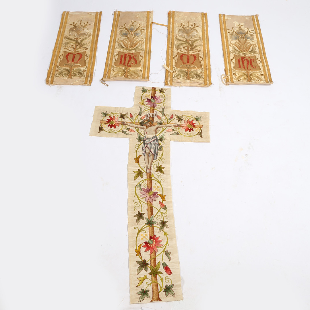 3298406. FIRE ROMERSK-KATOLSKE ALTER FRONTPANELER MED TRÅDBRODERI.