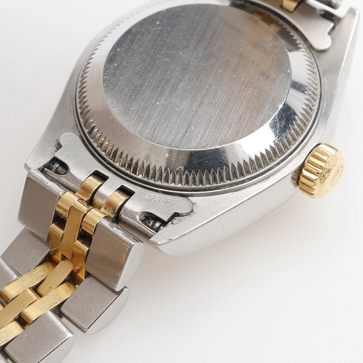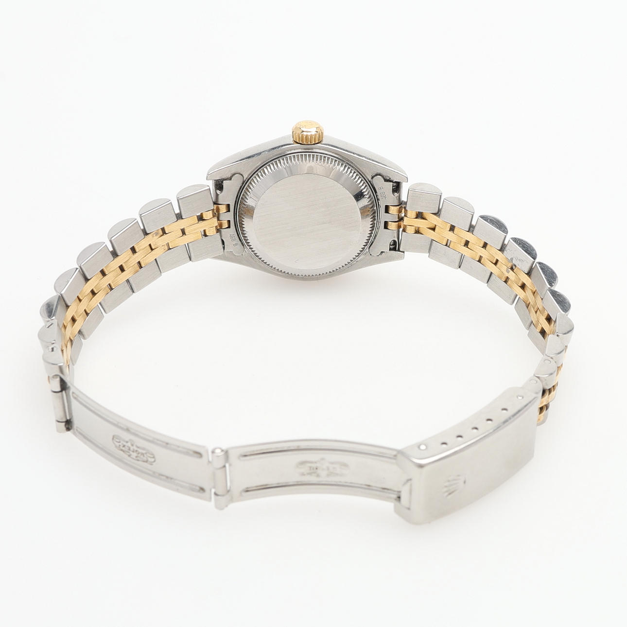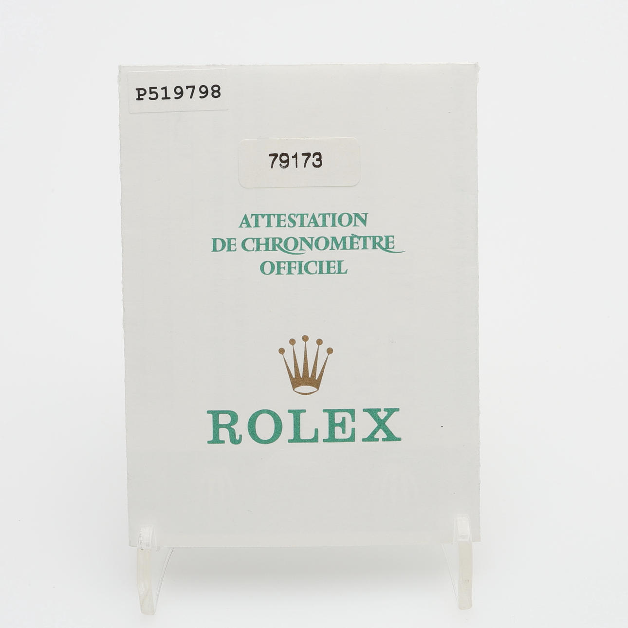 Datejust med etui og jubilæumsarmbånd i guld og stål. Automatisk tildeling med datofunktion. Referencenummer 79173, løbenummer P 519798. Armbånd referencenummer 62523D-18/468B.AB10. Med safirkrystal. Kasse, originalt certifikat og manual inkluderet. Fremstillet omkring 2000. Diameter 26 mm.