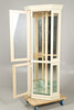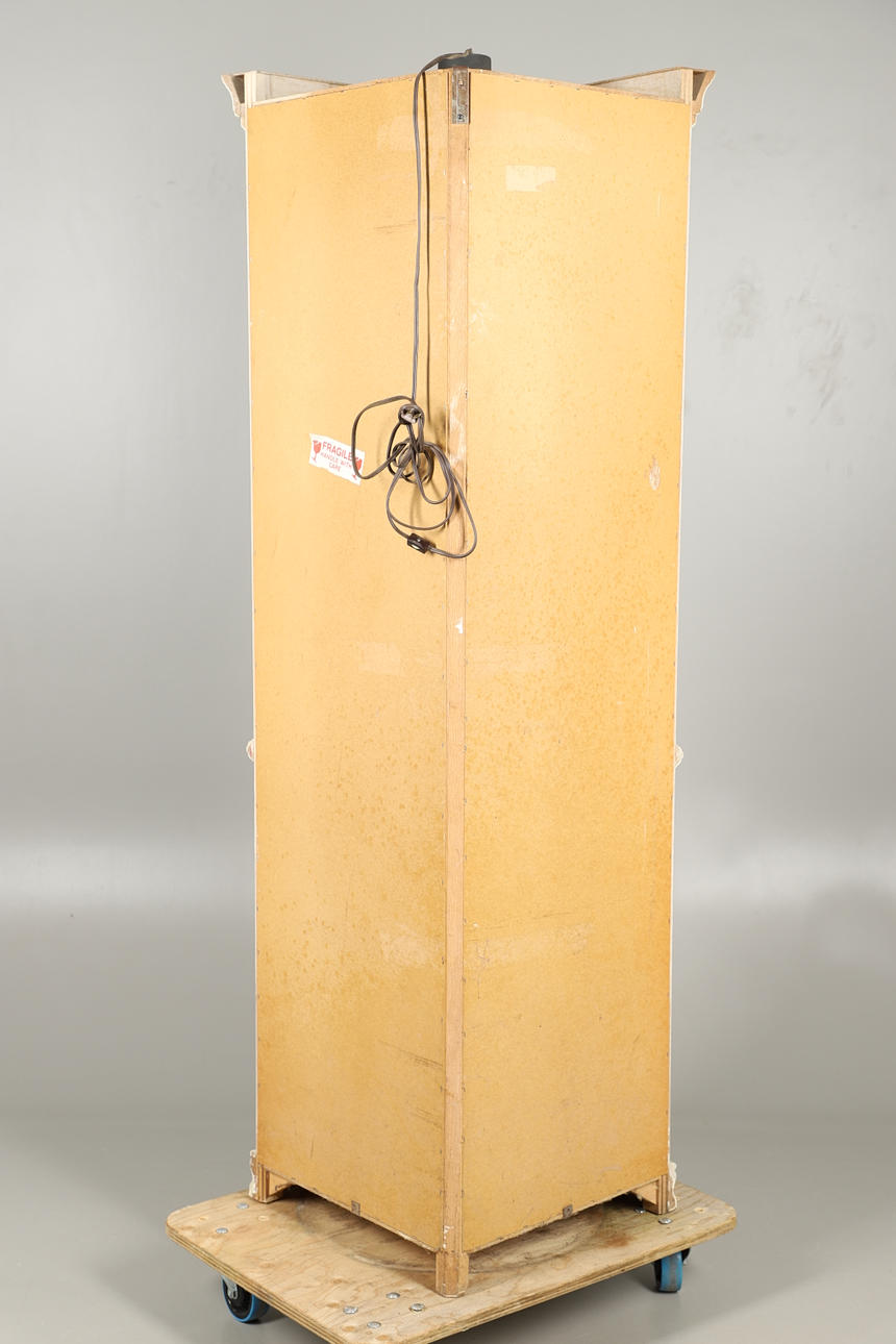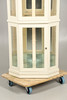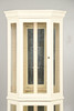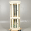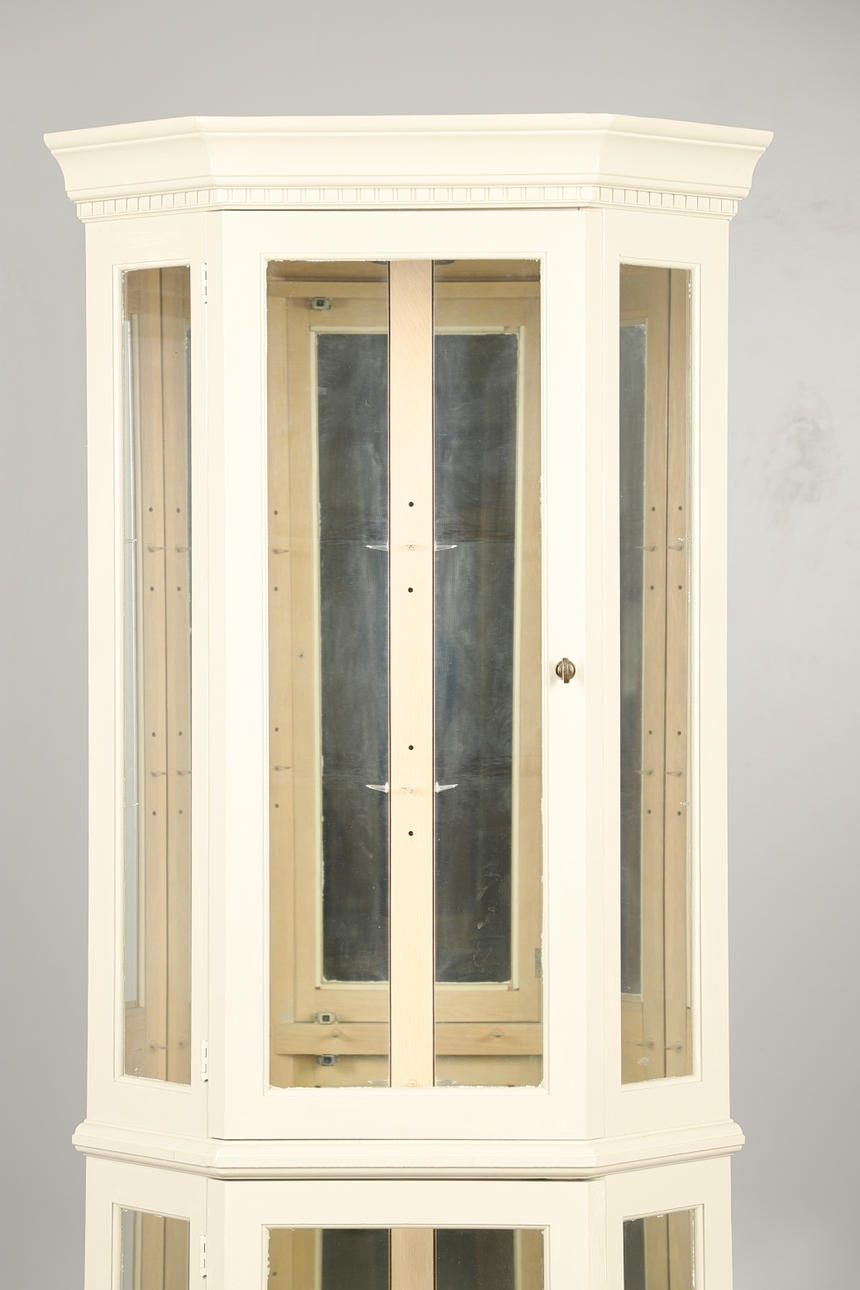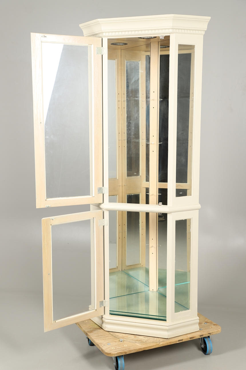 Femkantet hjørneformet malet karosseri med glasvinduer, og spejlet indeni, med fire justerbare glashylder og to adgangsdøre med metalhåndtag. Indvendigt toplys. Højde 185.5cm x Bredde 78cm x Dybde 56cm.