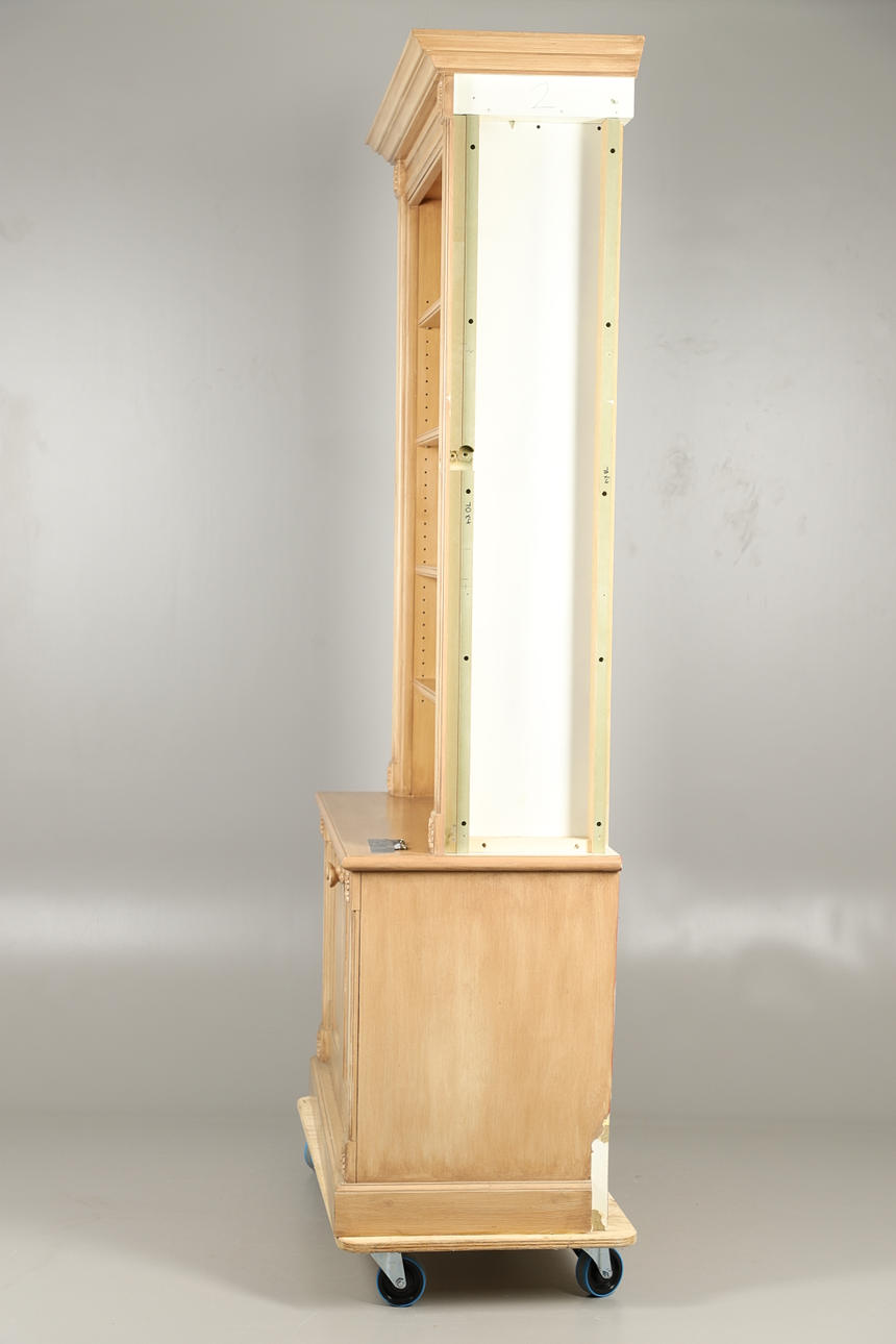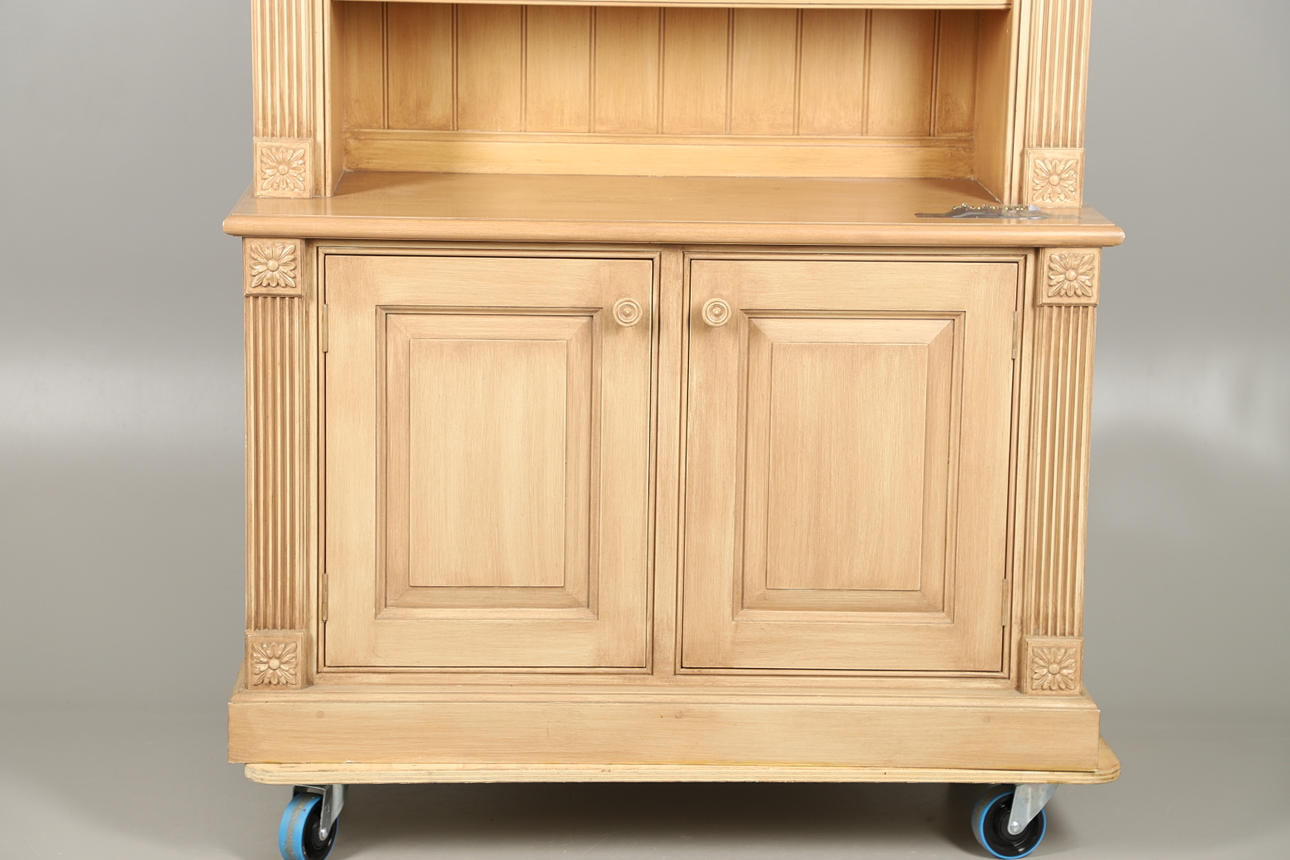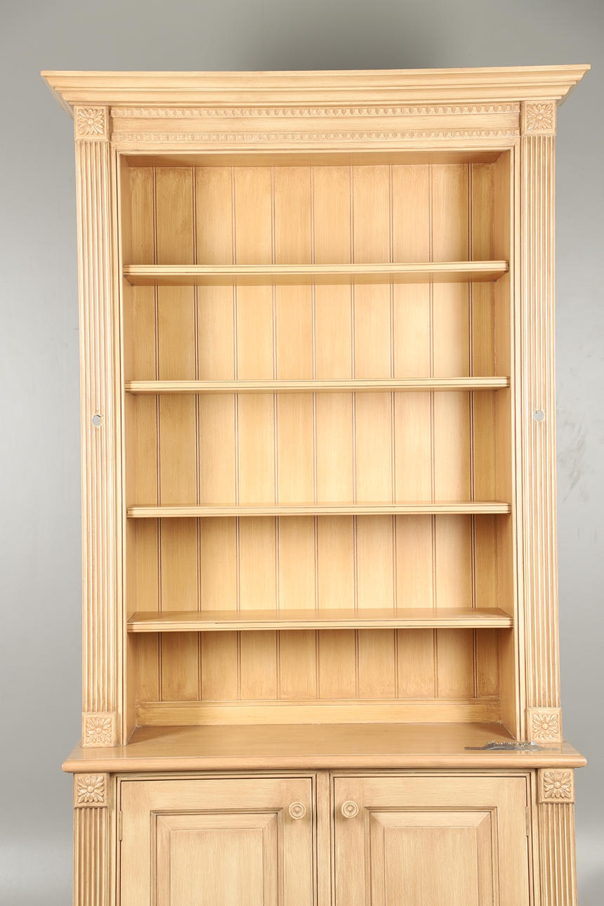Den nederste dobbeltdørs skabsenhed med enkelt indvendig hylde med bogreol på toppen, med fire justerbare hylder. Udskårne dekorative blomsterhjørnefirkanter og riflede sider. Yderligere fastgørelsesskruer medfølger. Højde 234cm x Bredde 127.5cm x Dybde 56cm.