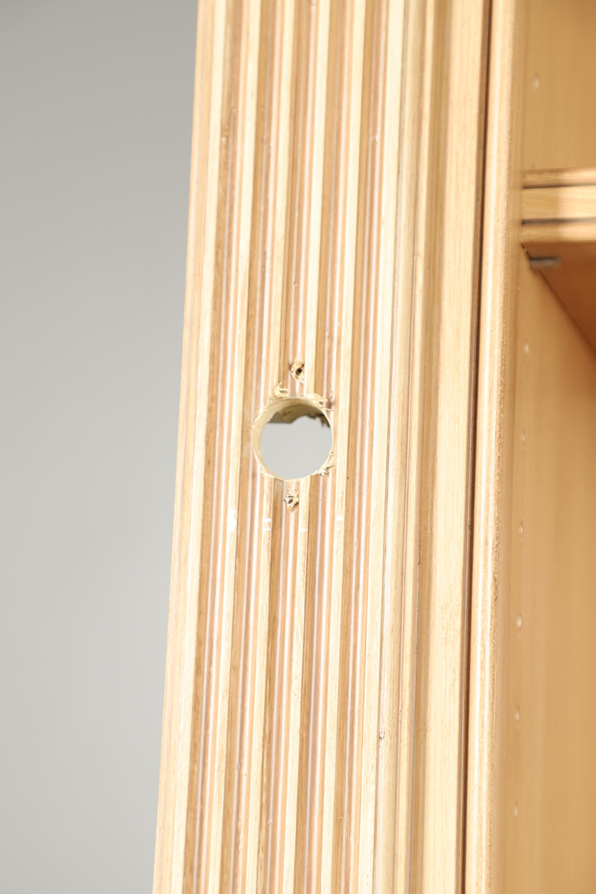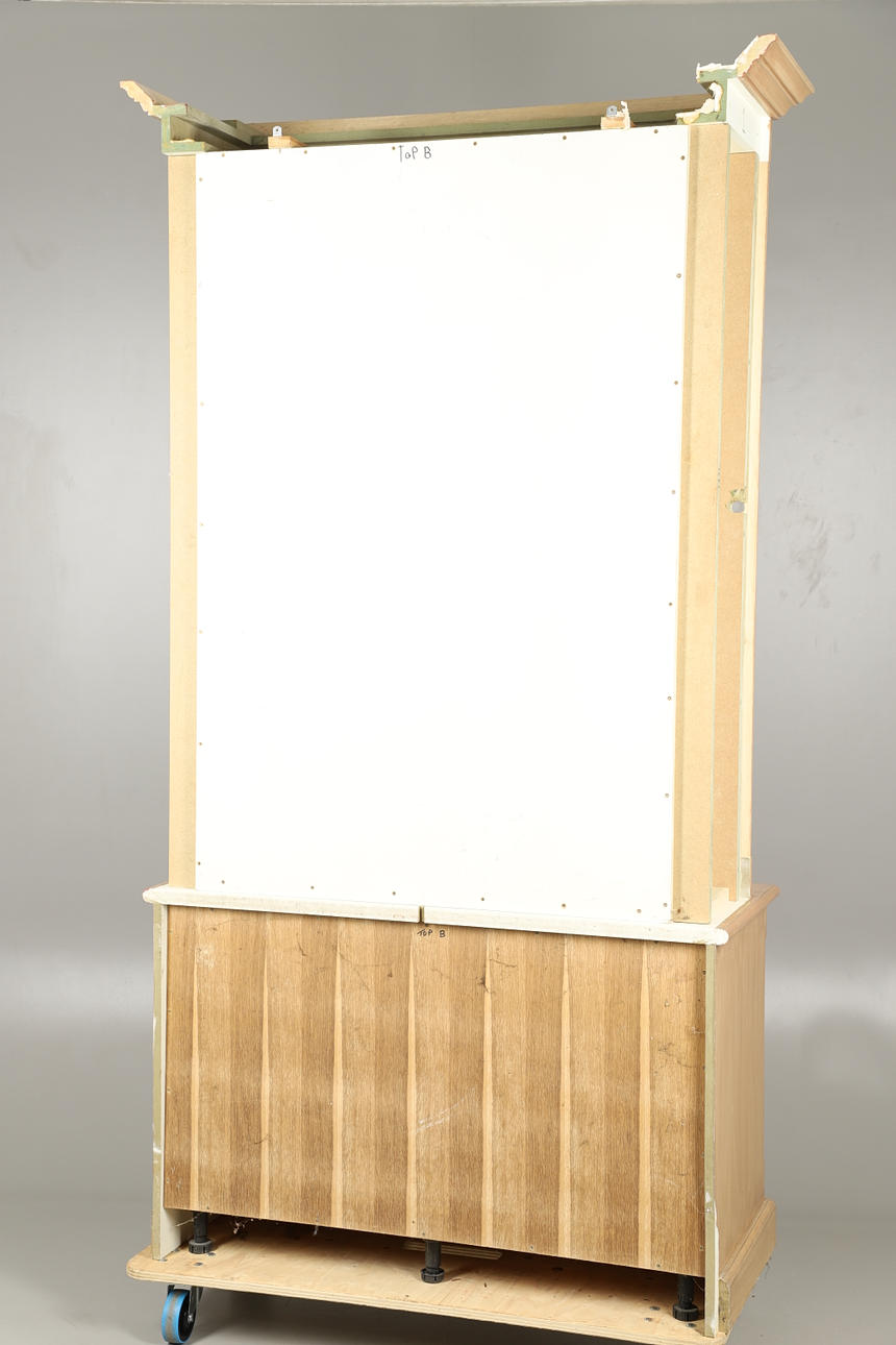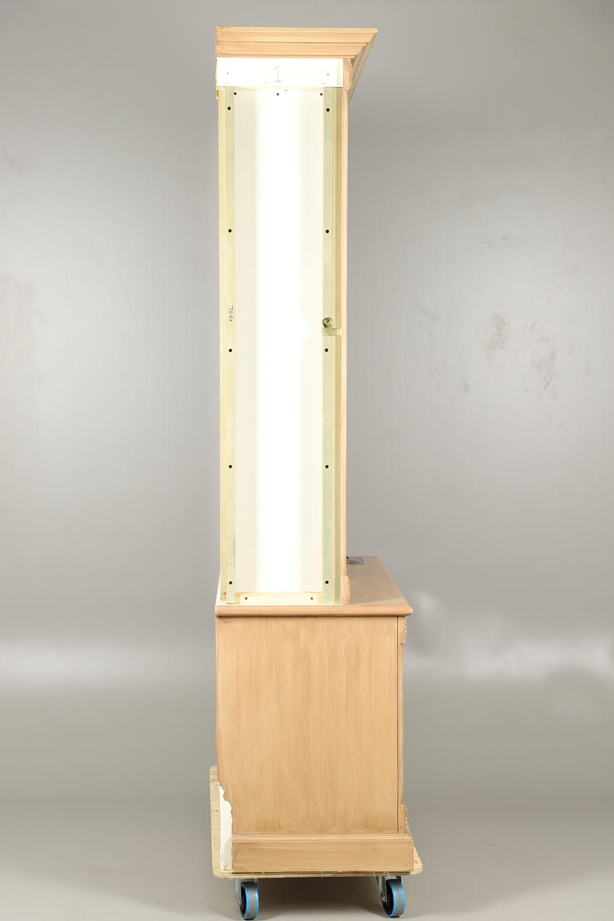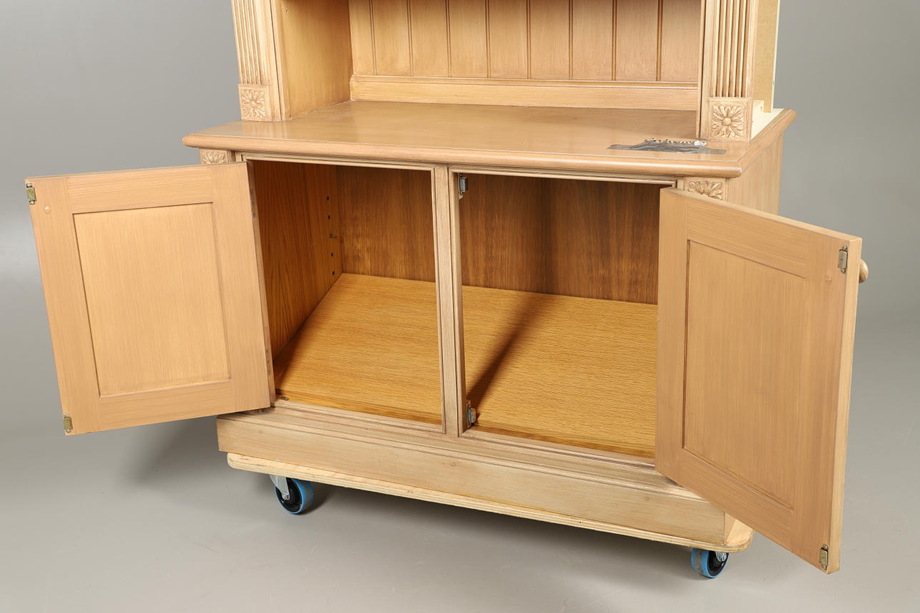 Den nederste dobbeltdørs skabsenhed med enkelt indvendig hylde med bogreol på toppen, med fire justerbare hylder. Udskårne dekorative blomsterhjørnefirkanter og riflede sider. Yderligere fastgørelsesskruer medfølger. Højde 234cm x Bredde 127.5cm x Dybde 56cm.