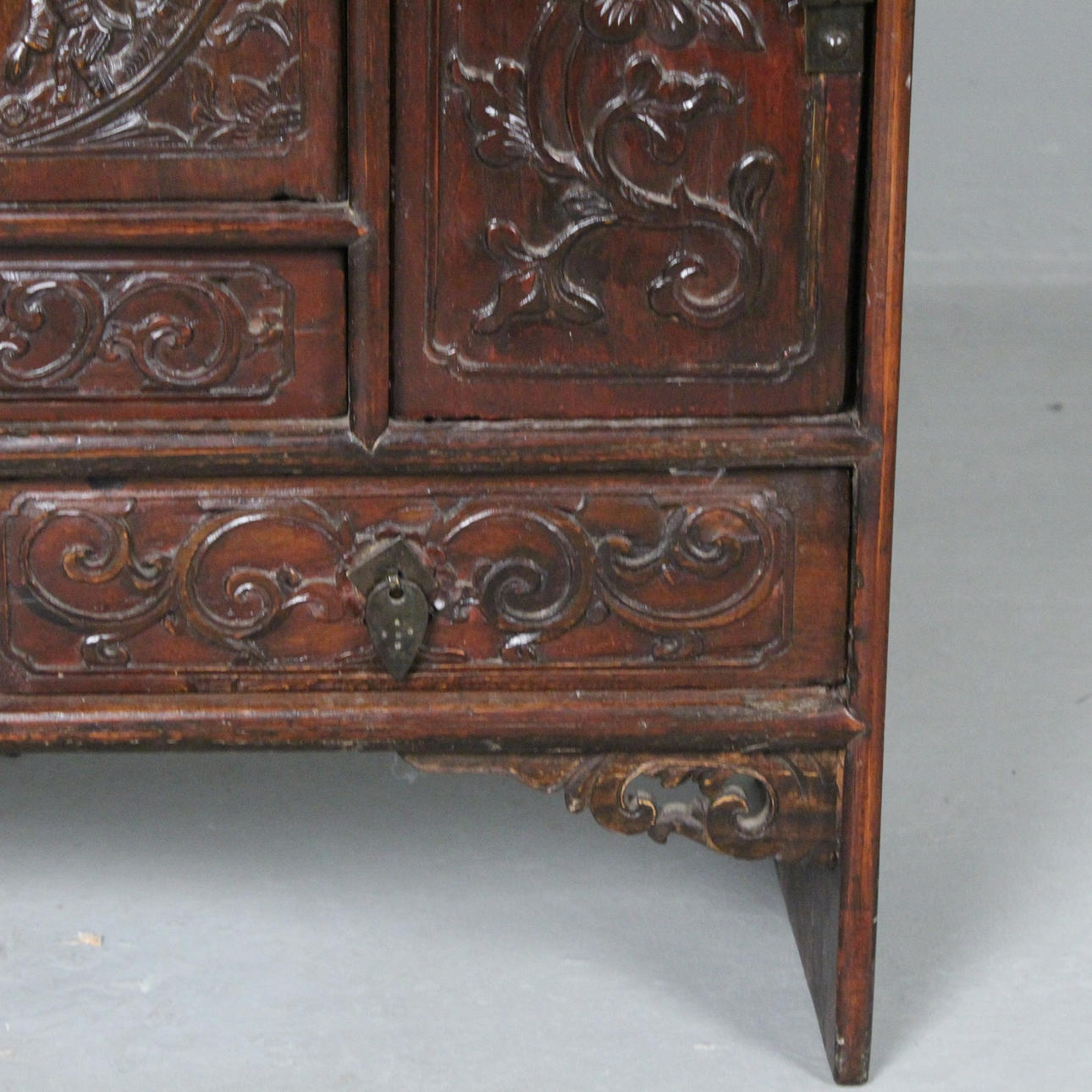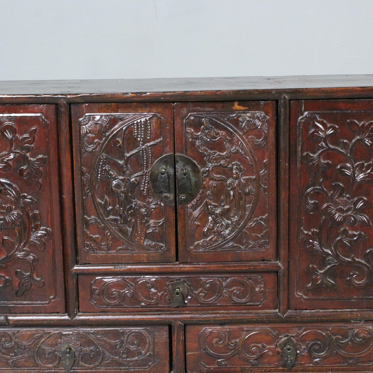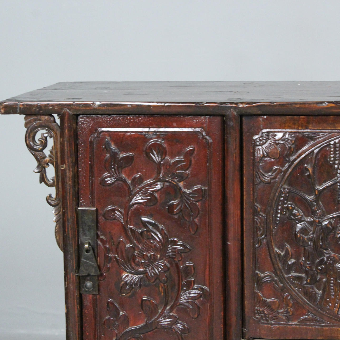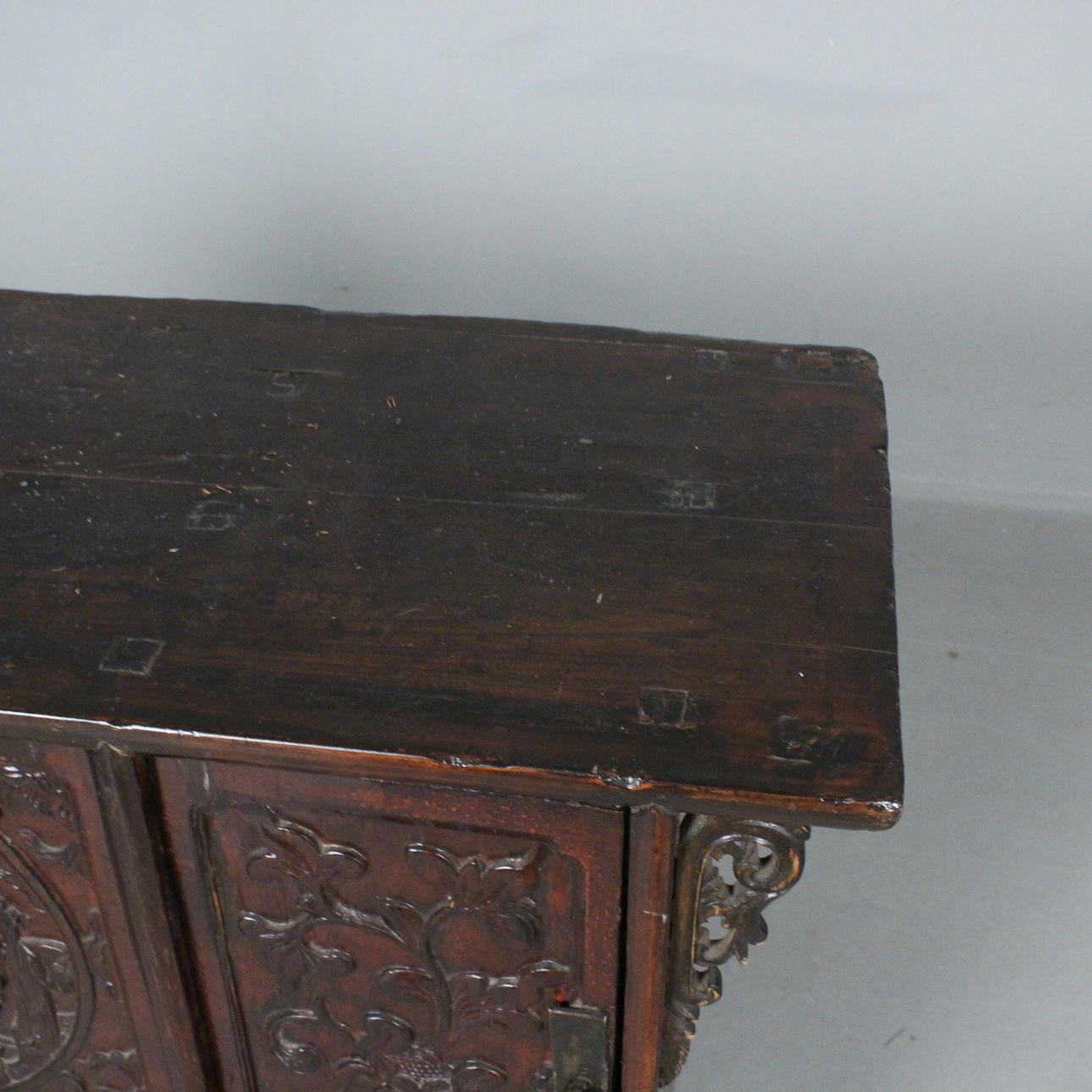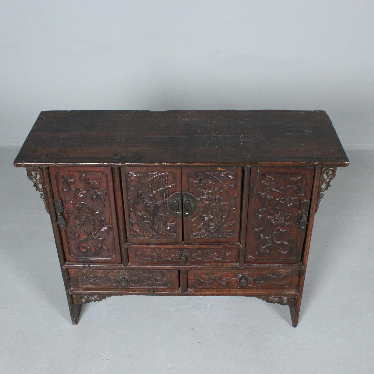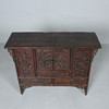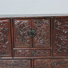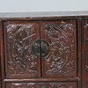 Antik kinesisk konsol/kommode med tre døre, lavet af træ, mørk glaseret og dekoreret med udskæringsdekoration,