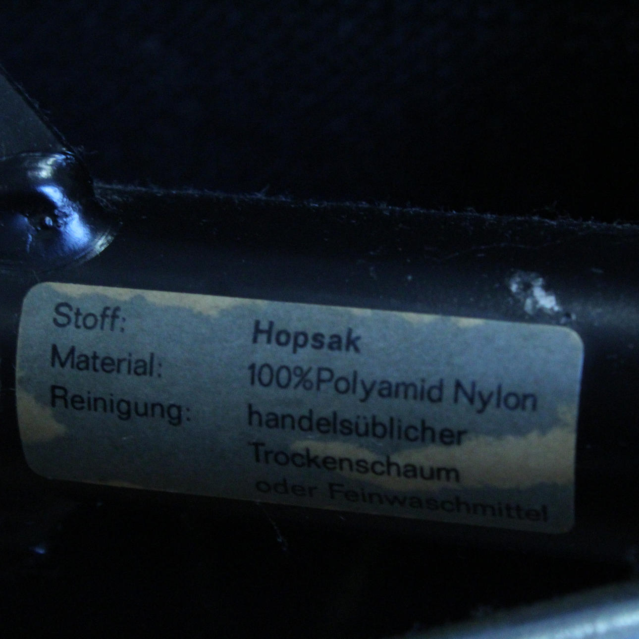 Version med sort Hopsack-dæksel og forkromet aluminiumsramme, drejelig 5-stjernet base på hjul, med producentens etiket,